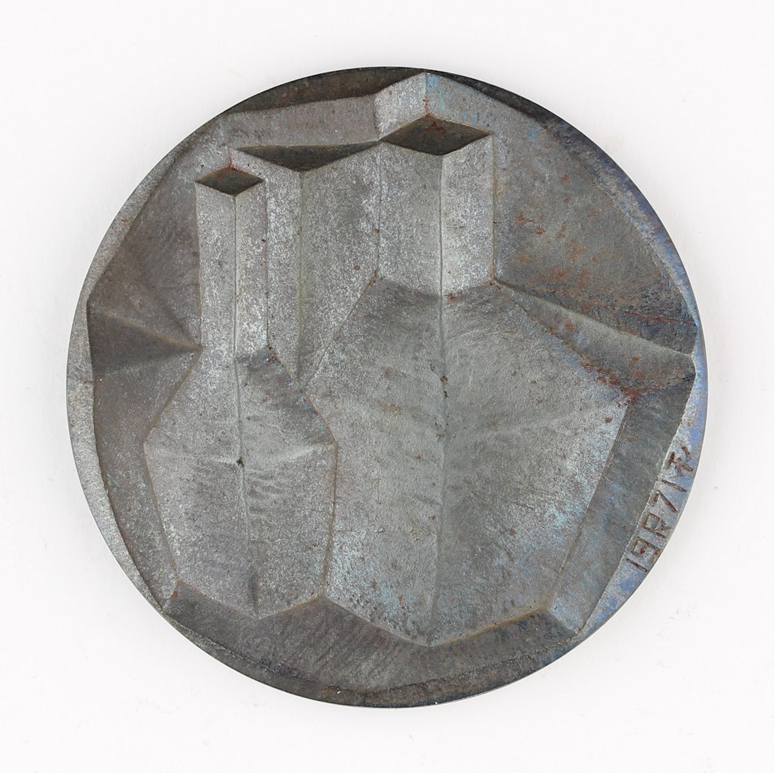 De beeldhouwer Wevers die zijn opleiding in Oostenrijk kreeg heeft een voorkeur voor harde materialen. Hij werkt graag in ijzer en sneed zijn penning 'Hoekig en rond' in dat element en het werd door Begeer in dat zelfde metaal geslagen. Het eerste stilleven dat de Vereniging uitgaf. De weerbarstigheid van het materiaal wordt zichtbaar in de structuur van de huid; de vormen geven zich met moeite prijs. Flessen en vaten die men zich gewoonlijk als rond voorstelt zijn hoekig geworden. Een goed gevoel voor ruimtelijkheid spreekt uit het ontwerp, een thema dat in de beeldhouwkunst opkwam bij Magnelli, Brancusi, Picasso, Lipschitz en Laurens in het tweede decennium van de twintigste eeuw. Door Rodin was duidelijk geworden dat objecten een waarde op zichzelf kunnen hebben in de beeldhouwkunst; dat was voor die tijd voorbehouden aan de schilderkunst. IJzer is altijd gezien als een materiaal voor wapens of gewone gebruiksvoorwerpen en sinds de negentiende eeuw zo ongeveer synoniem geworden met industrie. Gonzalez en Picasso bewezen dat het materiaal ook op artistiek gebied eindeloos veel mogelijkheden biedt. Op die gedachte is voortgebouwd door onder anderen Smith en Caro, in Nederland door Visser, Mooy en Volten. 'Zwaarden omsmeden tot ploegscharen' was het motto; de zachtheid van de rondingen op de keerzijde die aan fruit doet denken is de artistieke afgeleide van deze vruchtbare gedachte. #Louk Tilanus, Handzame Sculptuur