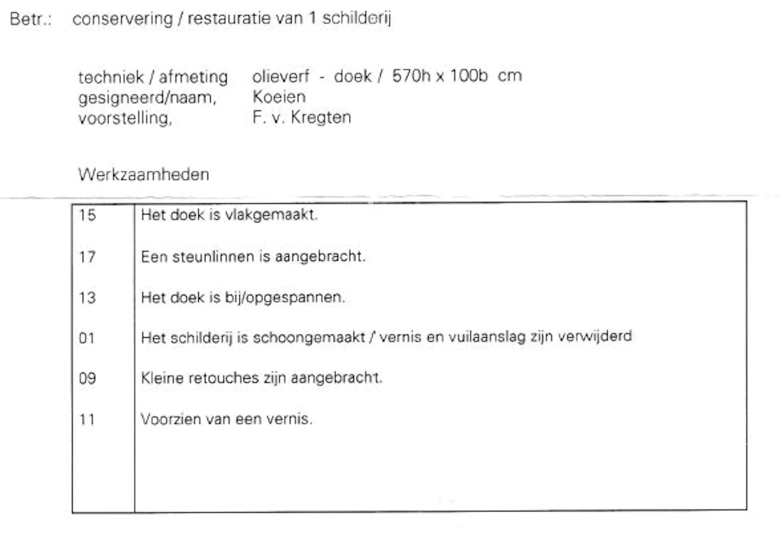 Het vertoont weliswaar craquelé maar is in 2002 door een erkend restaurateur gerestaureerd en geconserveerd. Het doek is vlakgemaakt, er is een steunlinnen aangebracht en is bij/opgespannen. Het is schoongemaakt / vernis en vuilaanslag zijn verwijderd en er zijn kleine retouches aangebracht. Als laatste voorzien van een vernis. Originele factuur van de restauratie kan bij het schilderij overhandigd worden.