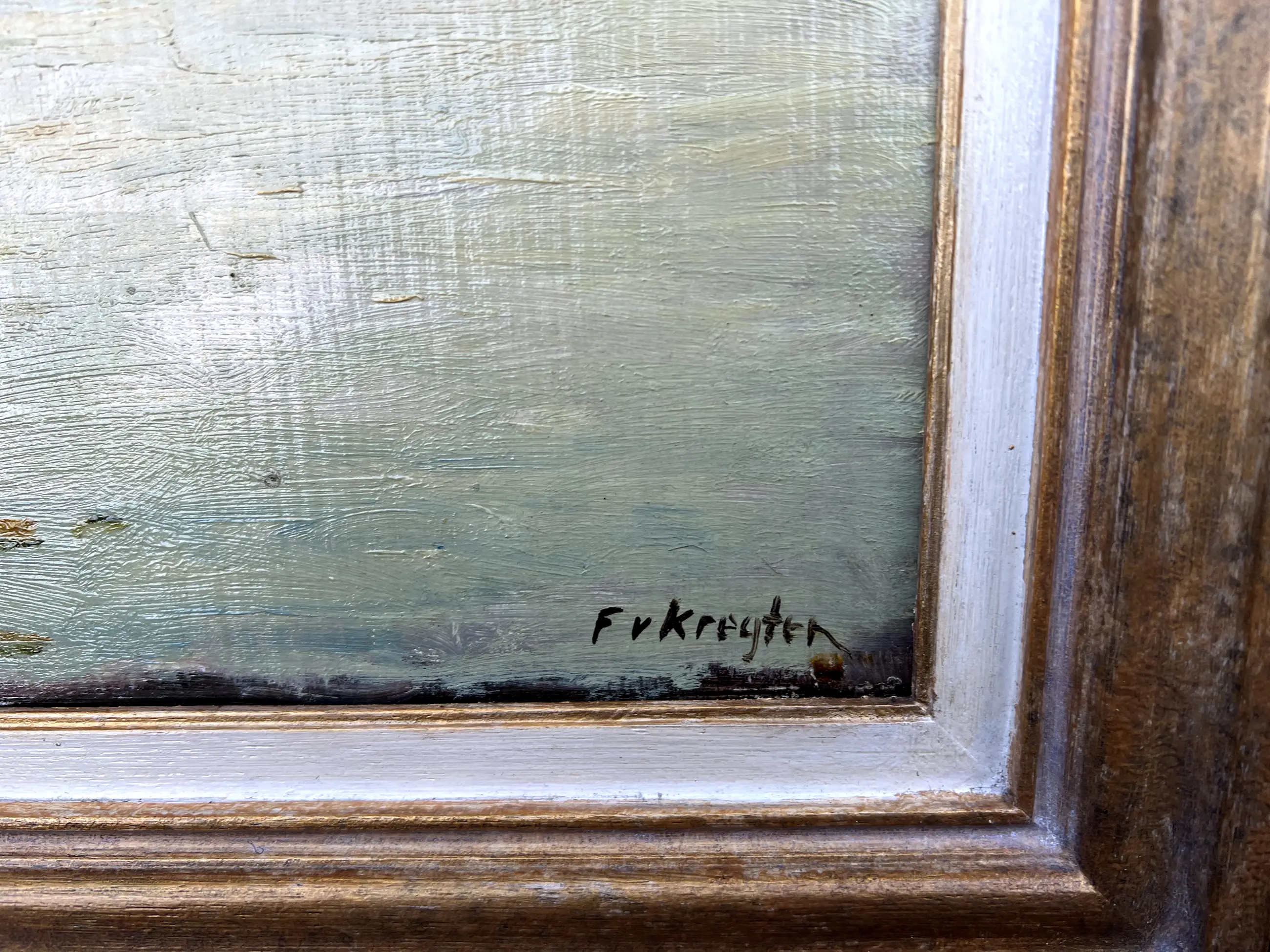 Leuk werkje van Fedor van Kregten, koeien langs het water. Olieverf op doek op board boardmaat 52 bij 38 cm, maat inclusief nieuwe handvervaardigde galerielijst is 61 bij 47,5 cm.