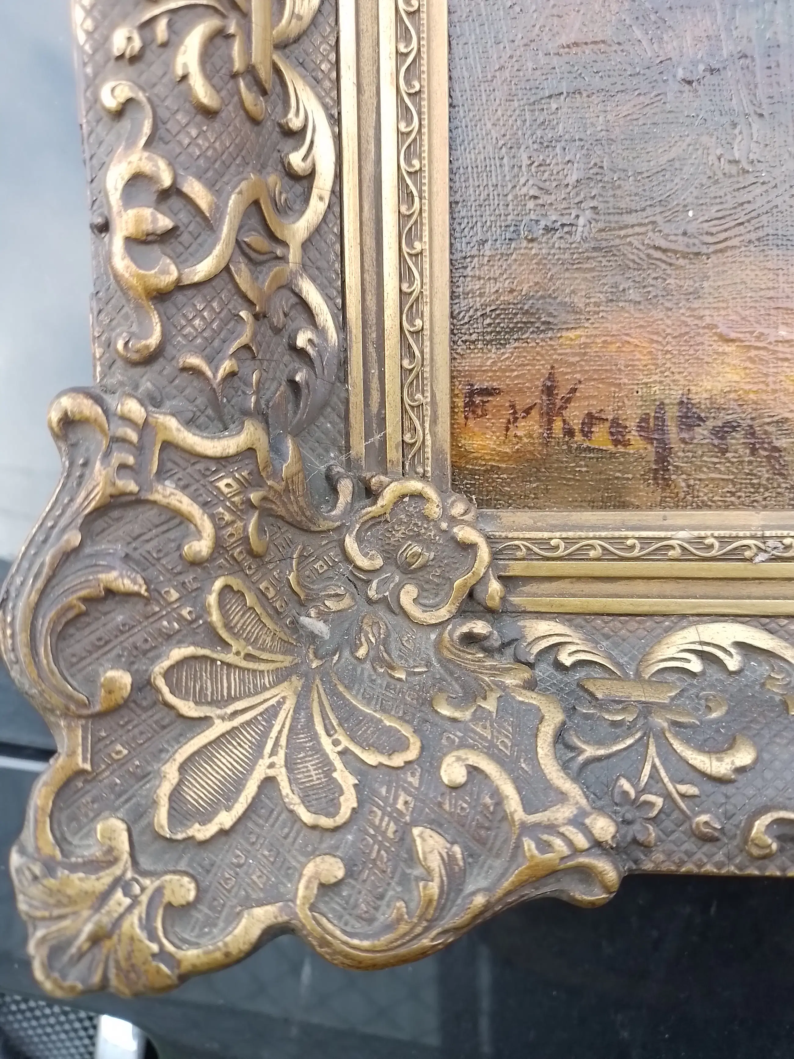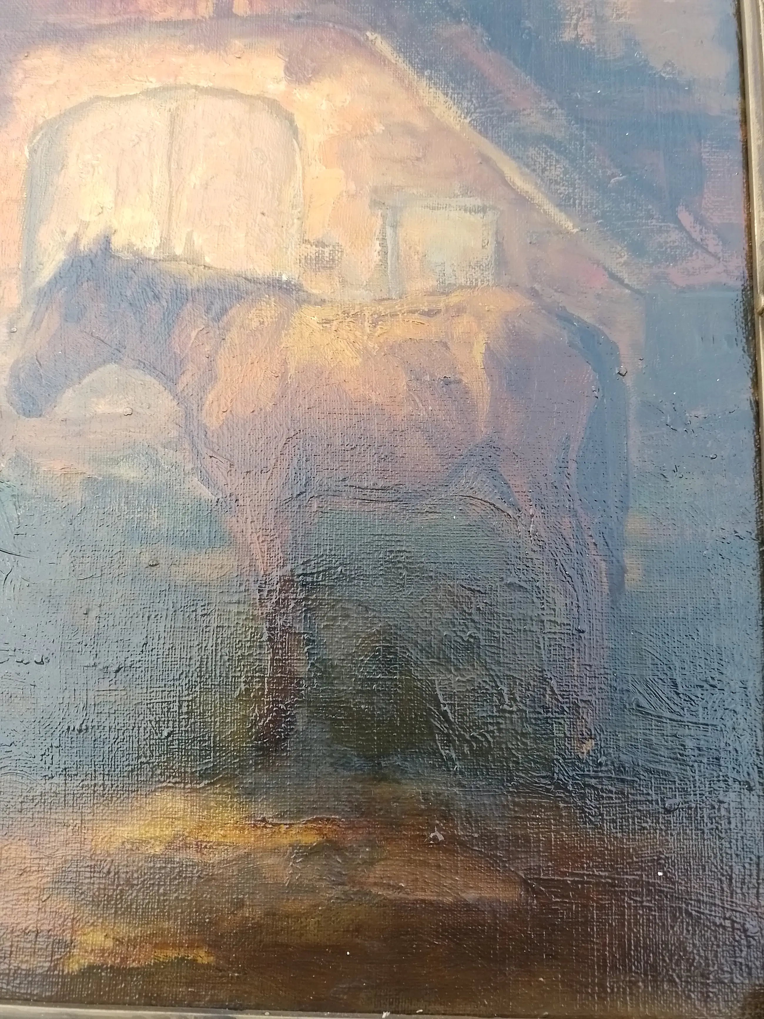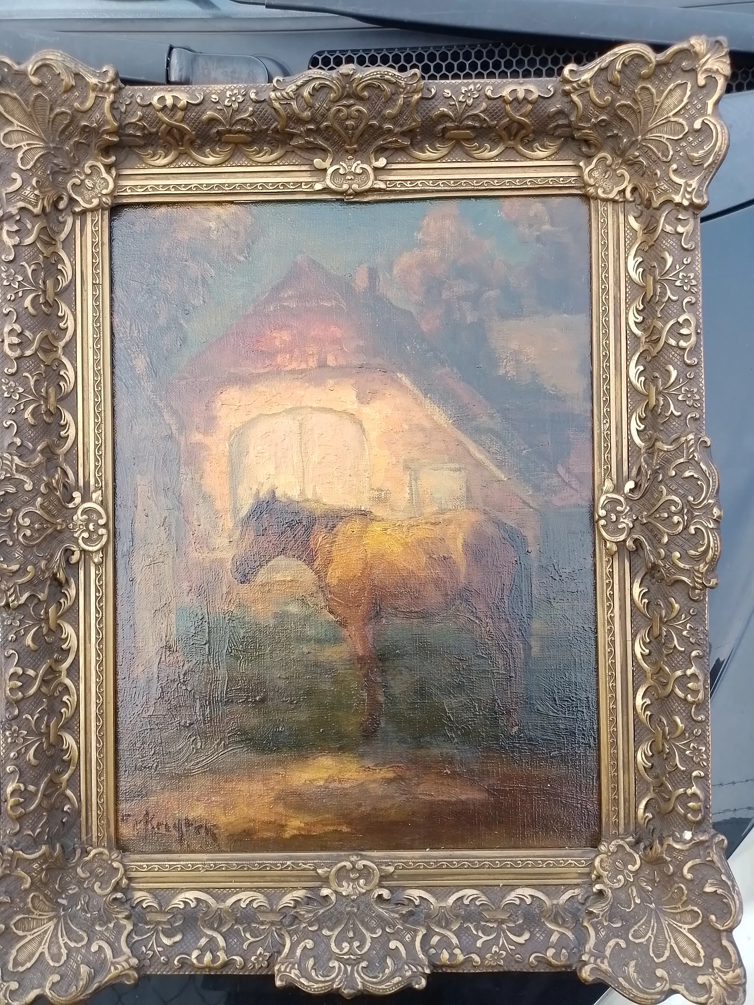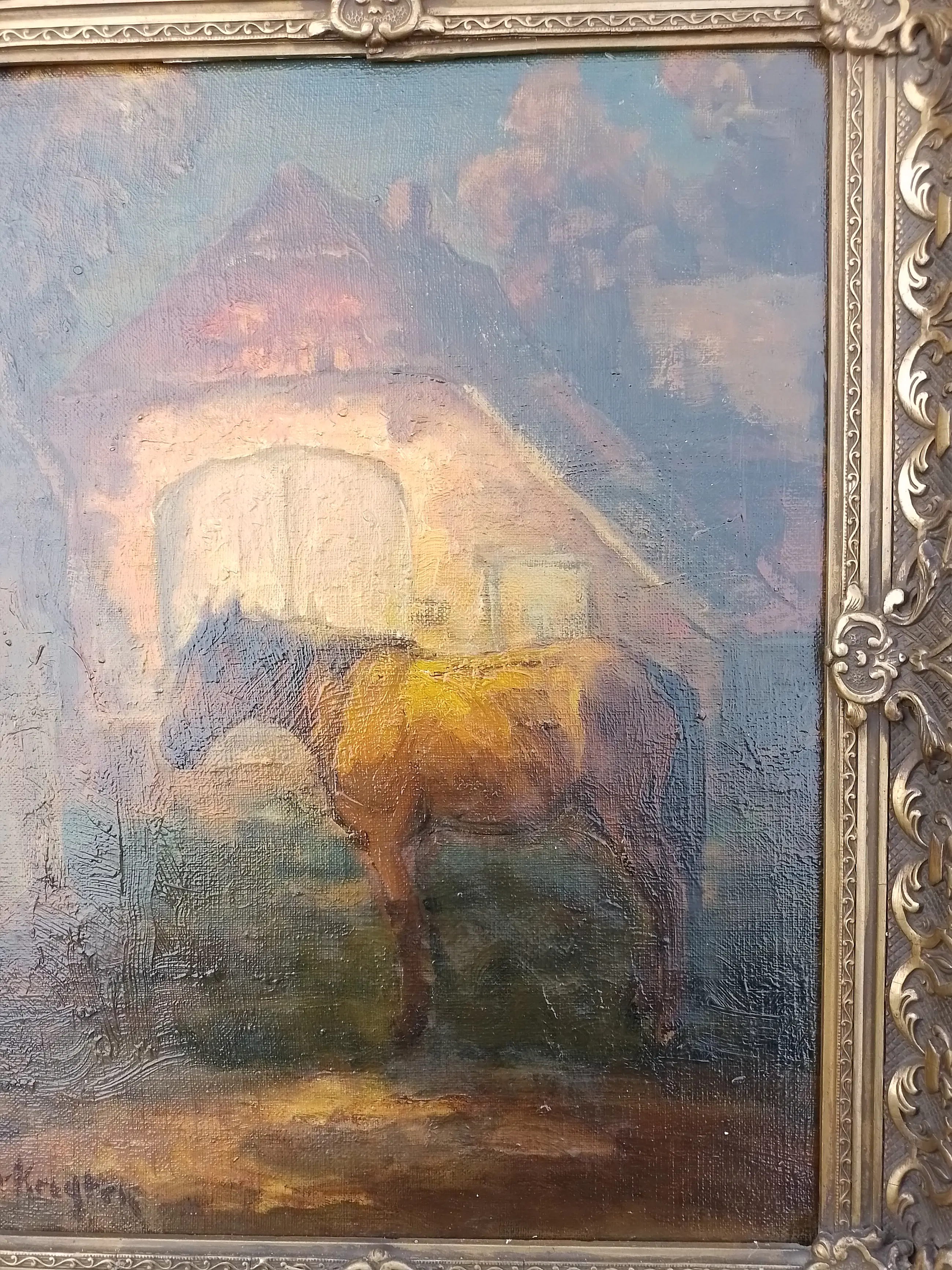 Mooi olieverf op linnen, doekmaat 30bij 40 cm,paard voor verlichte stal. Gesigneerd F van Kregten,meester van beesten,in de monografie staan diverse paardeschilderijen. Provenance Derksen veiling Arnhem. Goede staat,mooie lijst.