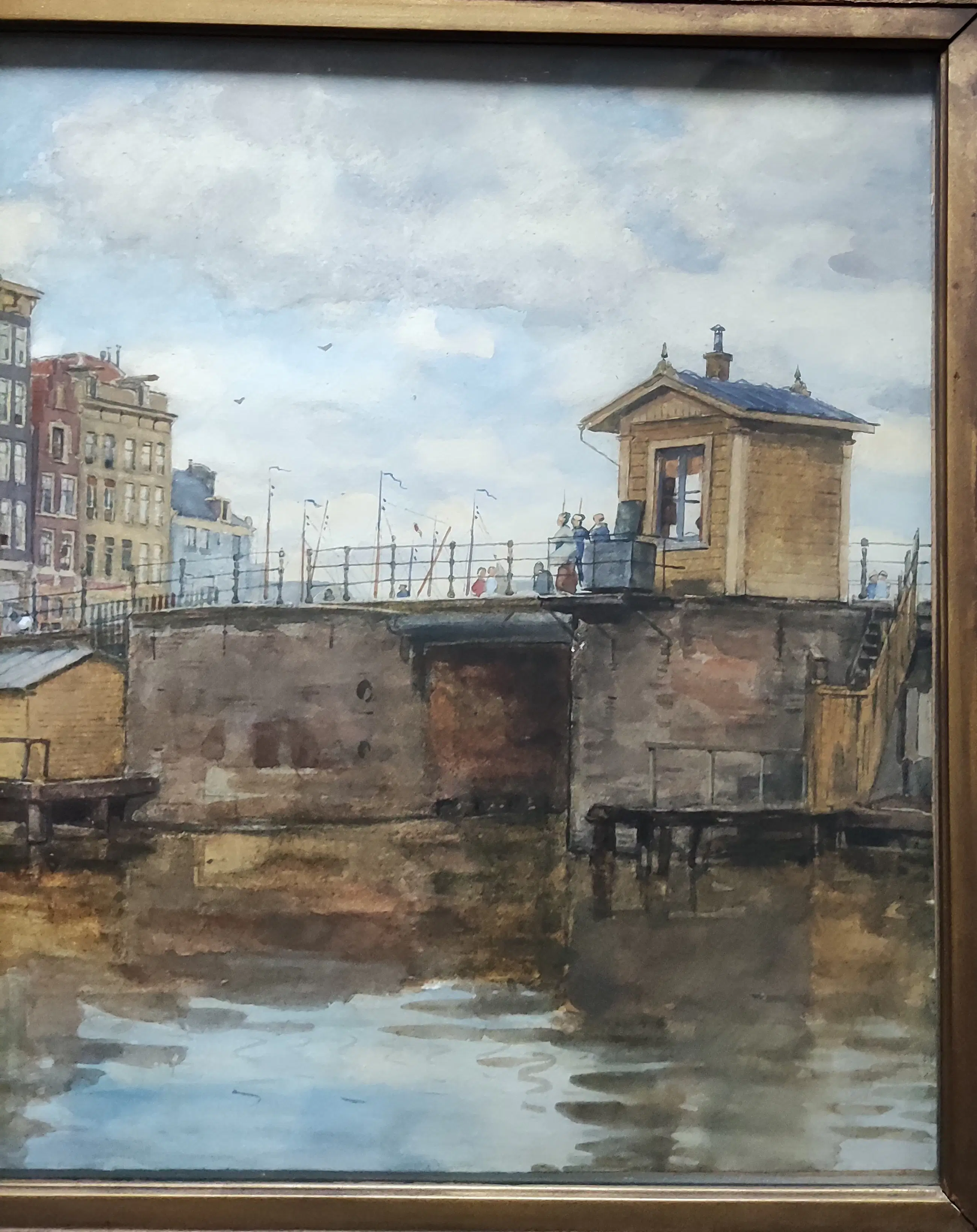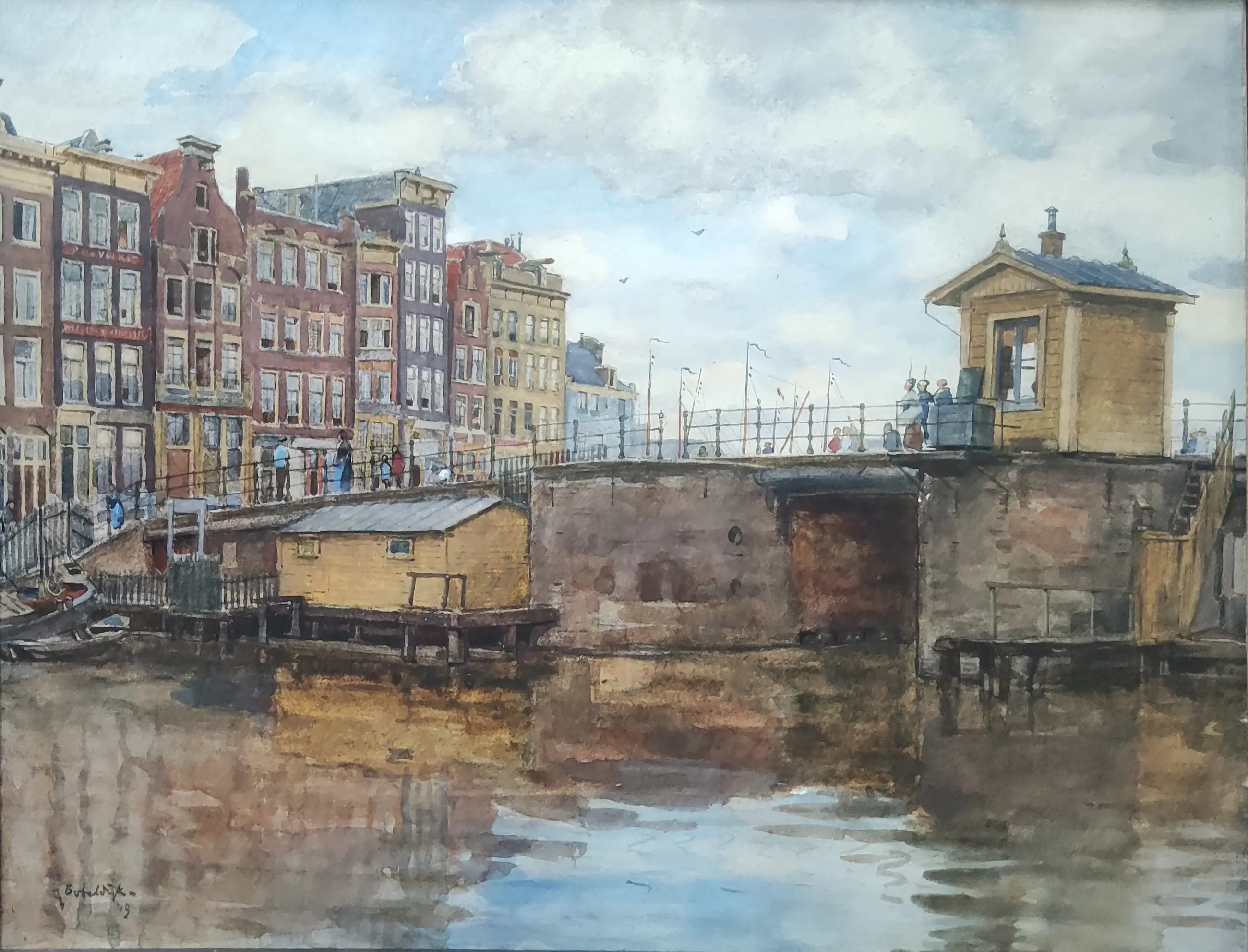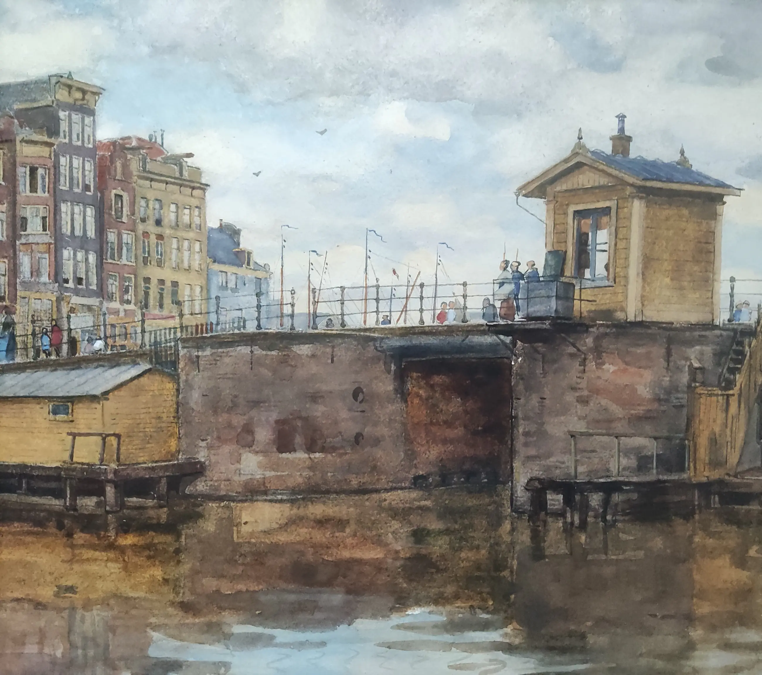 Zeer fraaie aquarel met een zicht op de Kraansluis te Amsterdam.
