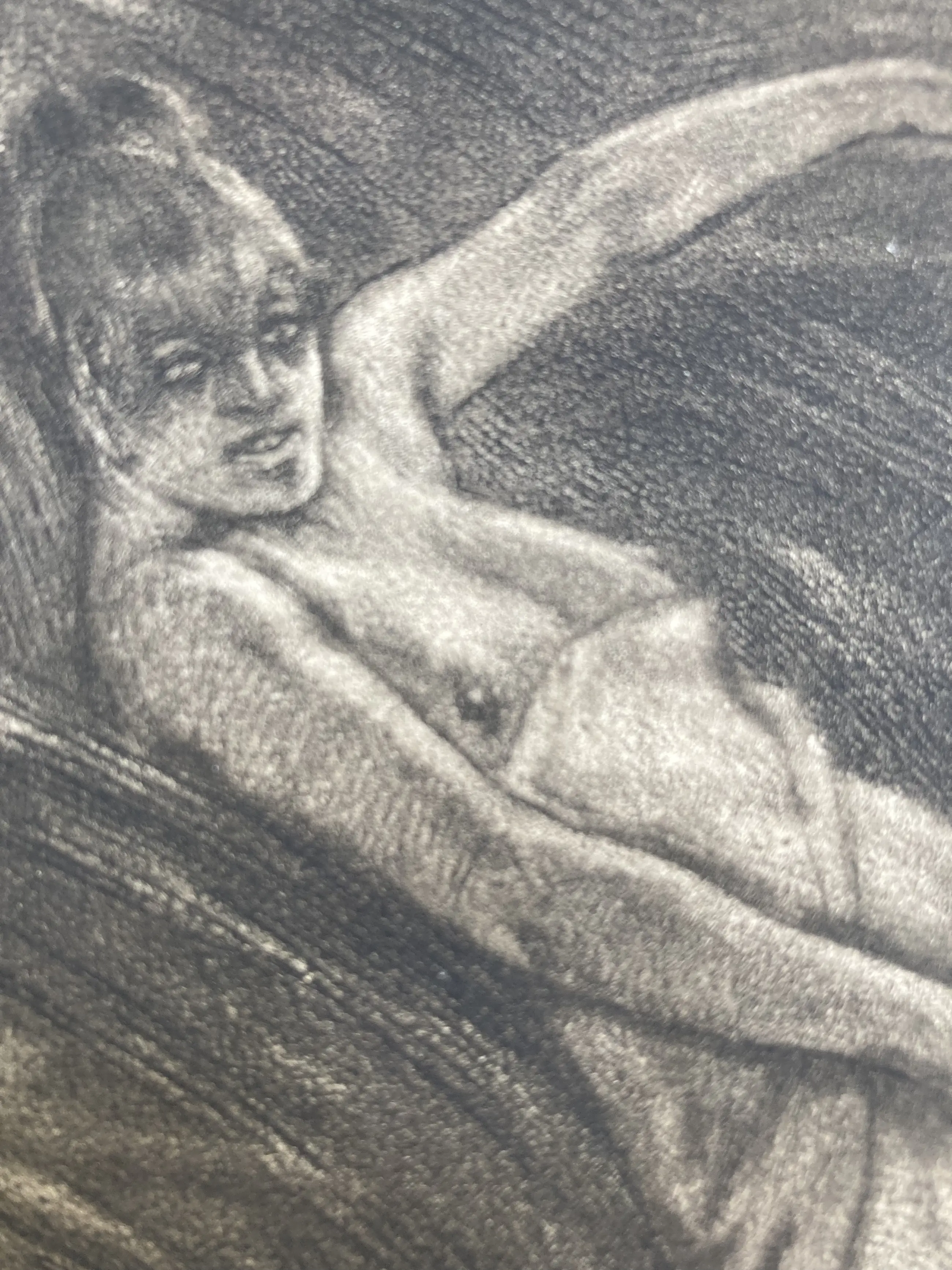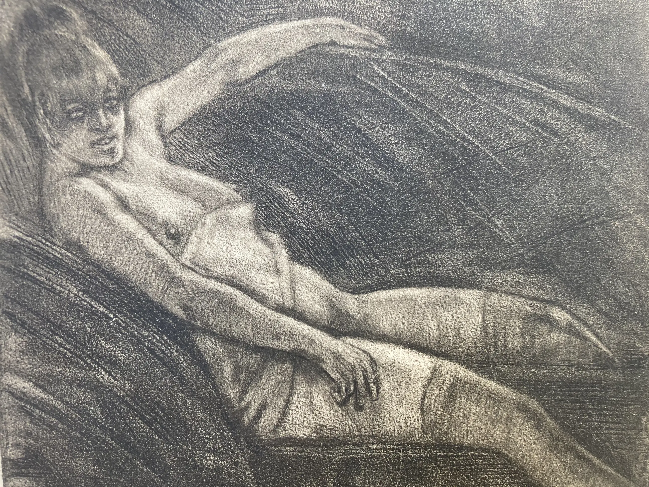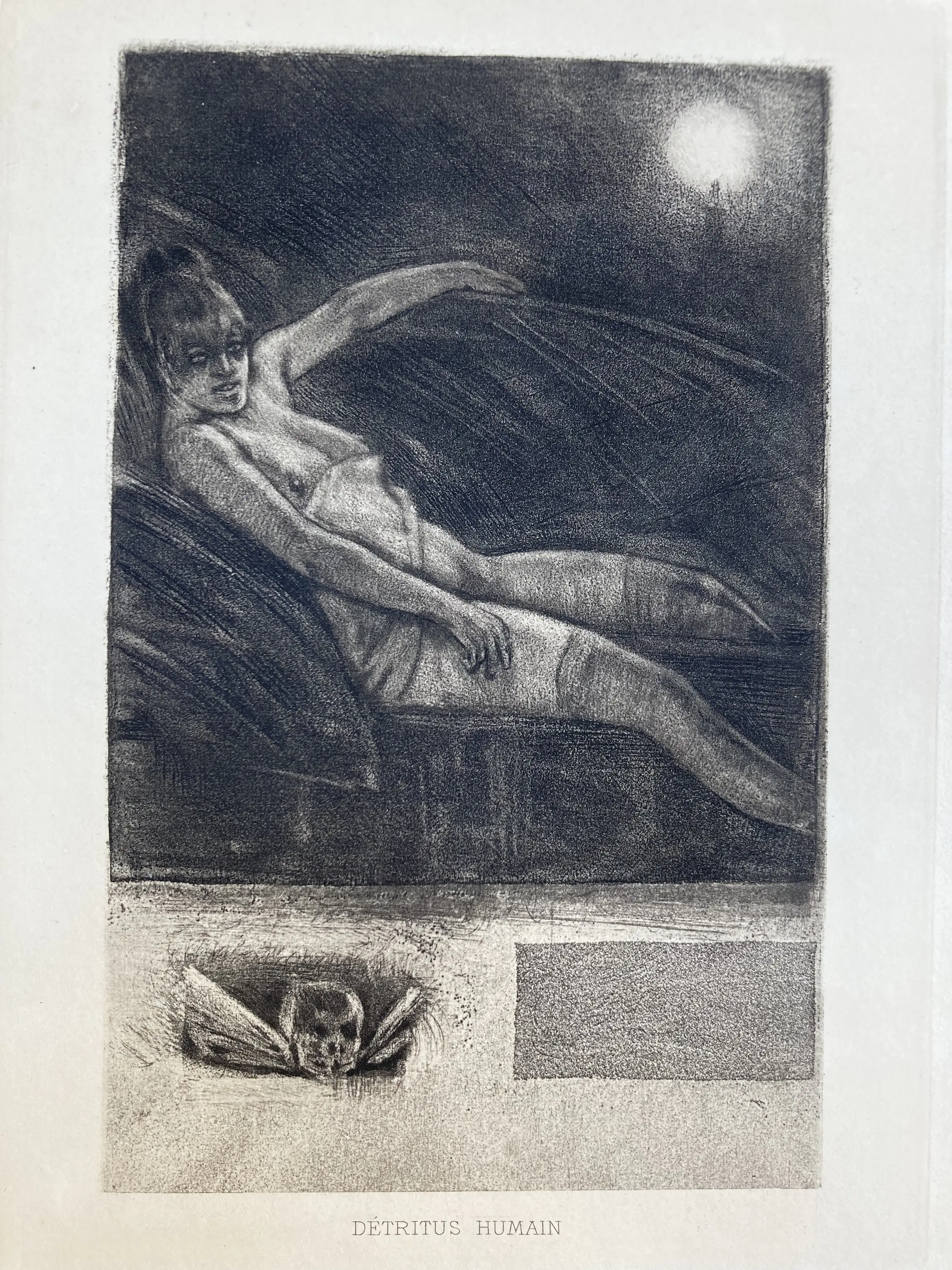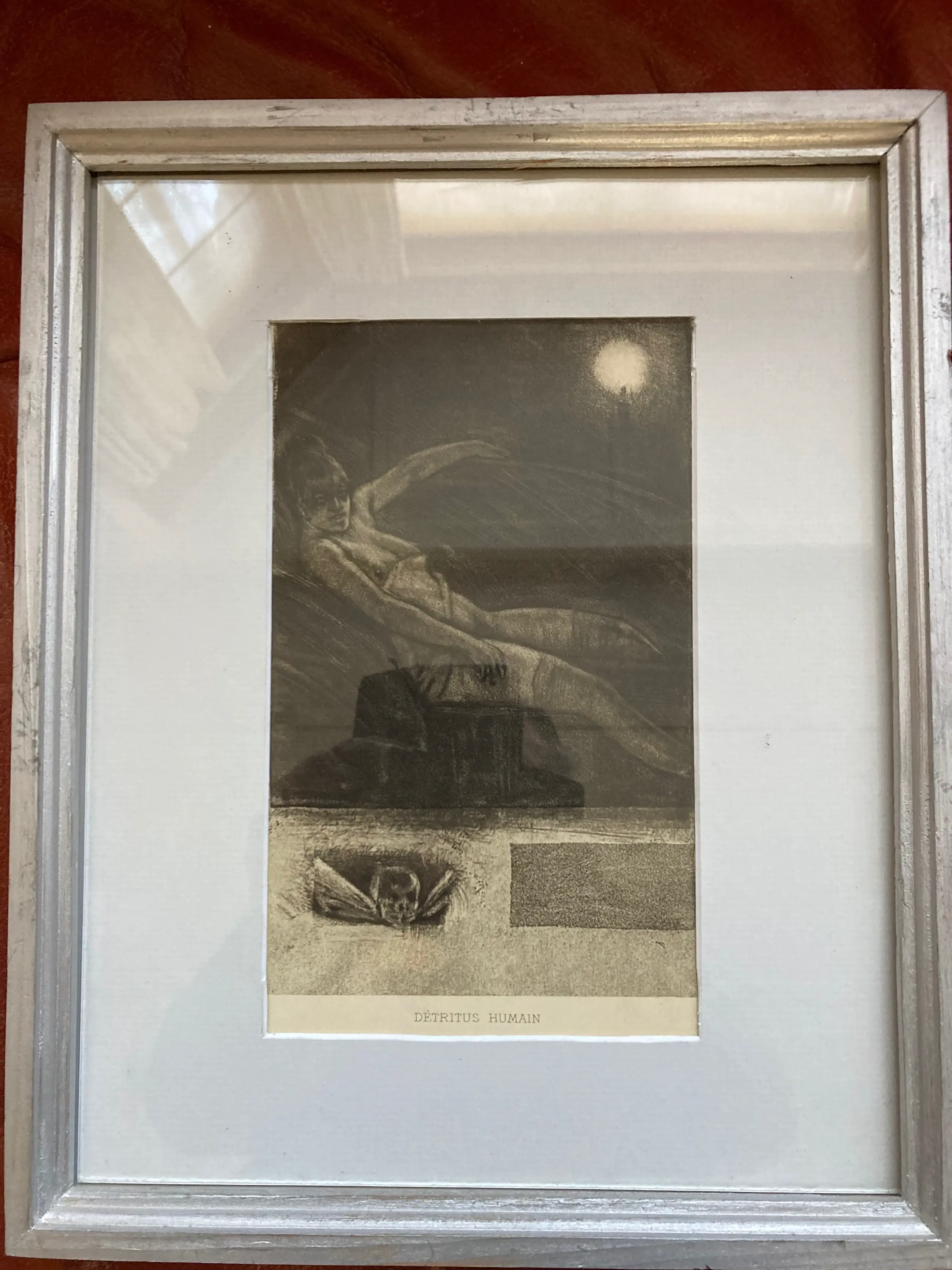 Heliogravure van de Belgische kunstenaar Félicien Rops. Getiteld in de plaat. Behoort tot een reeks van 10 etsen op papier, oorspronkelijk behorend bij de tekst "Les Diaboliques" van Barbey D'Aurevilly. Voor meer gegevens, zie Exsteens 985. Ingelijst in een eenvoudige zilverkleurige houten lijst, onder passepartout en achter glas.