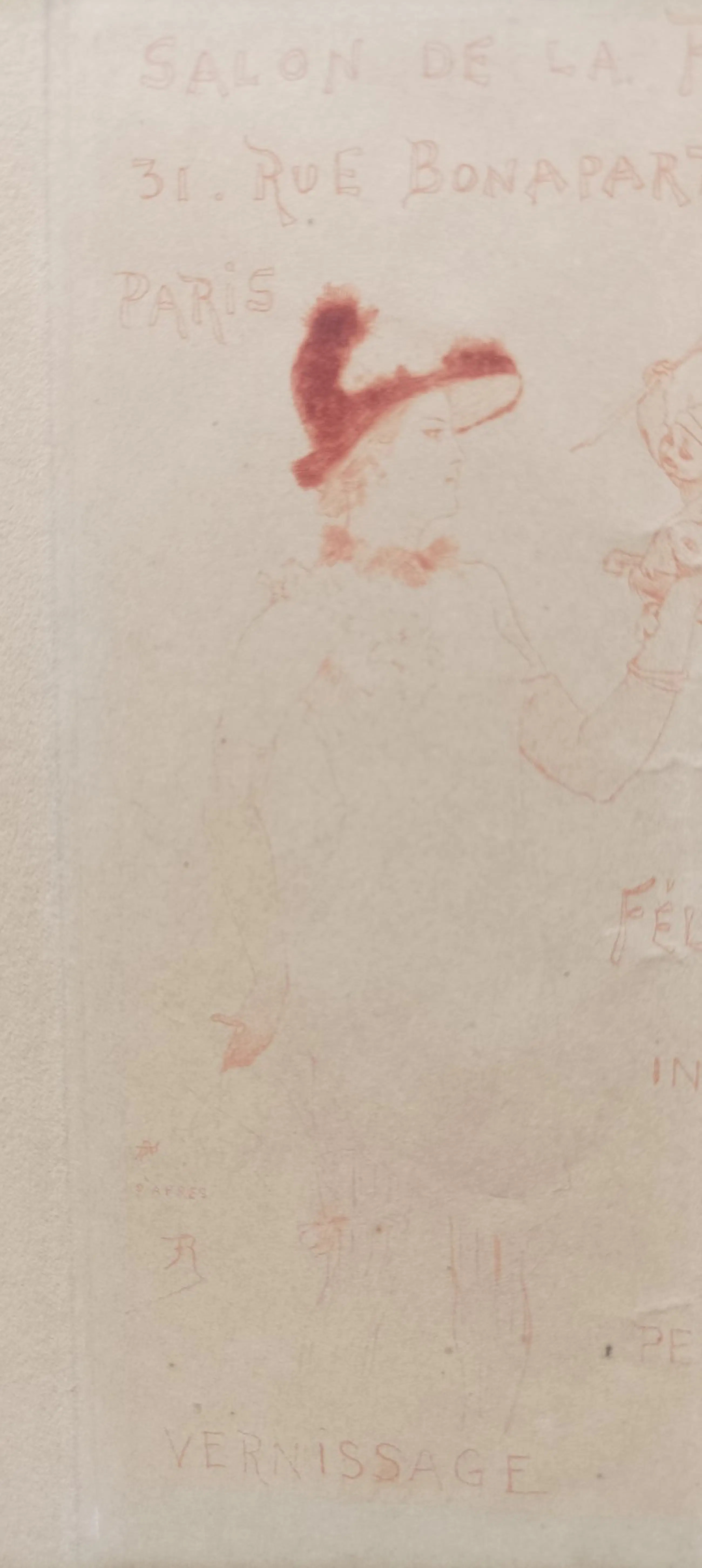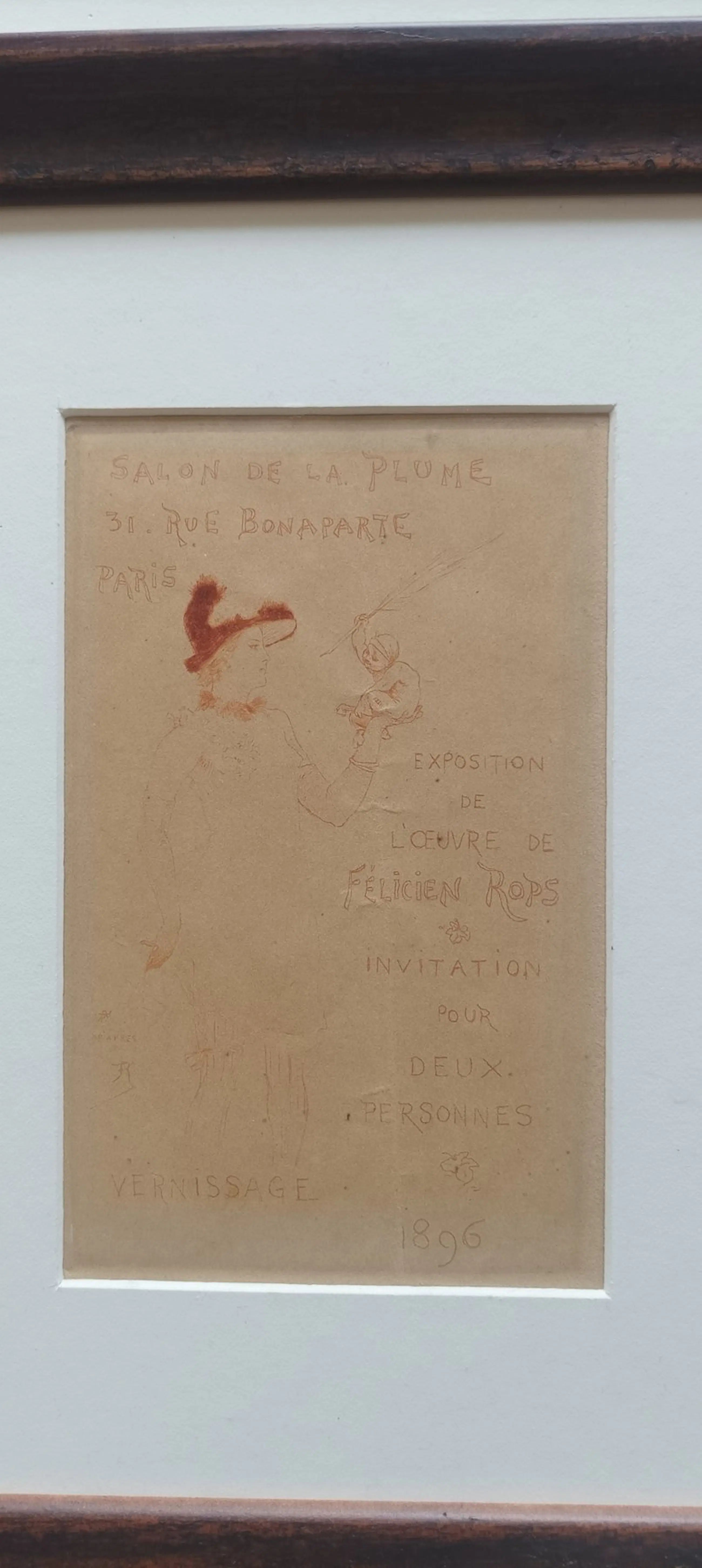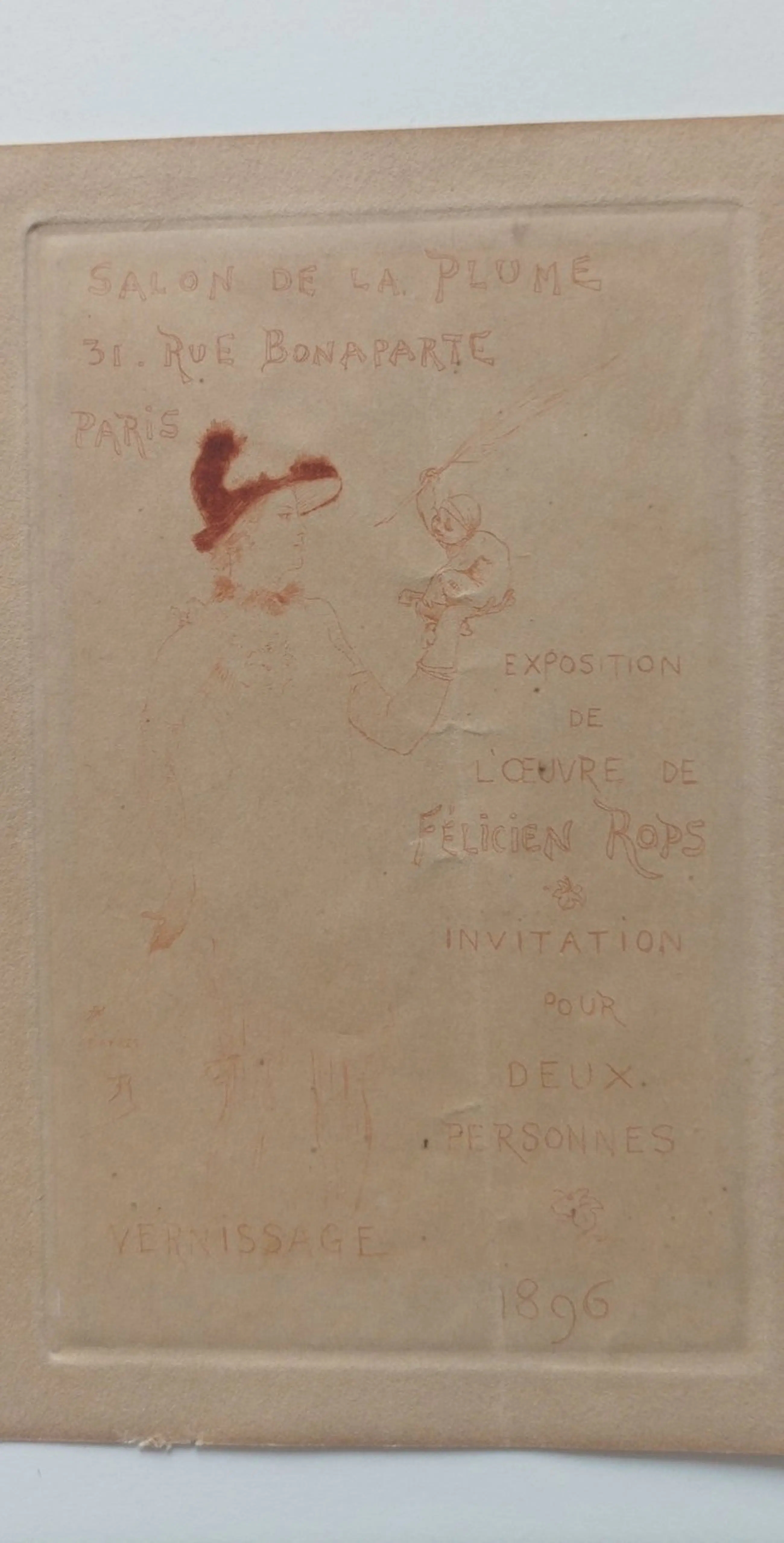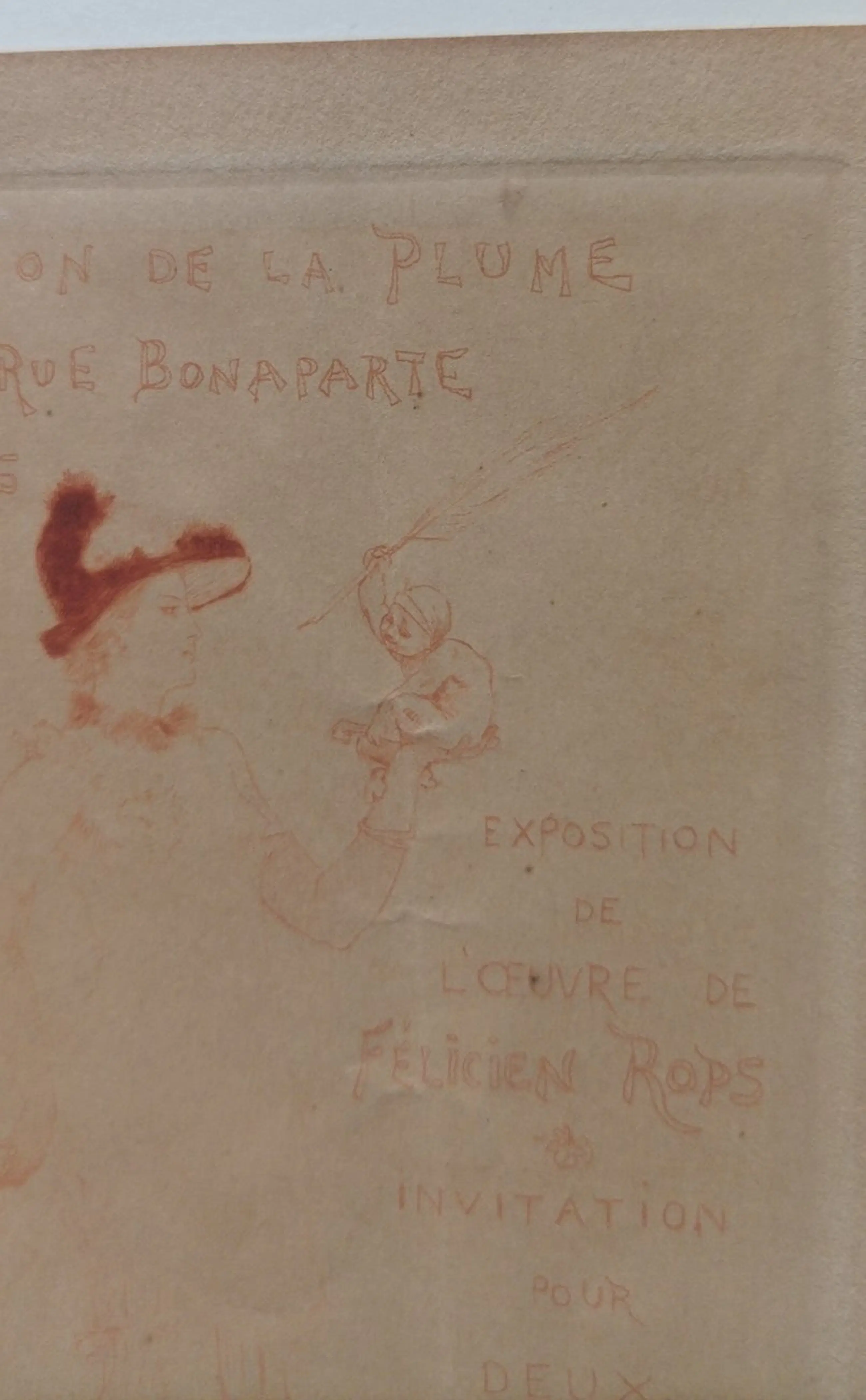 Armand Rassenfosse naar Félicien Rops - Vernissage: Invitation pour deux personnes Exposition de l'Oeuvre de Félicien Rops - Paris, Salon de de La Plume, 1896 - in rood gedrukte lithografie - 17,5 x 11 cm.
