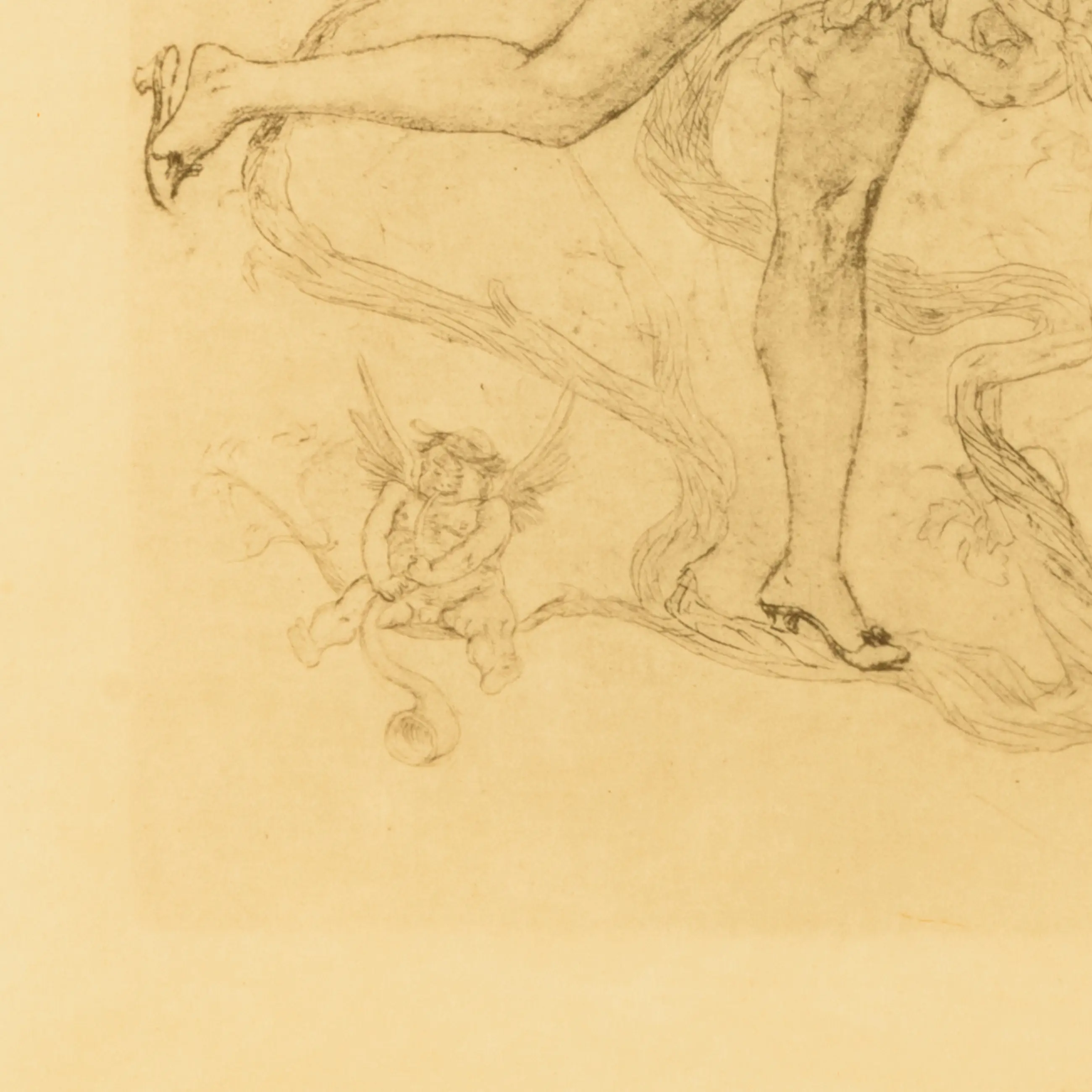 Ets met een dansende dame met om haar heen kleine cherubachtige figuren (cupido's of engeltjes) met vleugels. Deze symboliseren vaak vreugde, liefde of hemelse aanwezigheid.