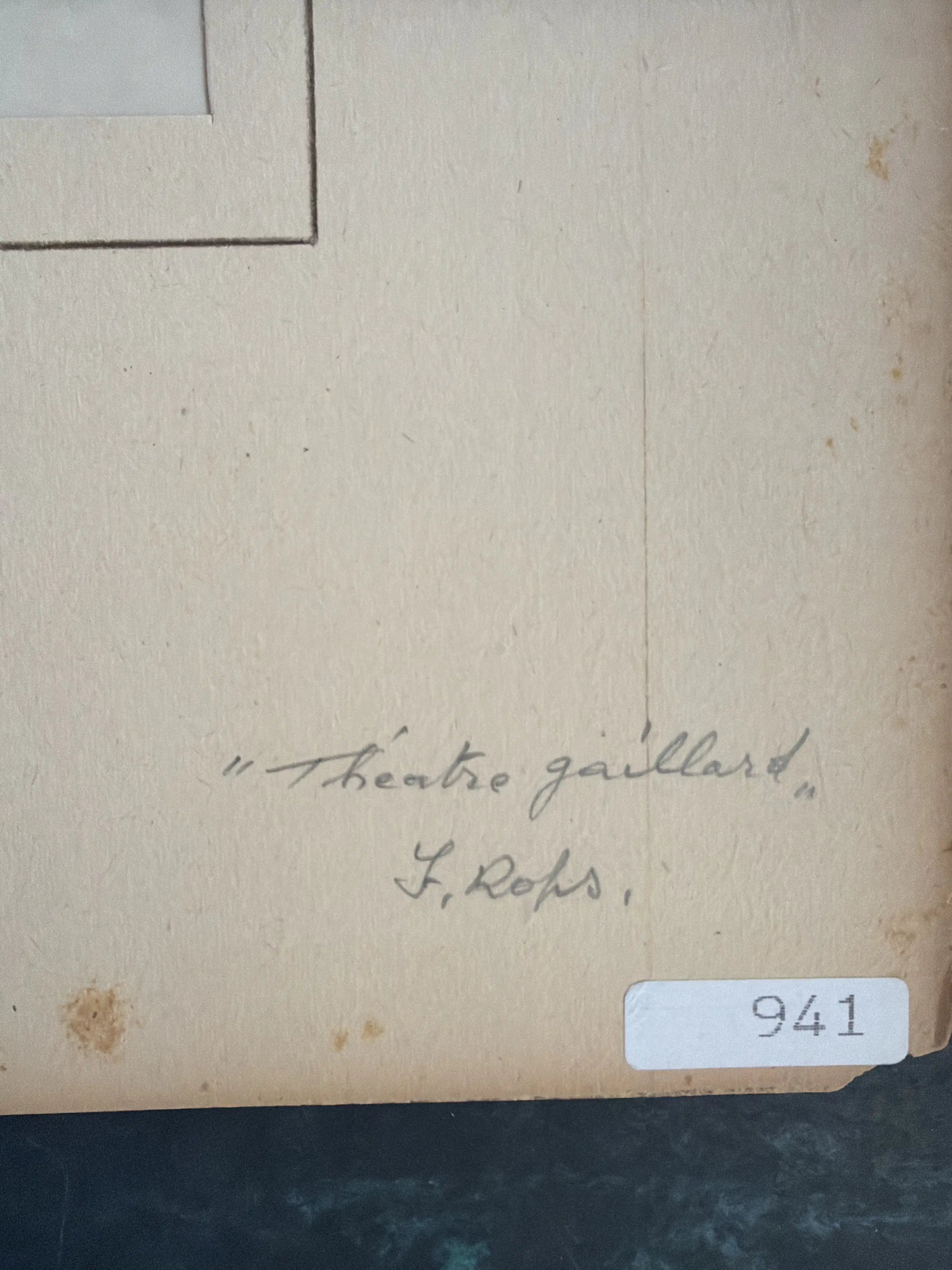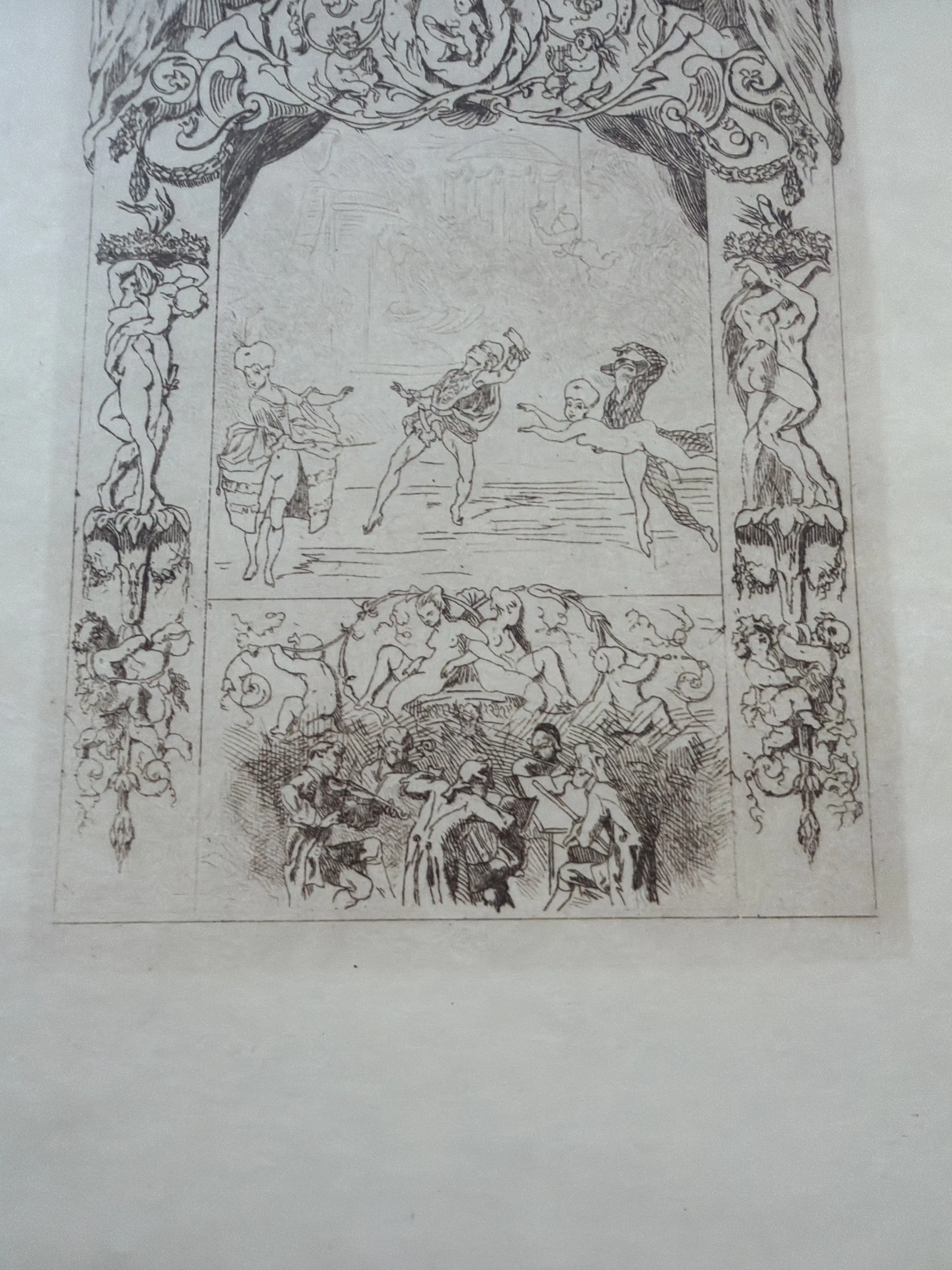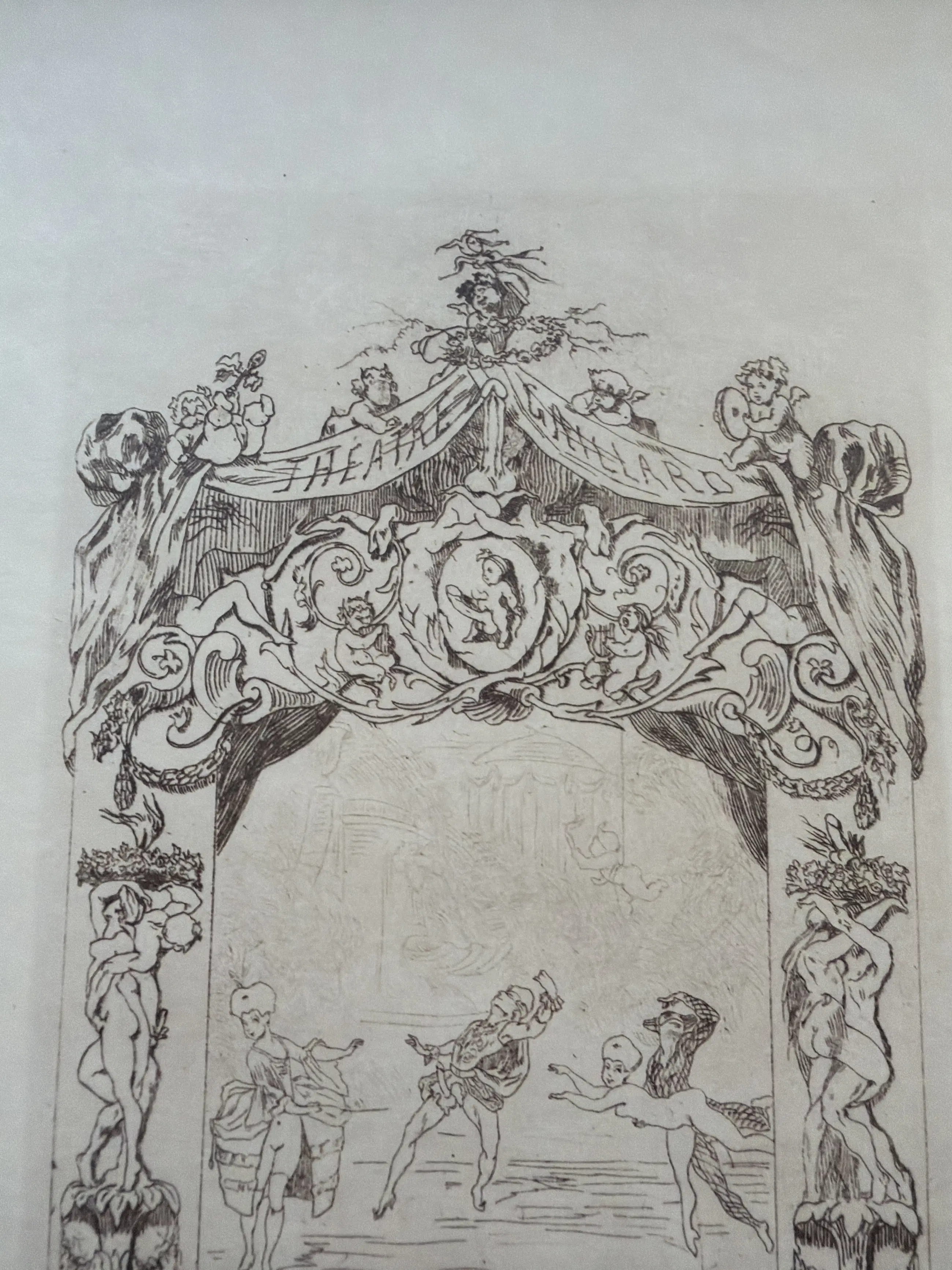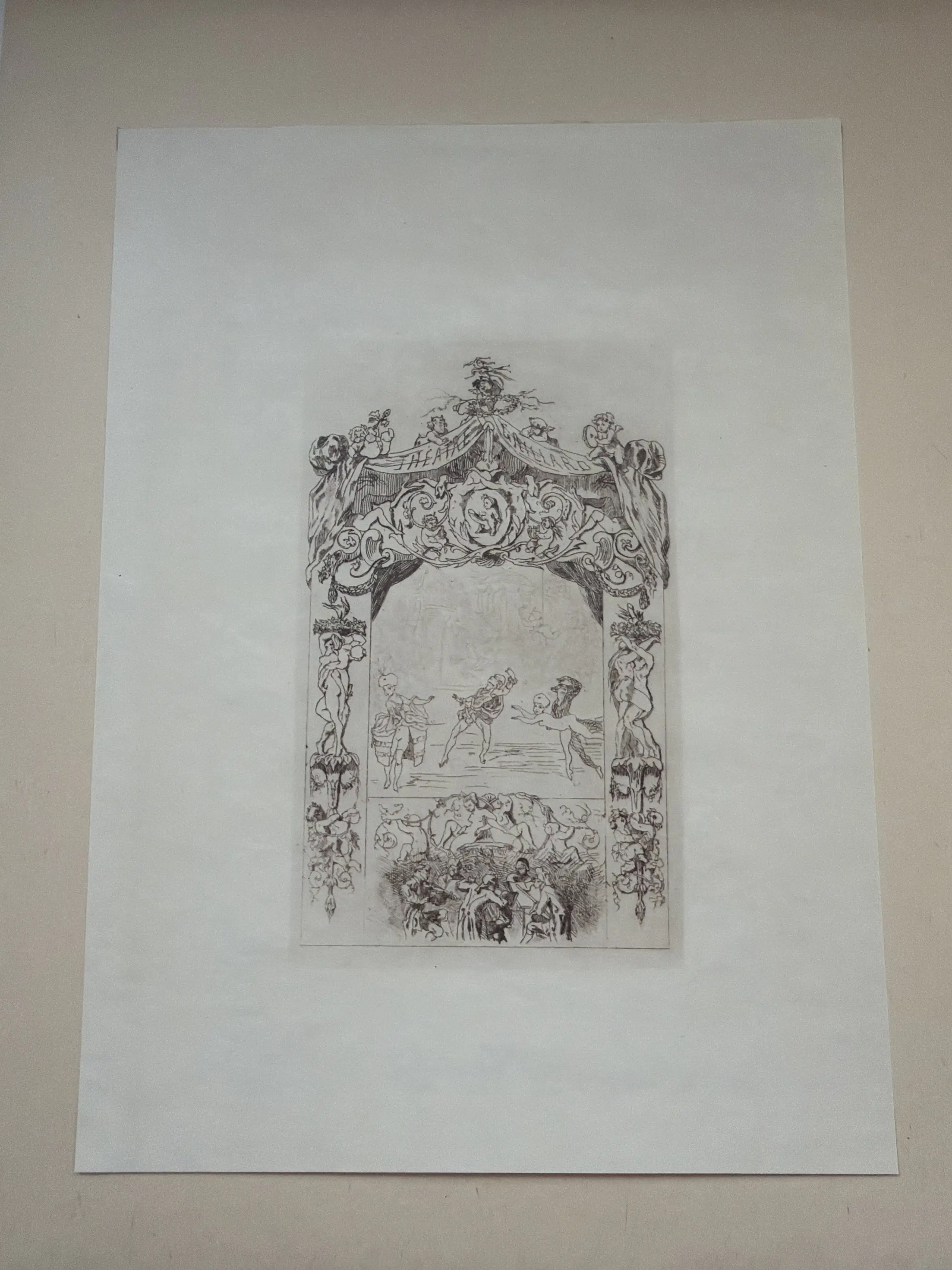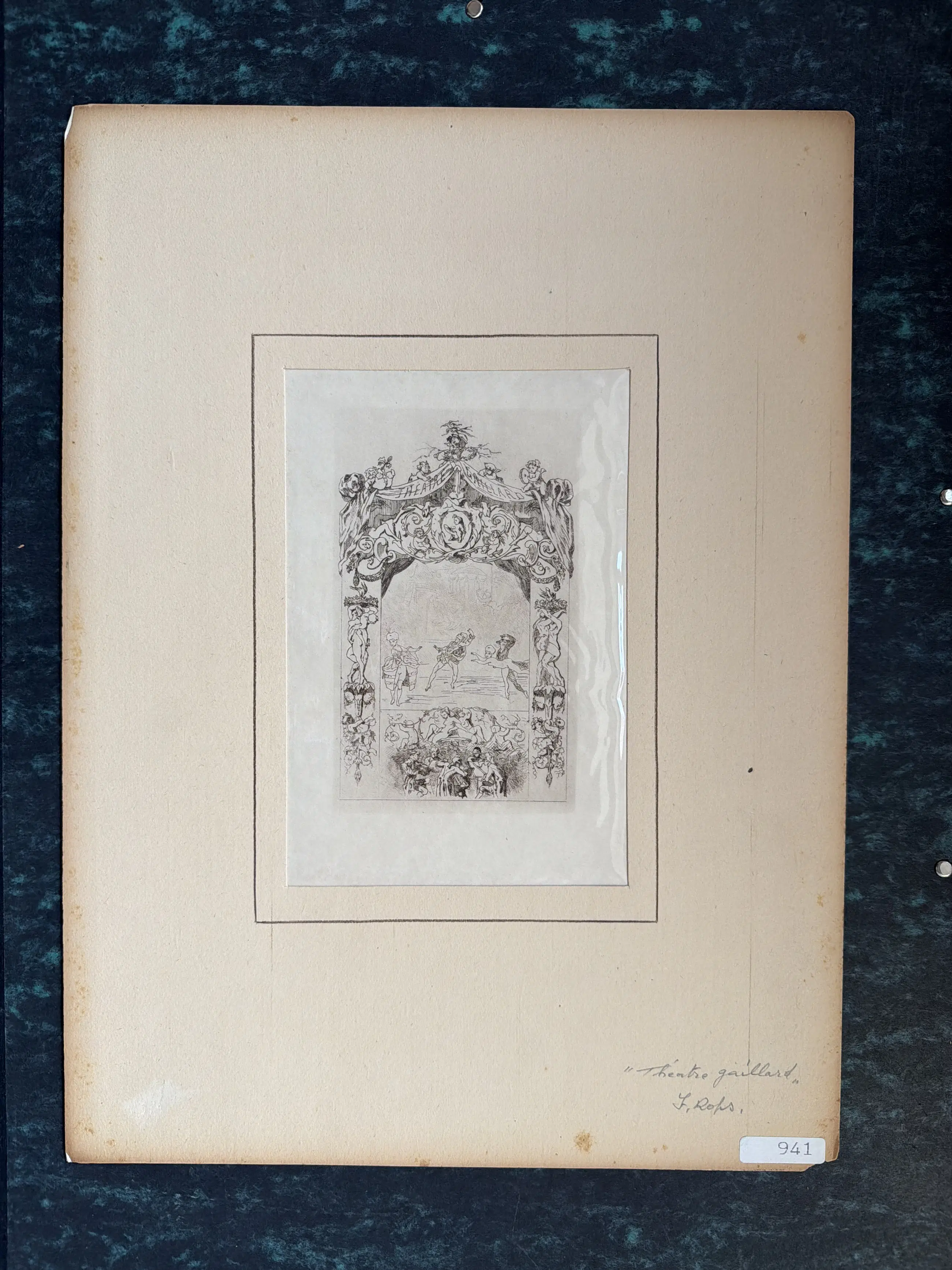 Dit is een prent met de titel "Théâtre" van de Belgische kunstenaar Félicien Rops. Het werk is een ets en aquatint, gemaakt rond 1870-1875. Het toont een decoratief toneel, met een voorstelling in het midden en een druk publiek eronder. De stijl is kenmerkend voor Rops' werk, met allegorische en vaak satirische elementen.