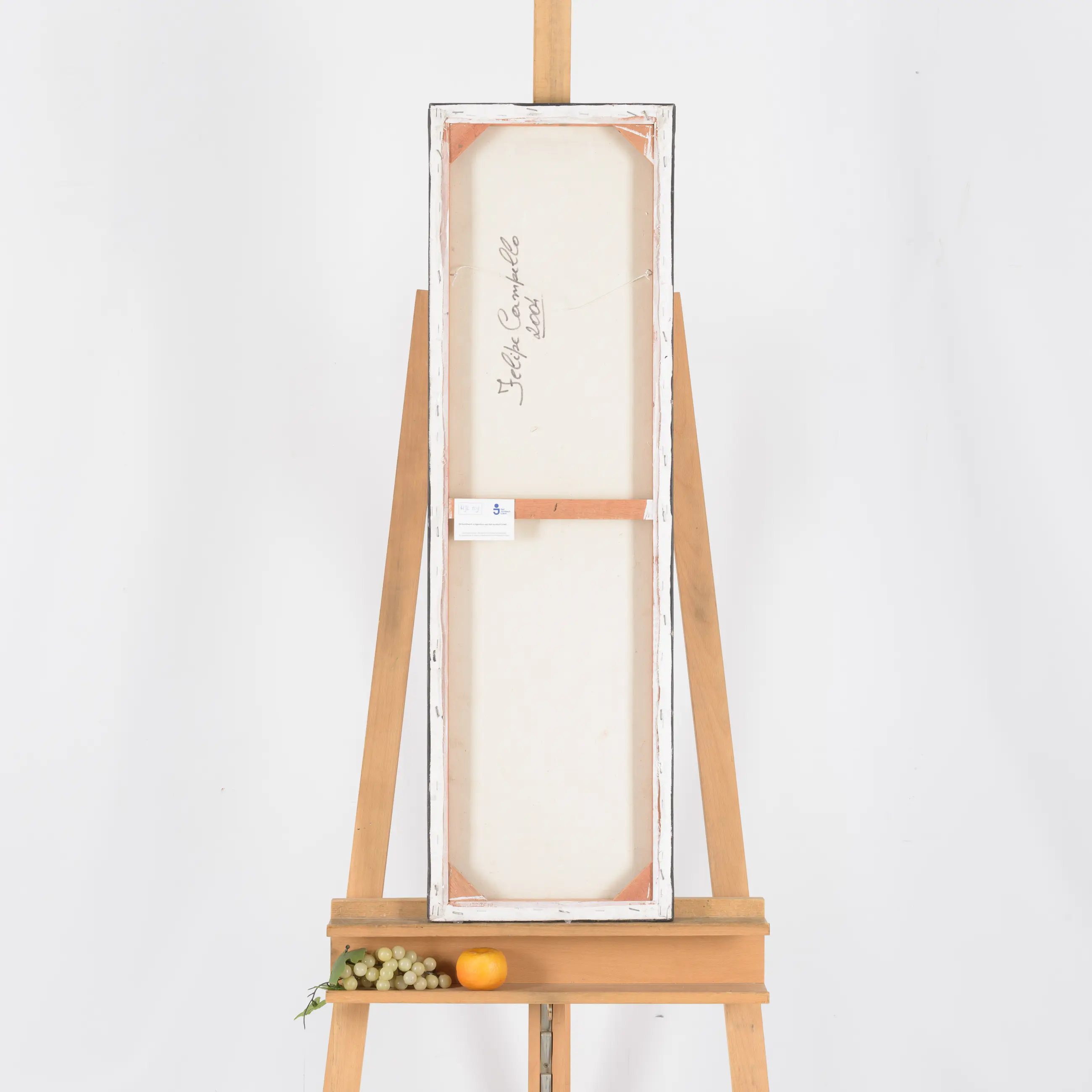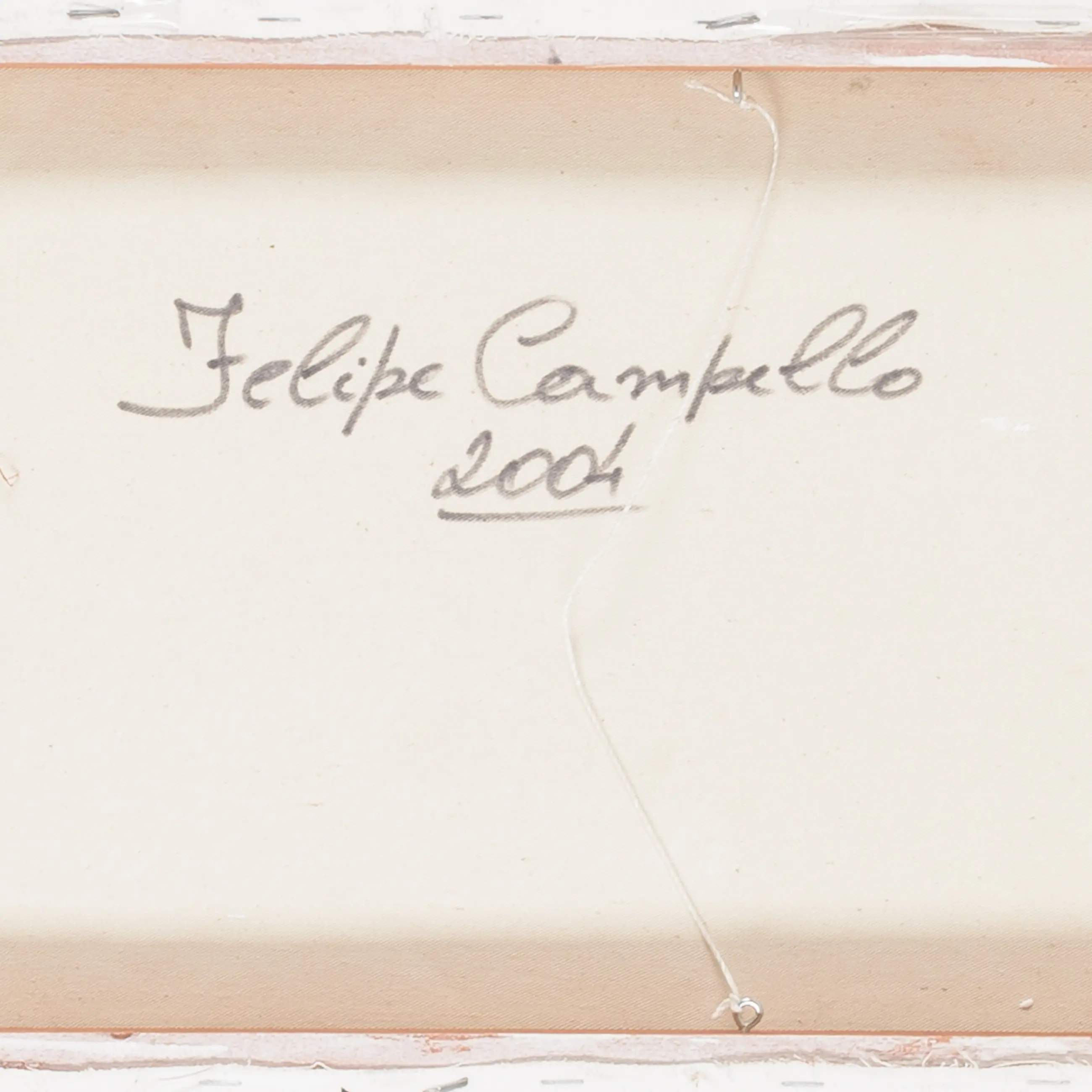 Dit schilderij is van Felipe Campello. Hij is geboren in 1961 in Rio de Janeiro in Brazilië. Al op jonge leeftijd was hij bezig met het onderzoeken en combineren van verschillende materialen, waarvan hij kunstinstallaties en kunstobjecten maakte.