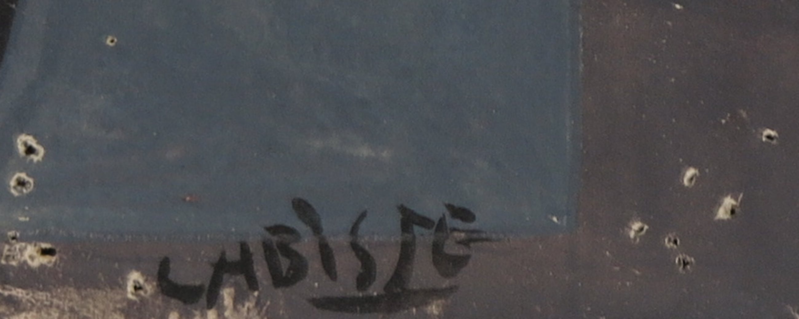 | Helaas beschadigde conditie. Punaisegaatjes in de hoeken, het signatuur en bovenin het beeld. Meerdere veegjes/krasjes in het beeld, ook enkele kleine plekjes/beschadiging met verfverlies in het beeld. De hoeken hebben ook ezelsoortjes. | |||||||||||