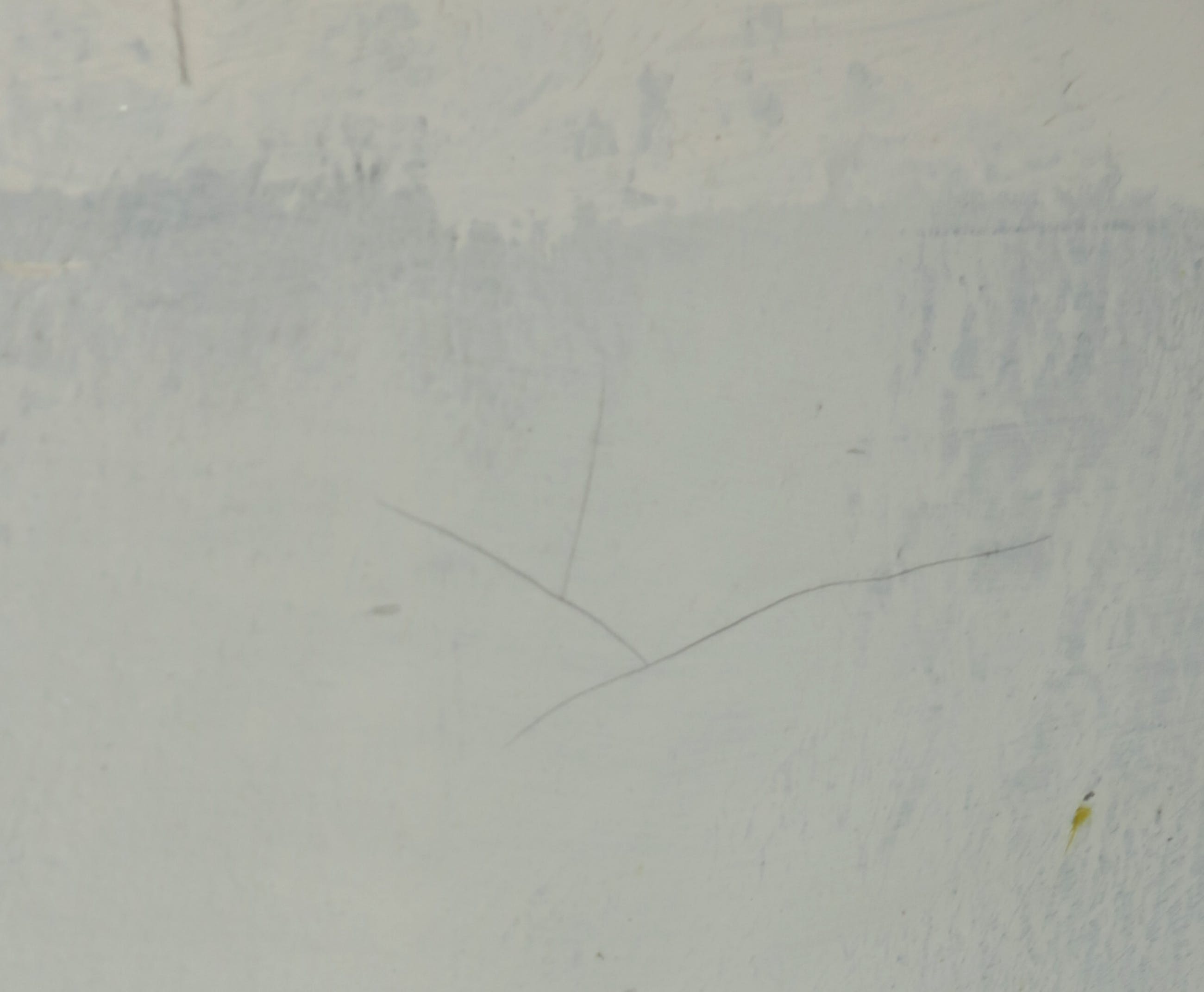 | De randen van het doek zijn rondom licht verweerd. Met name aan de bovenzijde en licht aan de onderzijde oogt het werk een beetje 'smoezelig'. | |
