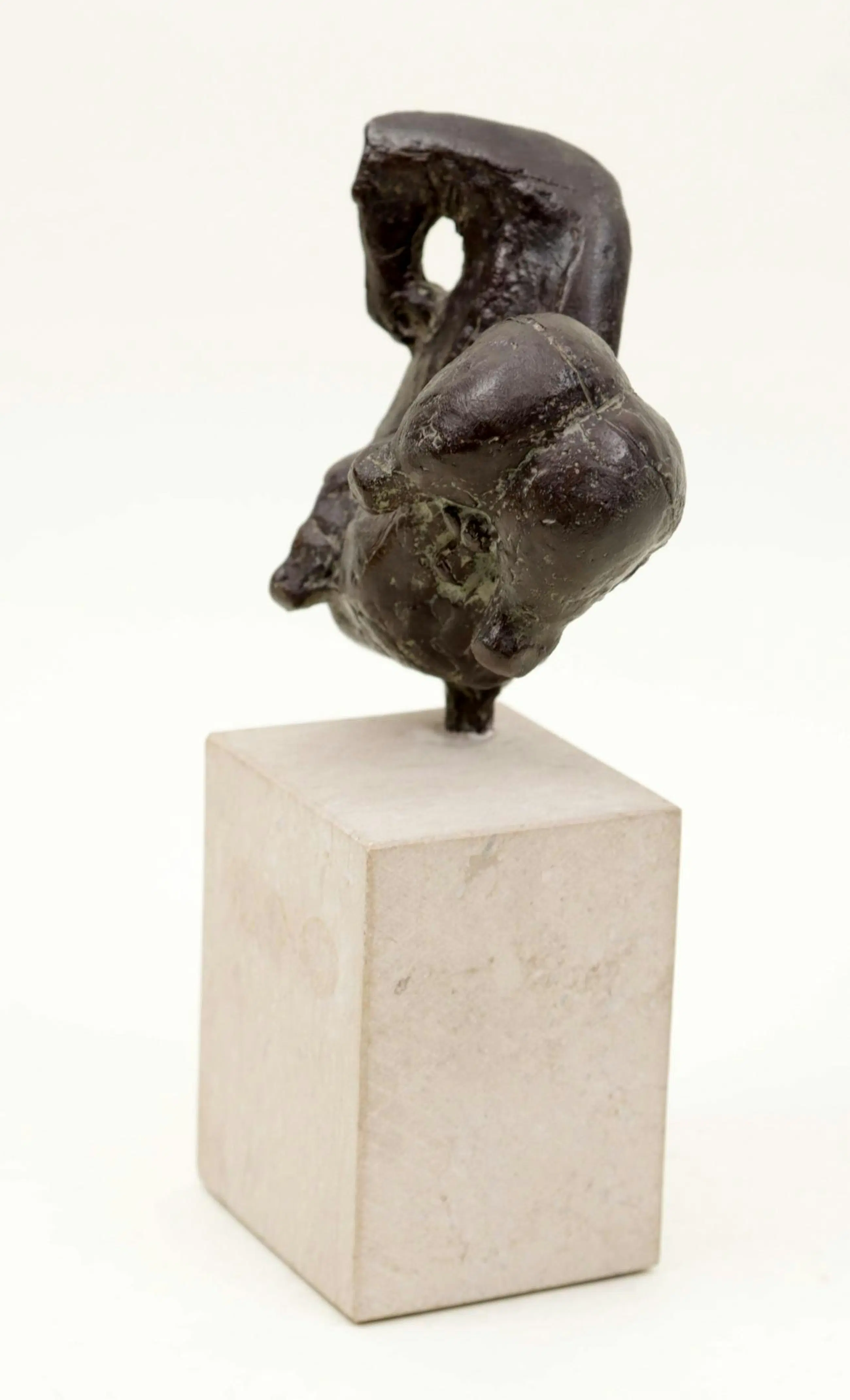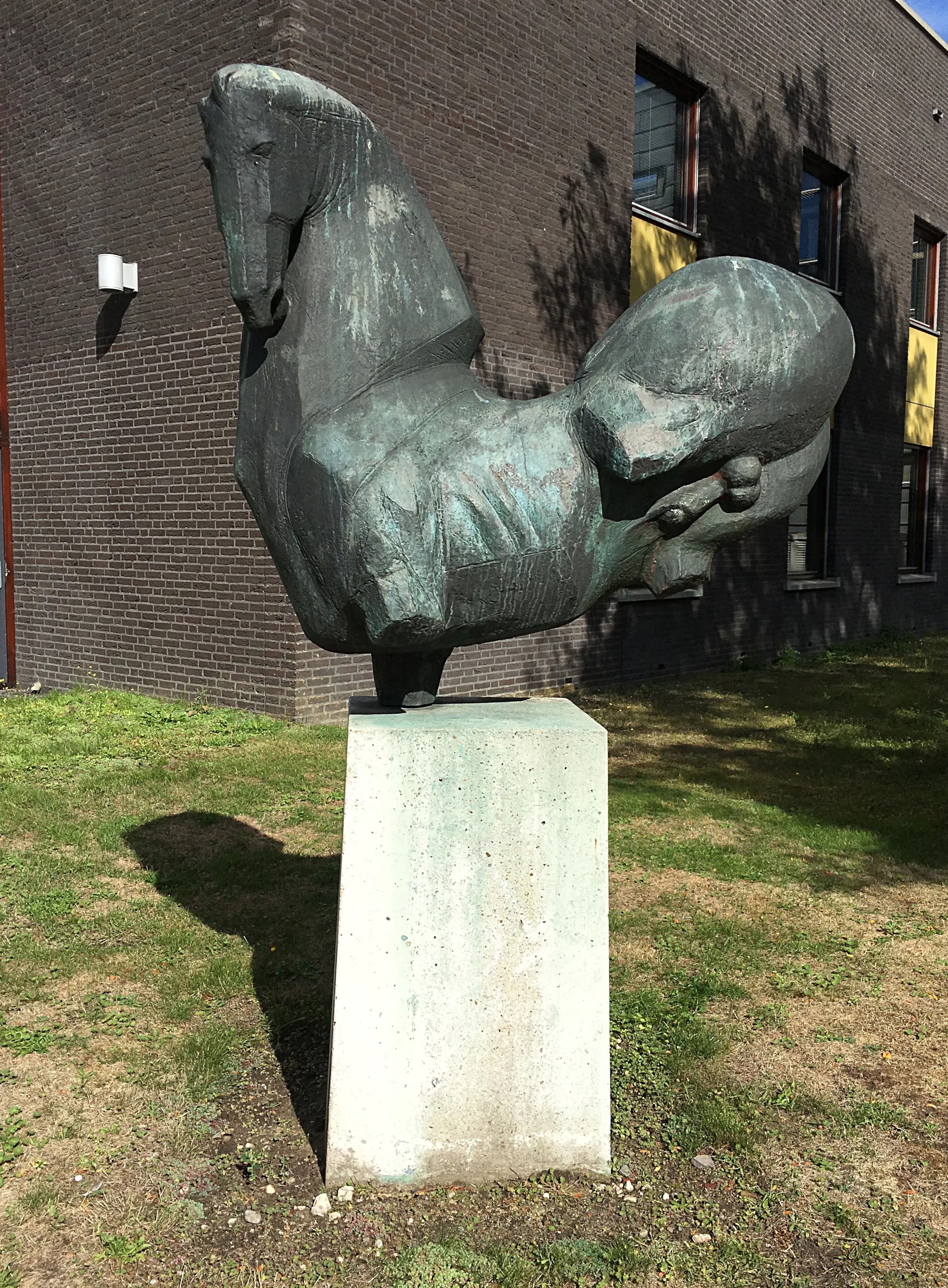 Bronzen paard rustend op hardstenen sokkel, genaamd Force.