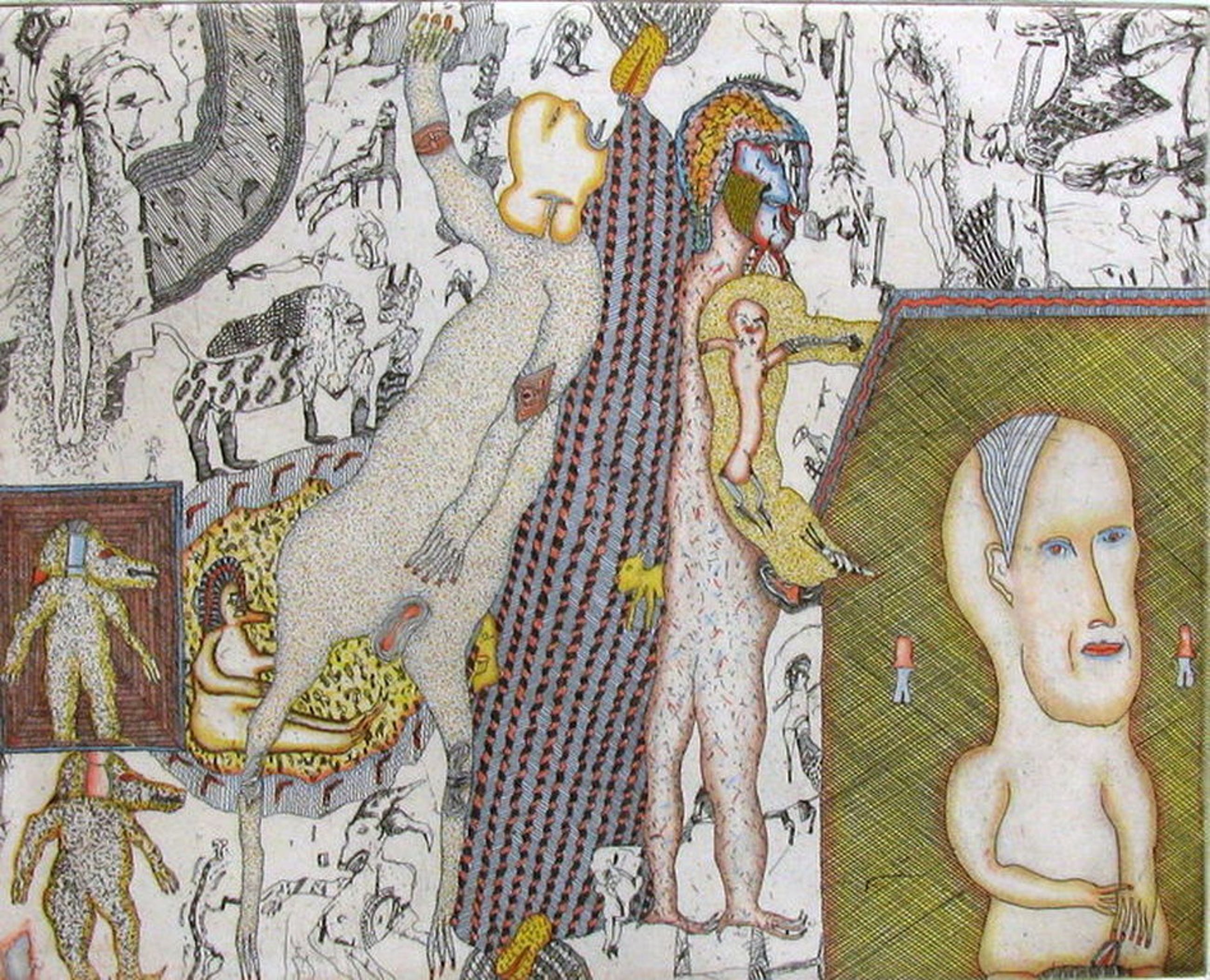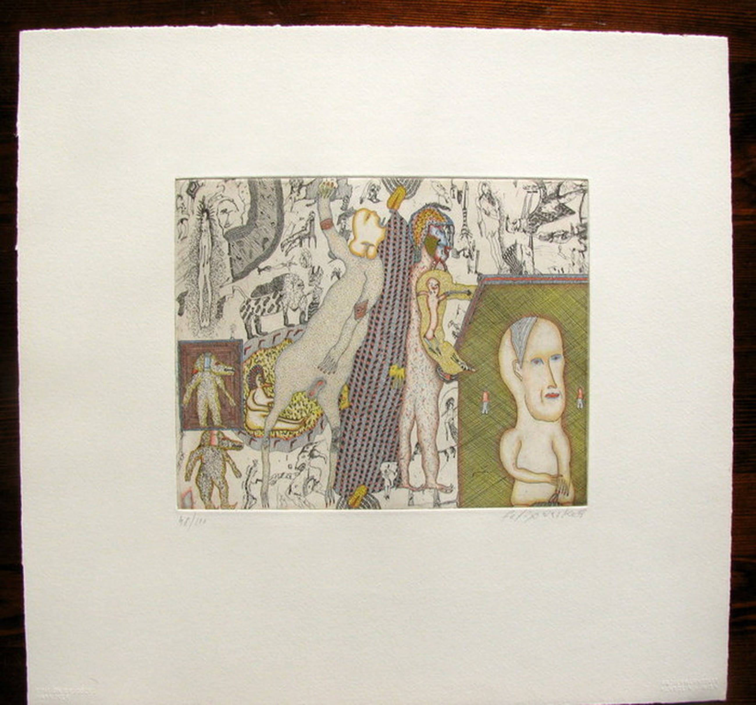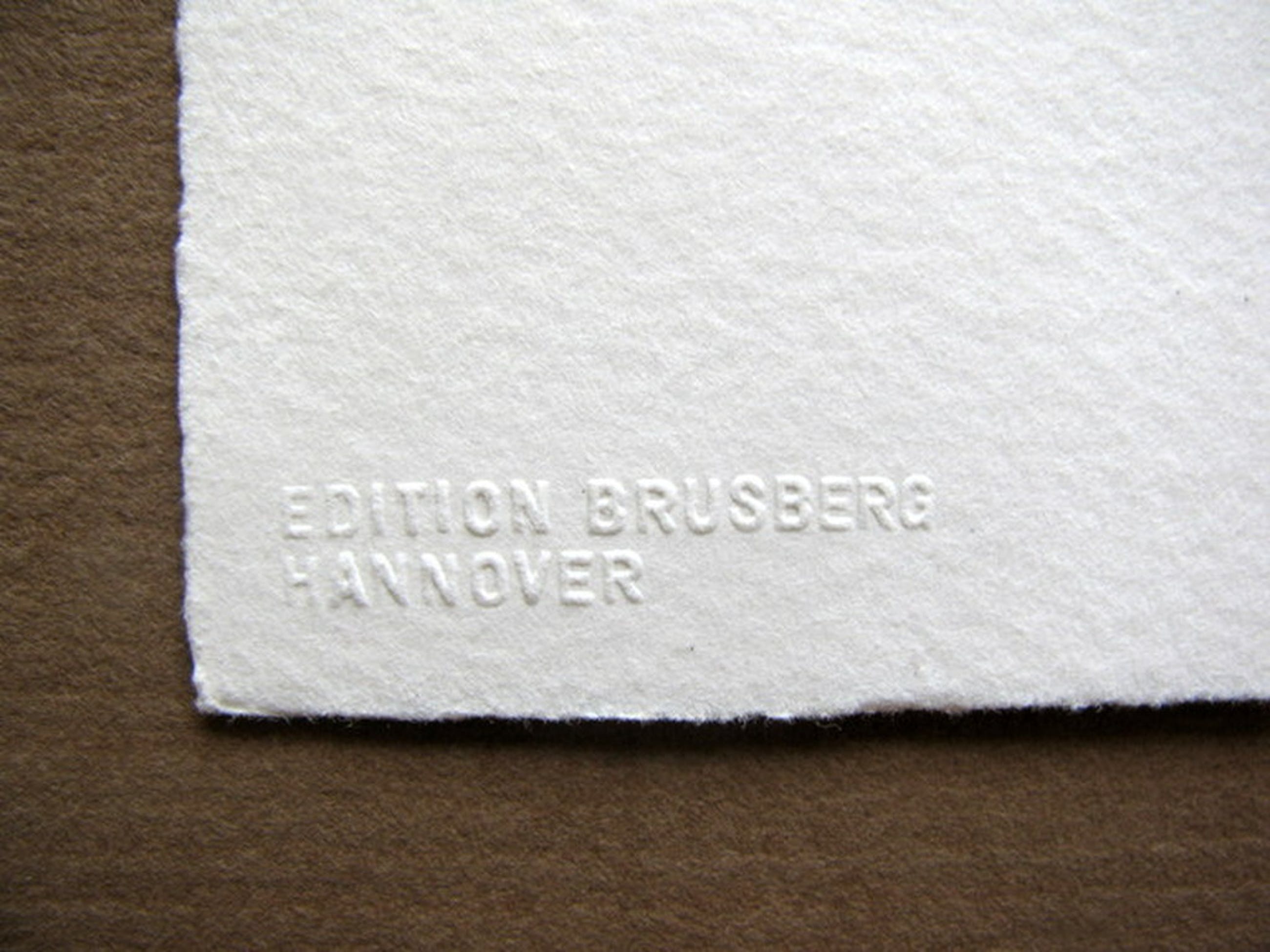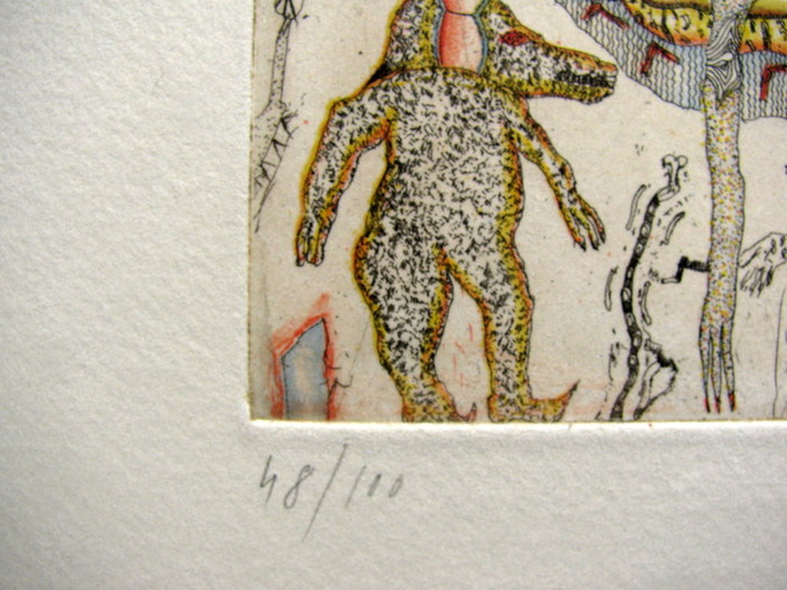 Het blad dat we aanbieden, is één van deze 12 nummers. Het is een droge-naald-ets met aquatint en vernis mou op Arches, met brede randen, door de kunstenaar met potlood genummerd (48/100), gesigneerd en gedateerd. Afmetingen: 15,5 x 19,5 cm op 33 x 34,5 cm. Linksonder bevindt zich de droogstempel van de galerij Brusberg (toen nog in Hannover, nu in Berlijn), rechtsonder de droogstempel van de Radierwerkstatt Kurt Zein uit Wenen. Het blad is in goede staat.