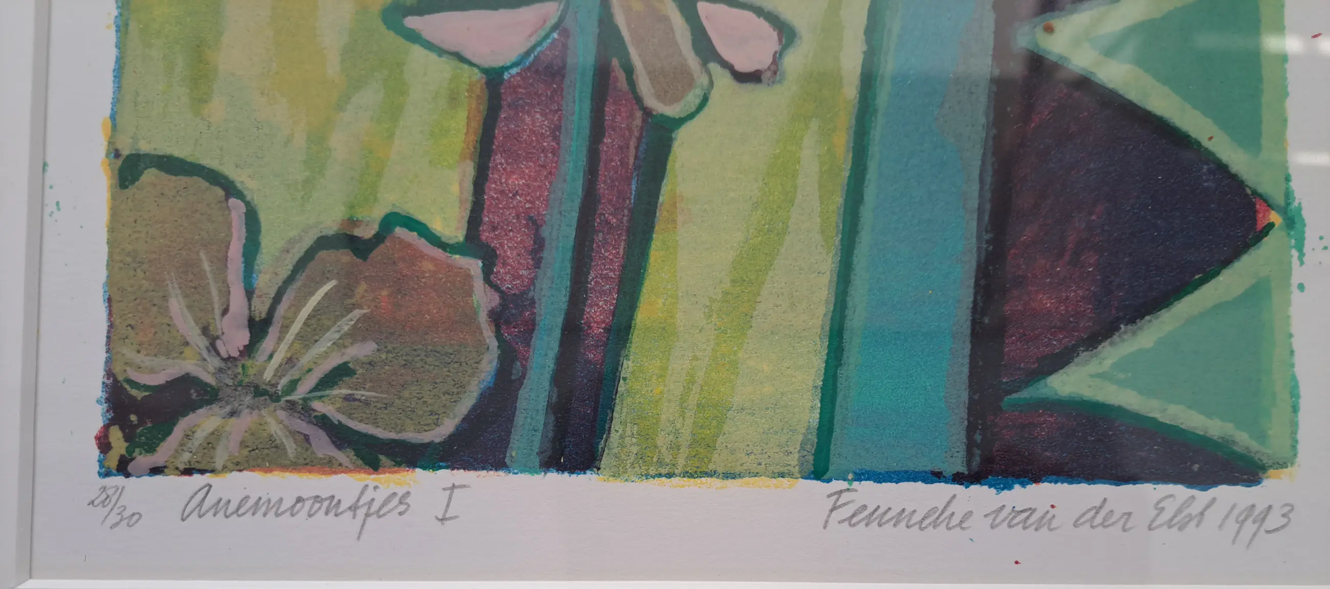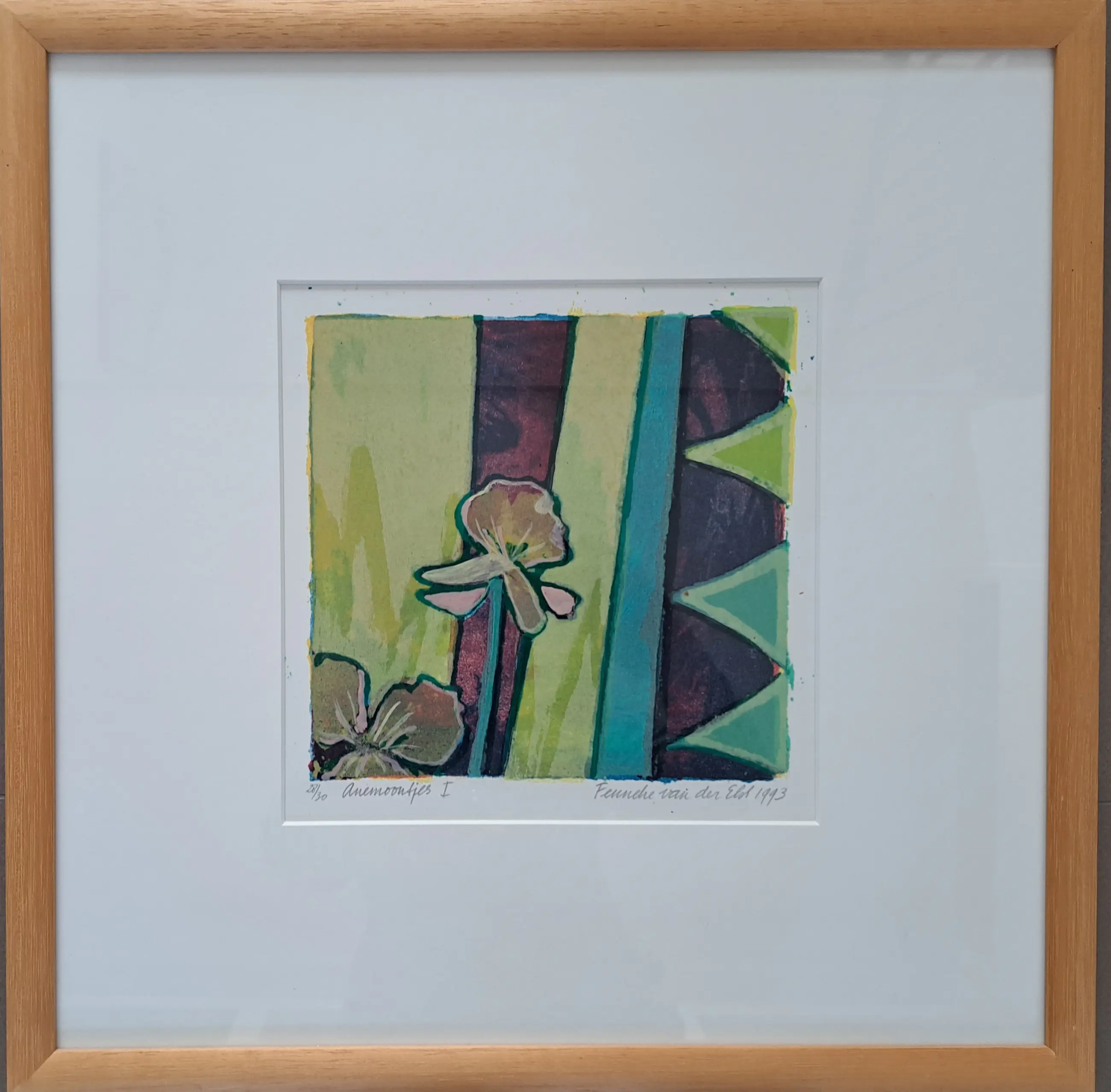 Gesigneerde zeefdruk, exemplaar 28/30. Mooi ingelijst in houten lijst op maat, werk zit achter een passepartout.