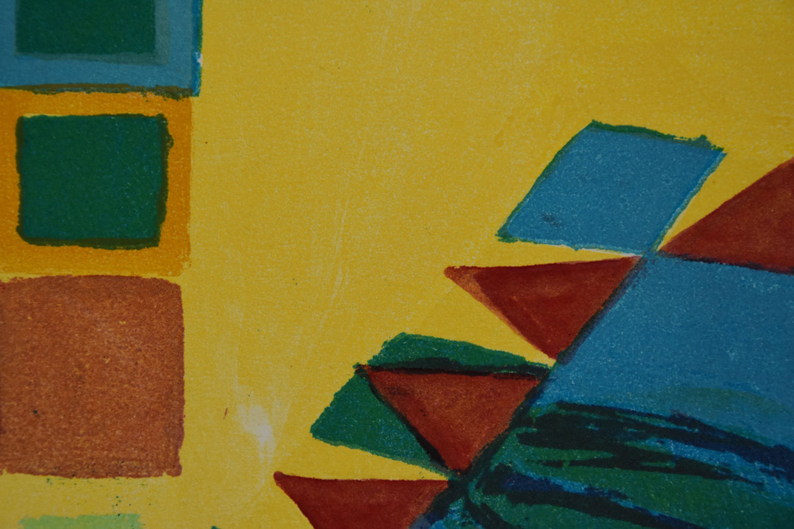 Kleurige en vrolijke litho van een huiselijk tafereel waarin vander Elst haar voorkeur voor heldere , warme kleuren laat zien. Abstractie wordt gecombineerd met realistische elementen en vormen tezamen daardoor een zeer toegankelijke compositie.