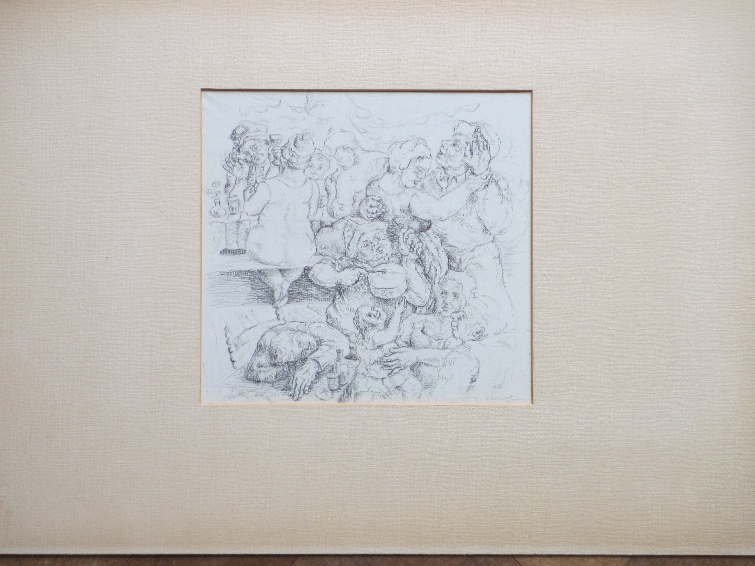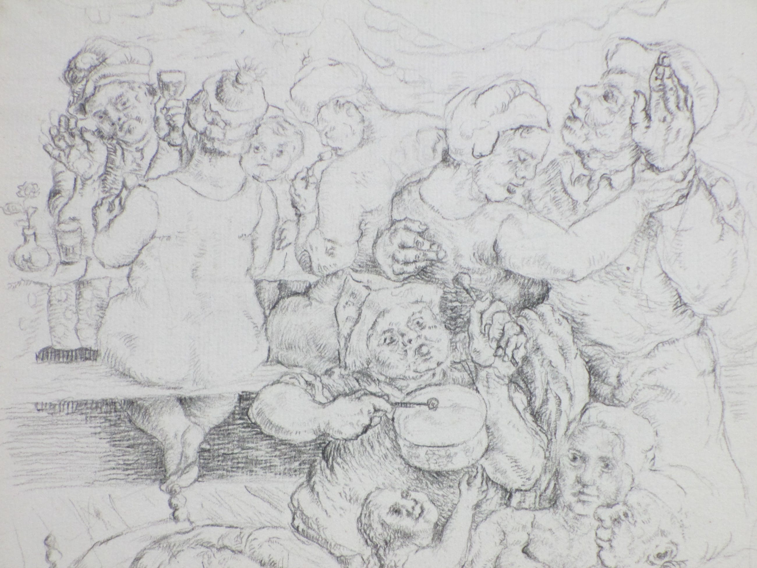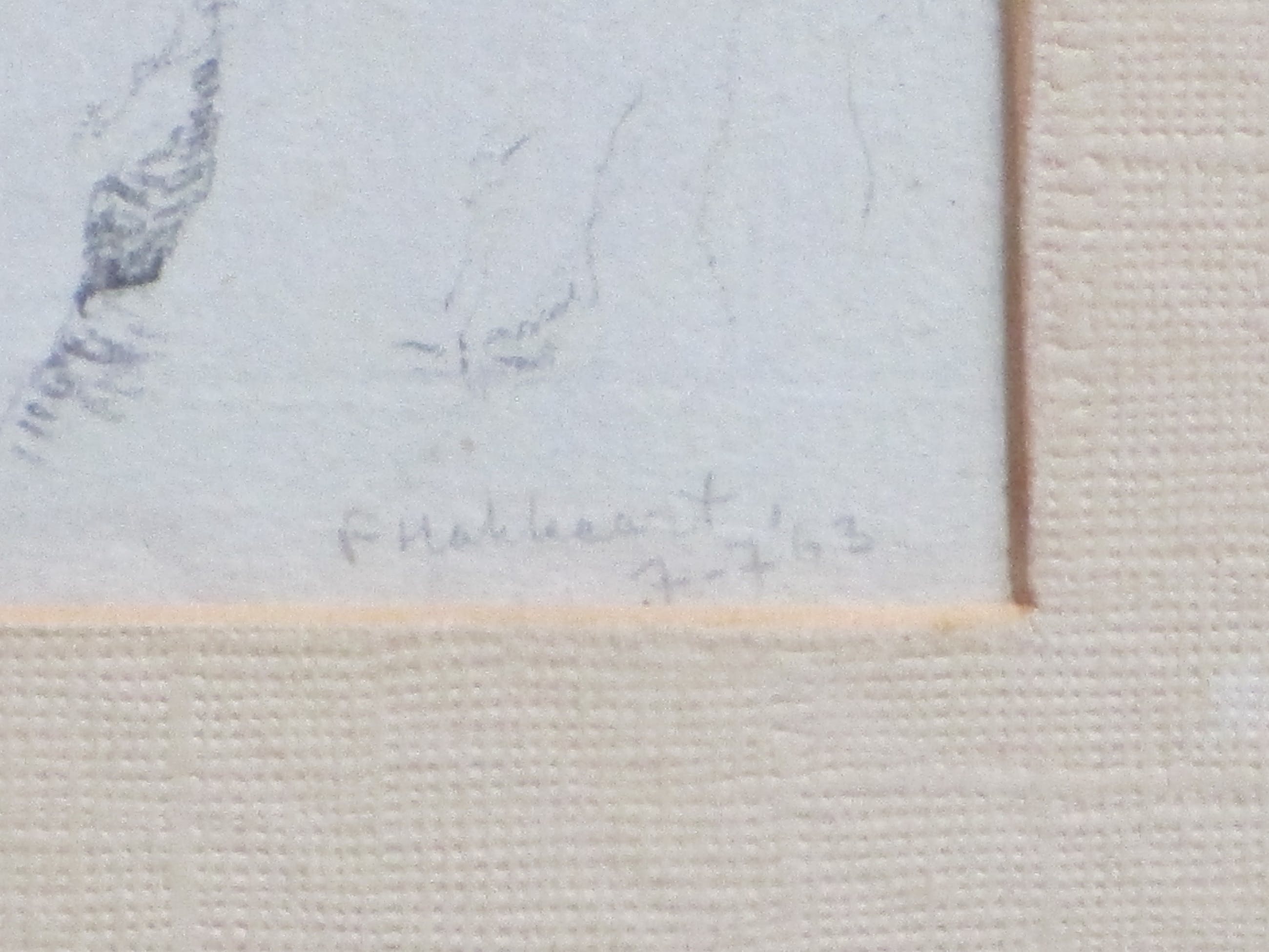 Tekening door Fer Hakkaart. Voorstelling van een feestend gezelschap. Tekening onder passepartout, beeldmaat 19x20, p.p.maat 35x50 Gesigneerd en gedateerd rechtsonder: 'F.Hakkaart 7-7-'63' Authenticiteit volledig gegarandeerd.