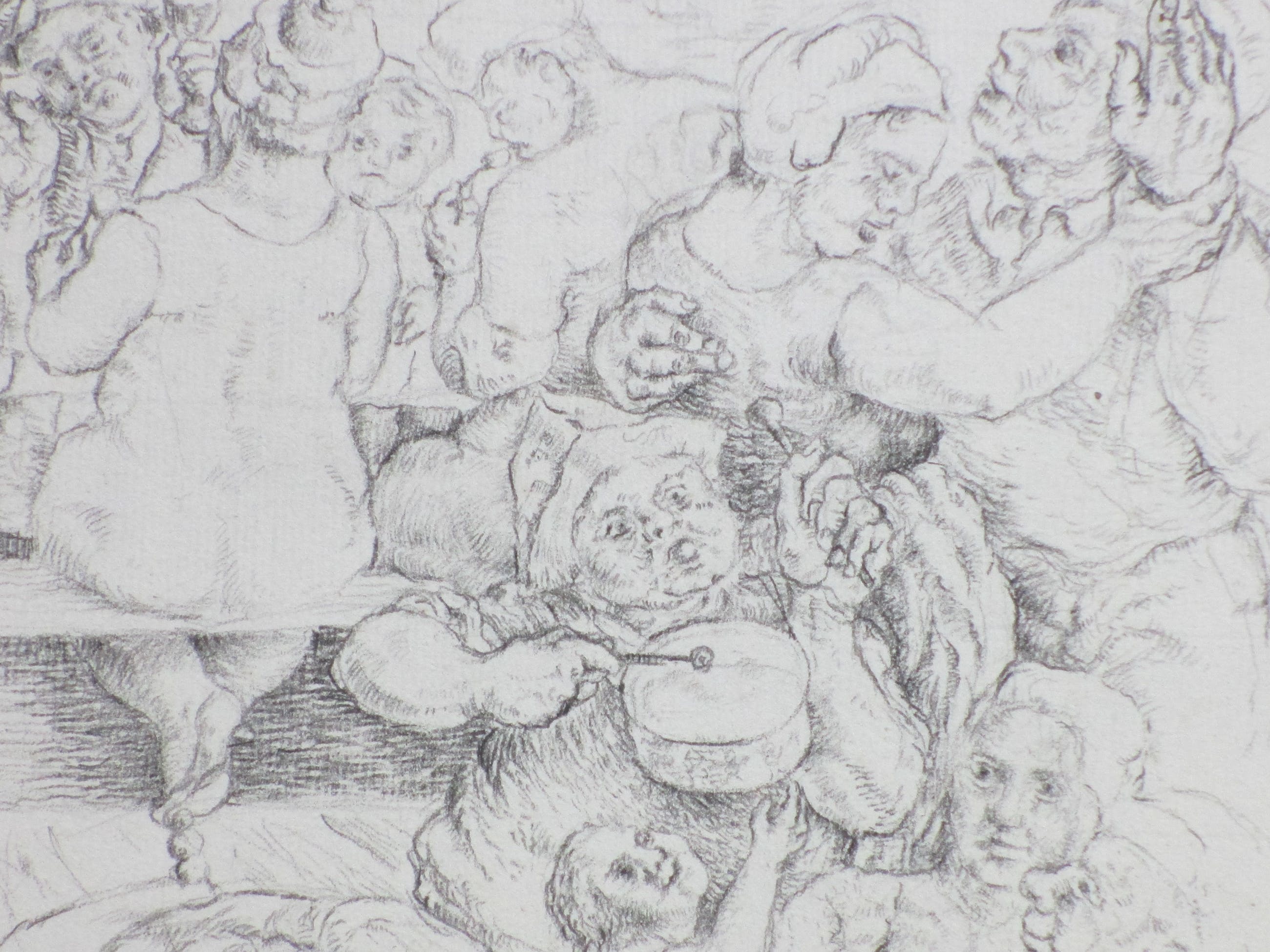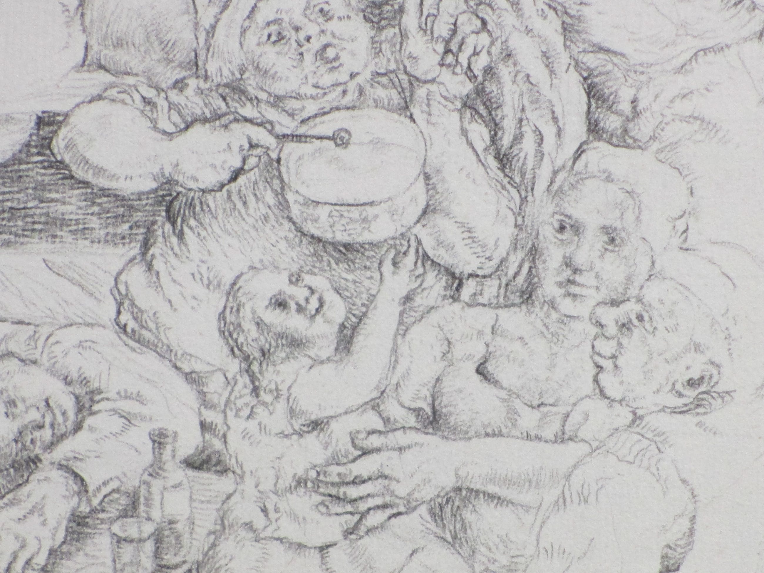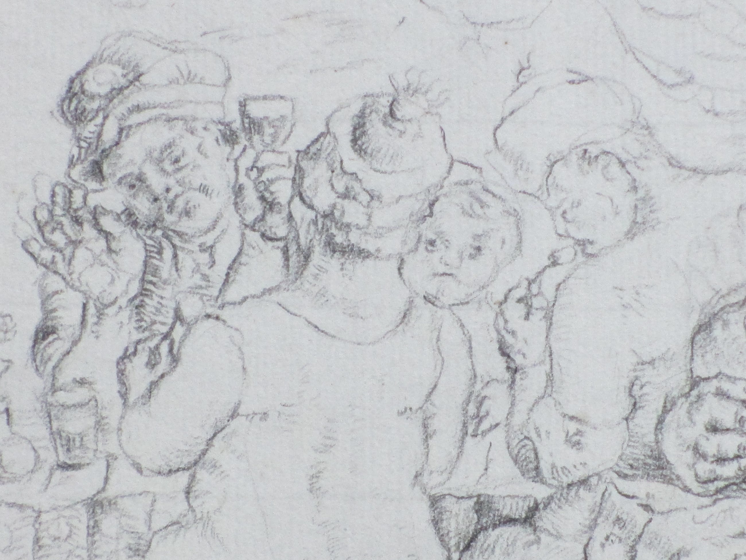 Tekening door Fer Hakkaart. Voorstelling van een feestend gezelschap. Tekening onder passepartout, beeldmaat 19x20, p.p.maat 35x50 Gesigneerd en gedateerd rechtsonder: 'F.Hakkaart 7-7-'63' Authenticiteit volledig gegarandeerd.