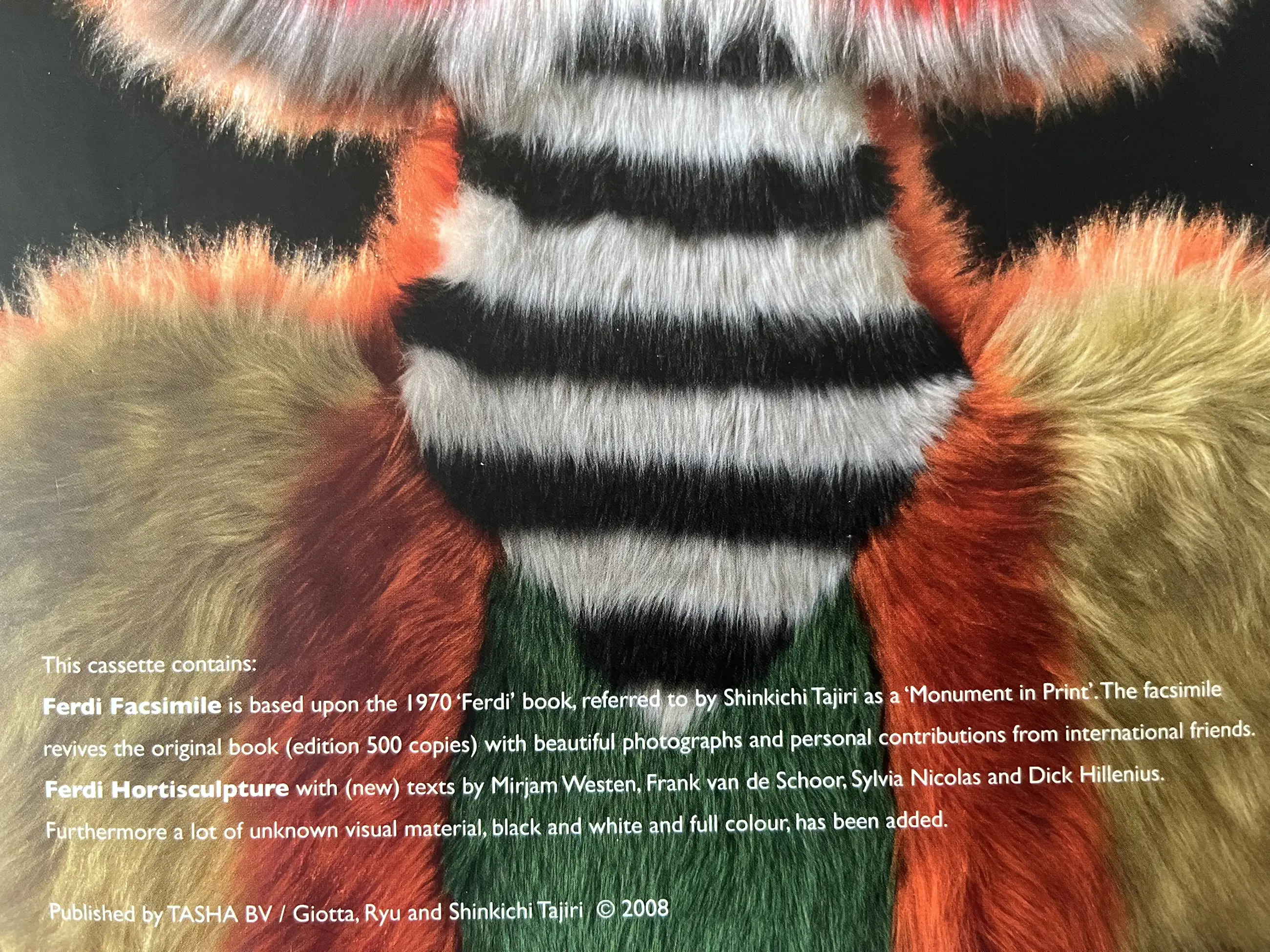 Twee boeken in een slipcase. Het boek FERDI FACSIMILE is samengesteld en , met opdracht, gesigneerd door haar echtgenoot TAJIRI. Het boek HORTISCULPTURE is samengesteld door haar dochters. Beide boeken zijn Engelstalig. Verder nog een catalogus met een stoffen zebramotief uitgegeven bij de expositie in 1992 bij het Haags Centrum voor Beeldende Kunst. Ingesloten zit ook de uitnodiging voor deze expositie. Als laatste een groenkleurige uitklapbare catalogus van een eerdere exposite.