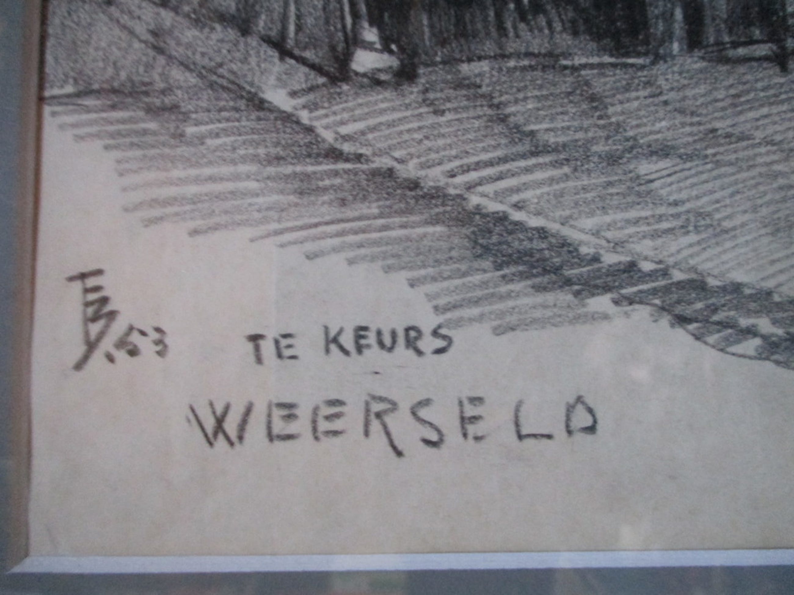 Voor de laatste keer aangeboden: potlood/krijtt/houtskooltekening van een boerderij van Ferdinand Boersma (1906-1979), mooi en netjes ingelijst in grijs passepartout met goudkleurige houten lijst achter glas. Beeld 42x29 cm lijst 57,2x47,2 cm Titel: “Te Keurs Weerseld “1953, l.o gesigneerd, info op achterkant. Bij foto's helaas wat spiegeling: dit zijn geen vlekken.
