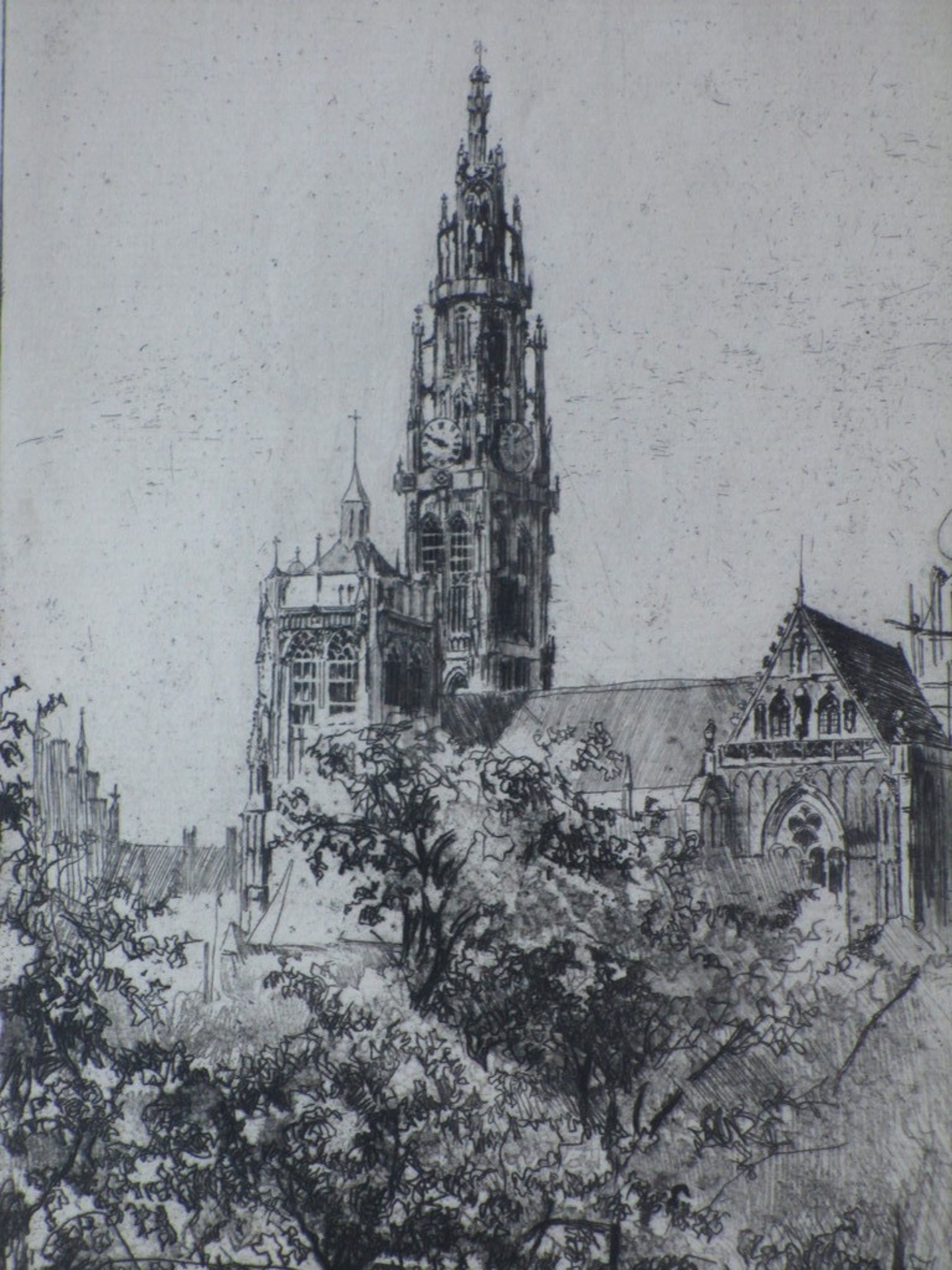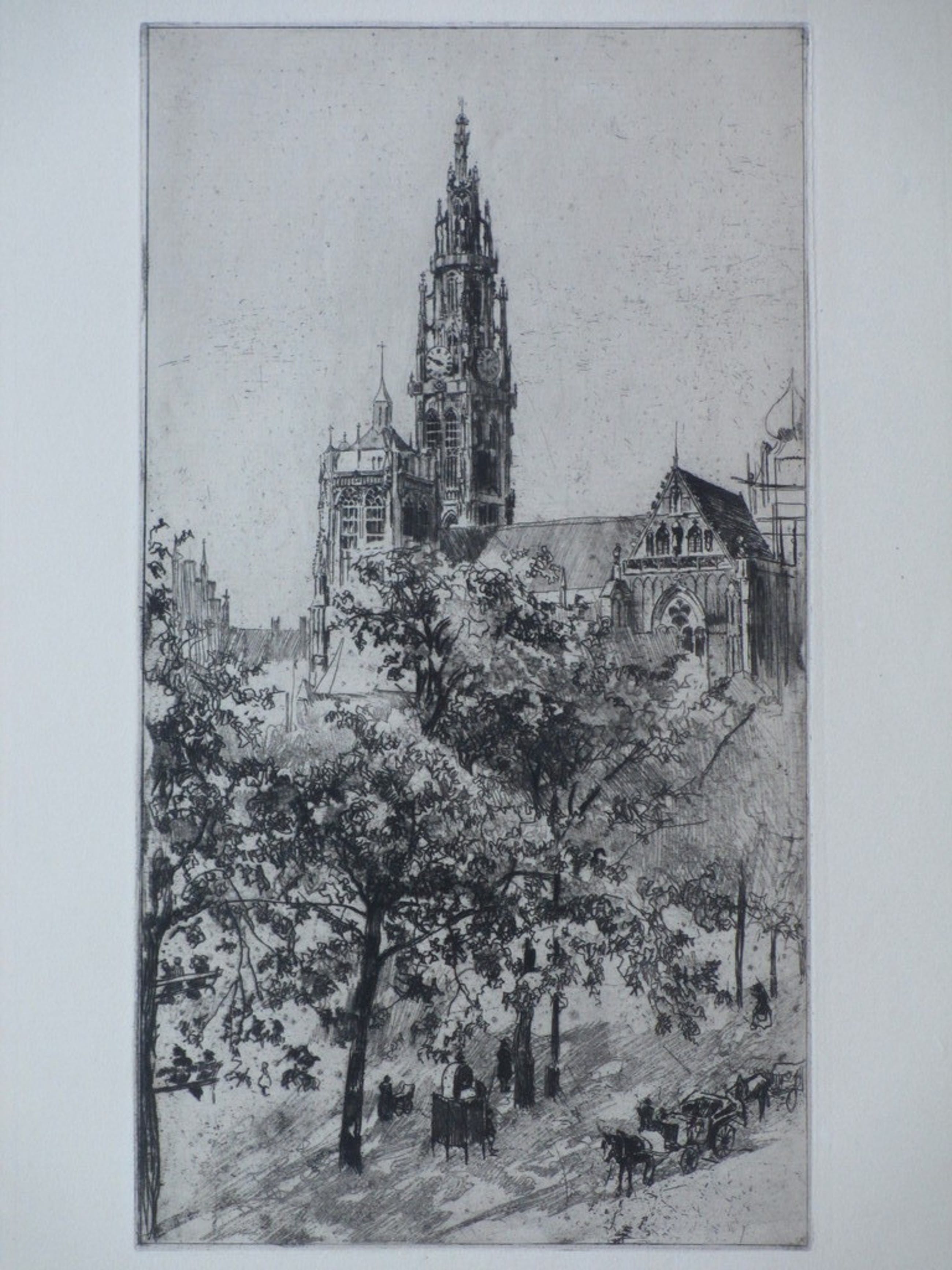Voorstelling met een gezicht op de OLV Kerk in Antwerpen en plein met koetsjes eronder