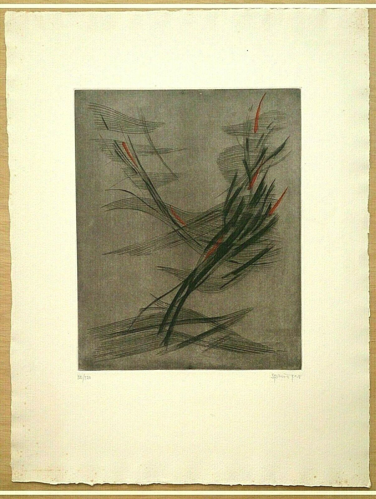 Titel: „Brumes I“, 1956 Original-Farbradierung (Grabstichel und Auatinta) auf Kupferdruckpapier / Bütten, ca. 28,5 x 23 cm (Plattengröße) auf 48 x 37 cm (Blattgröße). Mit Bleistift handsigniert rechts unter dem Motiv und als "E.A." bezeichnet (Abzug für den Künstler), ein zweites Mal handsigniert einige zentimeter tiefer. Auflage 120 Exemplare. Ganzseitige Abbildung der Graphik im maßgeblichen Werkverzeichnis Höfchen 121. Wie von Springer gewohnt souveräne, prägnante Ausführung und hervorragender Druck mit dem vollen Rand. Drucker: Atelier Lacourière, Paris.