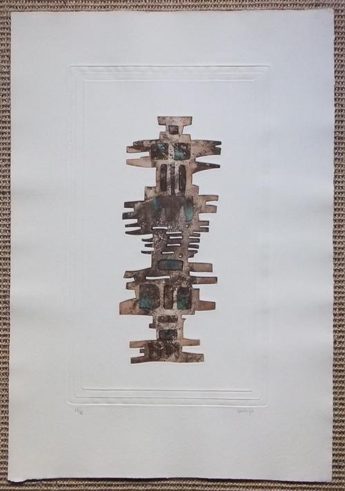 Eine der wunderbaren, klaren und archaisch wirkenden Original-Druckgraphiken des Künstlers, Titel: "Astaroth (Die große Windorgel)". 1960. Farbradierung (Grabstichel und Aquatinta) auf noblem chamoisfarbenem "Richard de Bas"- Kupferdruckpapier (Papier ist gelblicher als auf dem Scan) 480 x 286 mm (Plattengröße) auf 658 x 463 mm (Blattgröße). >>>>>>>>>>>>>>>>>>>>>>>>>>>>>>>>>>Das Papier mit reizvollen plastischen, parallelen Prägungslinien, offensichtlich durch 3 verschieden große Druckplatten entstanden. Mit Bleistift handsigniert + nummeriert.