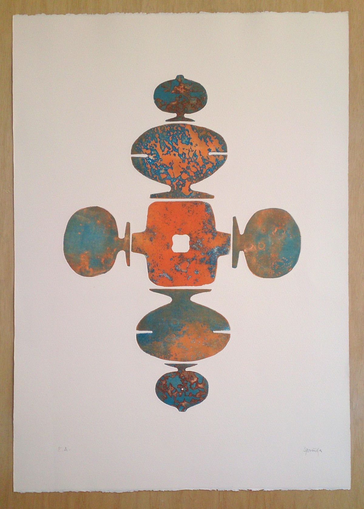 Dem Werkverzeichnis von Dr. Heinz Höfchen ist zu entnehmen, dass Ferdinand Springer in den 1960/70er Jahren bevorzugt mit ausgeschnittenen Formen gearbeitet hat. Abgebildet in dem maßgeblichen Standardwerk ist ein meinem Angebot ähnliches Motiv in Kreuzform. Dieses wurde von Höfchen unter der Nr. 257 wie folgt beschrieben; "Cuxa" 1971 Farbradierung (Aquatinta), 5 zugeschnittene Formen kombiniert, 320 x 403, 8 Exemplare.