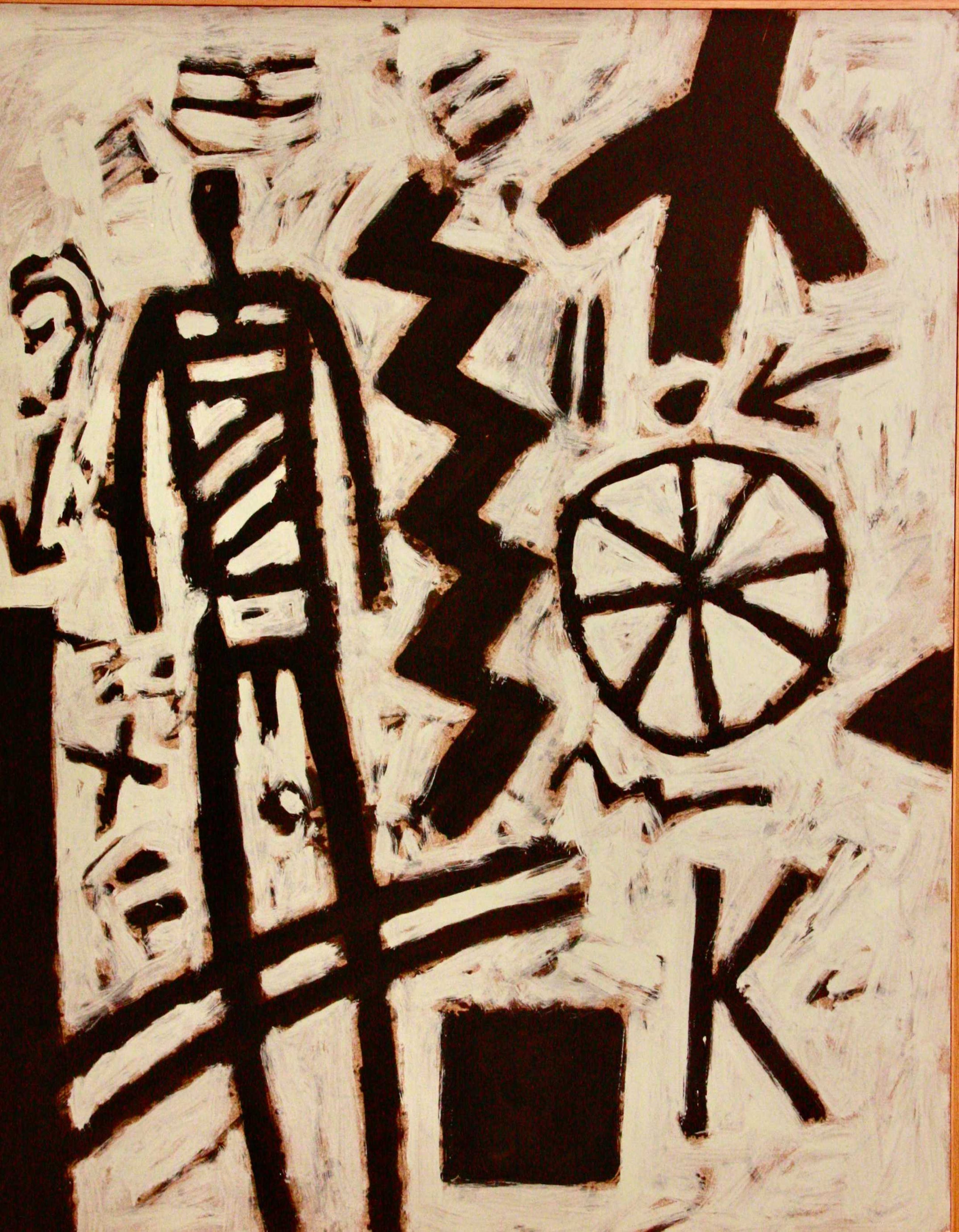 Ferenc Gögös (1936-2011), born in Budapest, came to the Netherlands in 1957, when his freedom was threatened in his homeland. He enrolled at the Academy of Arts in Arnhem to study painting and graphic arts. His works are composed of signs, messages that communicate their meaning. The image replaces language. If one emerges oneself into the works, one discovers several recognizable images, like a man, a woman, a deer, a bird or a tree. Other signs only make sense in combination with the surrounding images. Darts, zigzags, edges, and straight lines connect these symbols. Gögös symbols relate to popular arts or “primitive” arts which gives them a universal character. His Hungarian origins can be sensed especially in the early works. Tingling color planes comprising monumental signs are witness to a great sensibility for materials and colors.