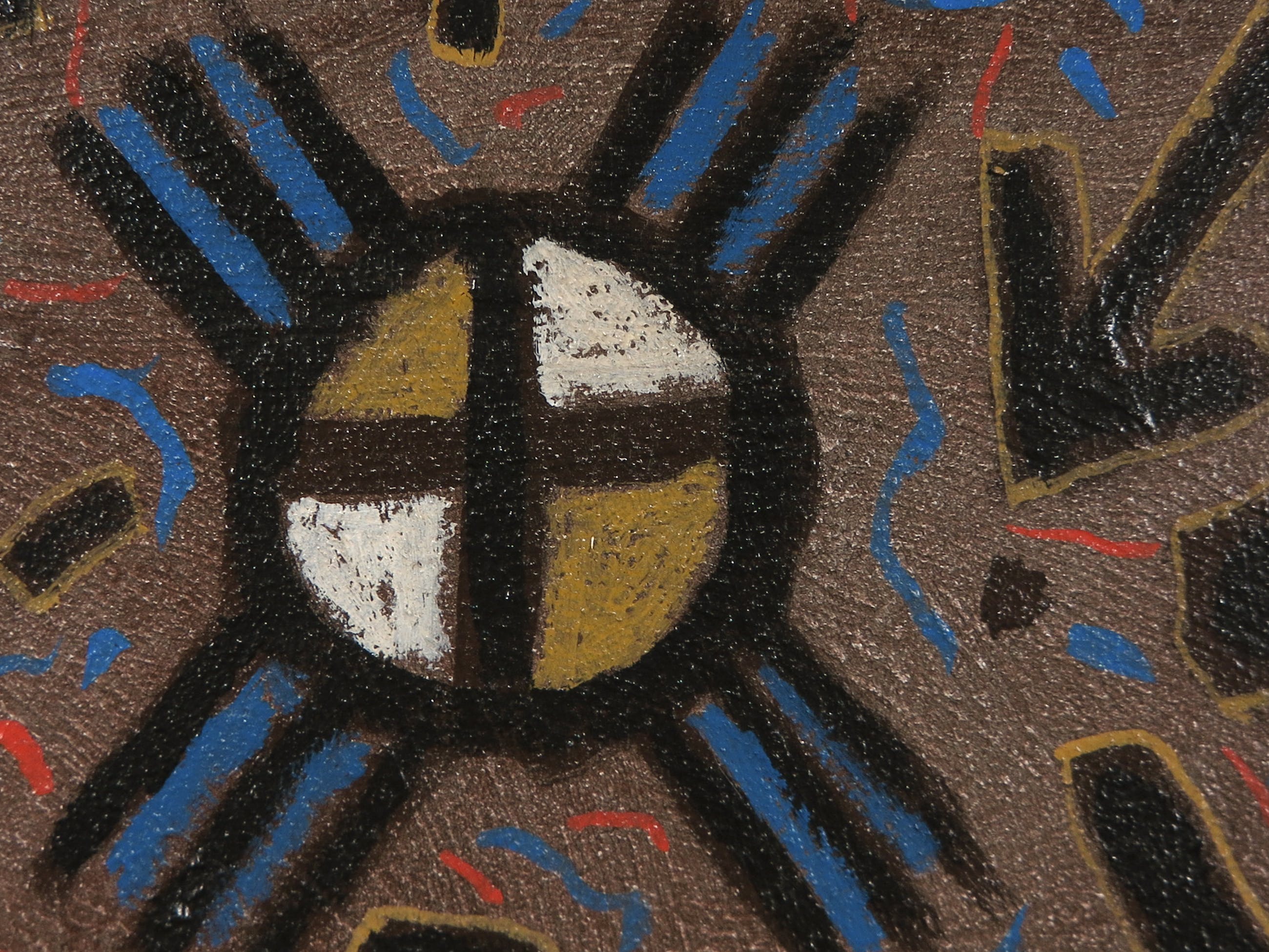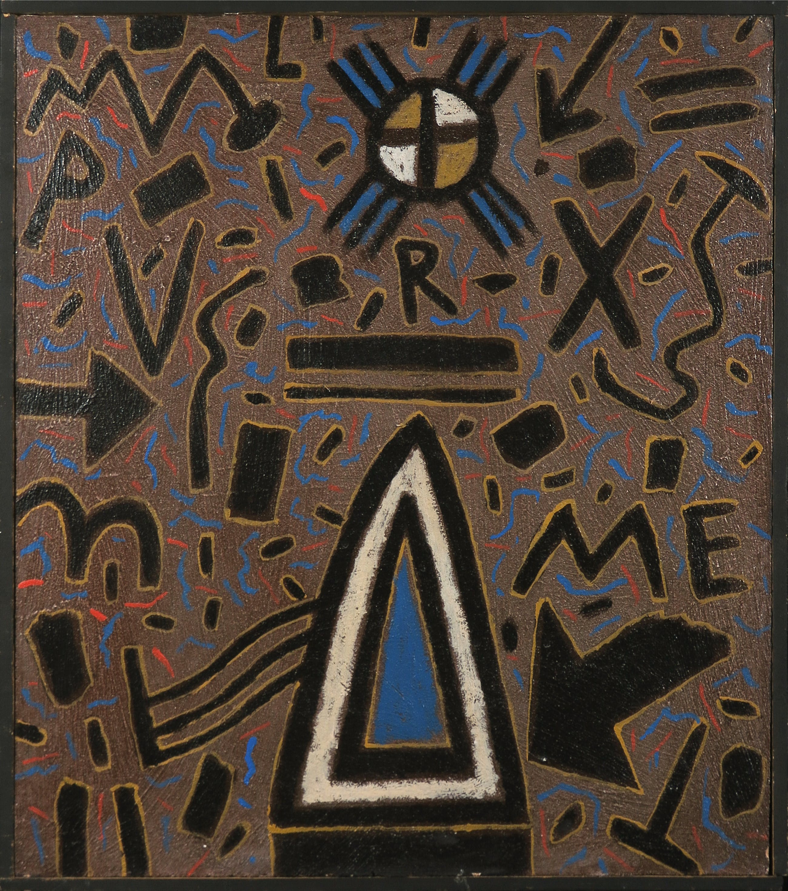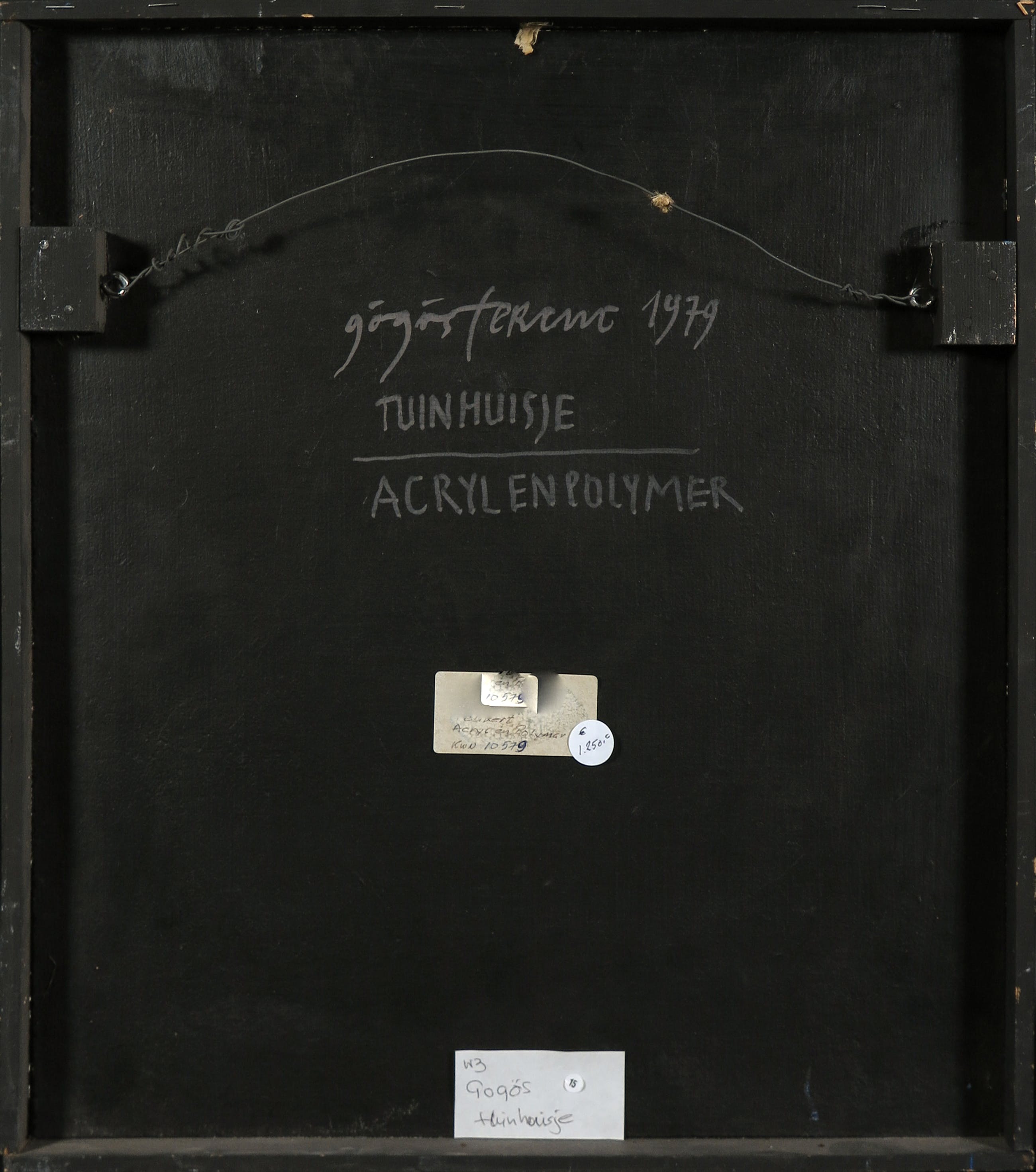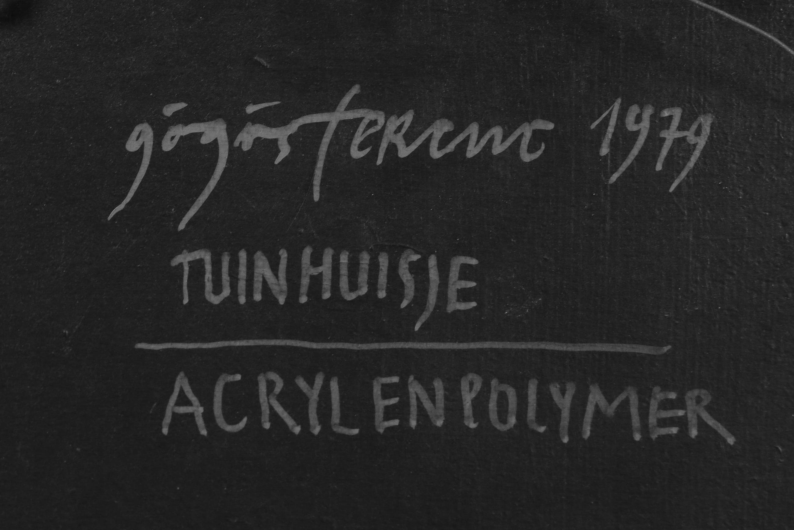 Acryl en polymer op paneel, ingelijst in een zwarte houten lijst.