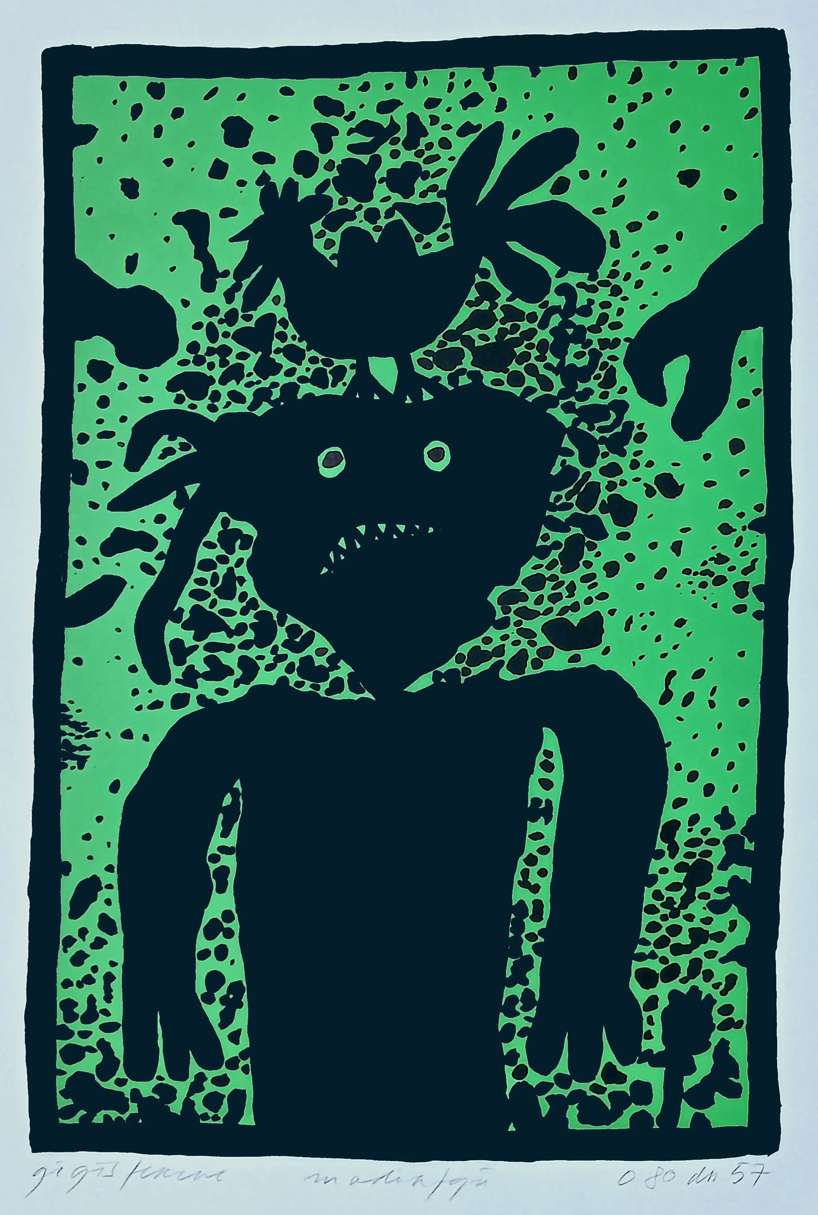 Krachtig, herkenbaar werk van de Hongaars-Nederlandse kunstenaar Ferenc Gögös. Linosnede op dik papier, met potlood gesigneerd, getiteld (Madarfeju?) en gedateerd en/of genummerd(?) In zeer goede conditie.
