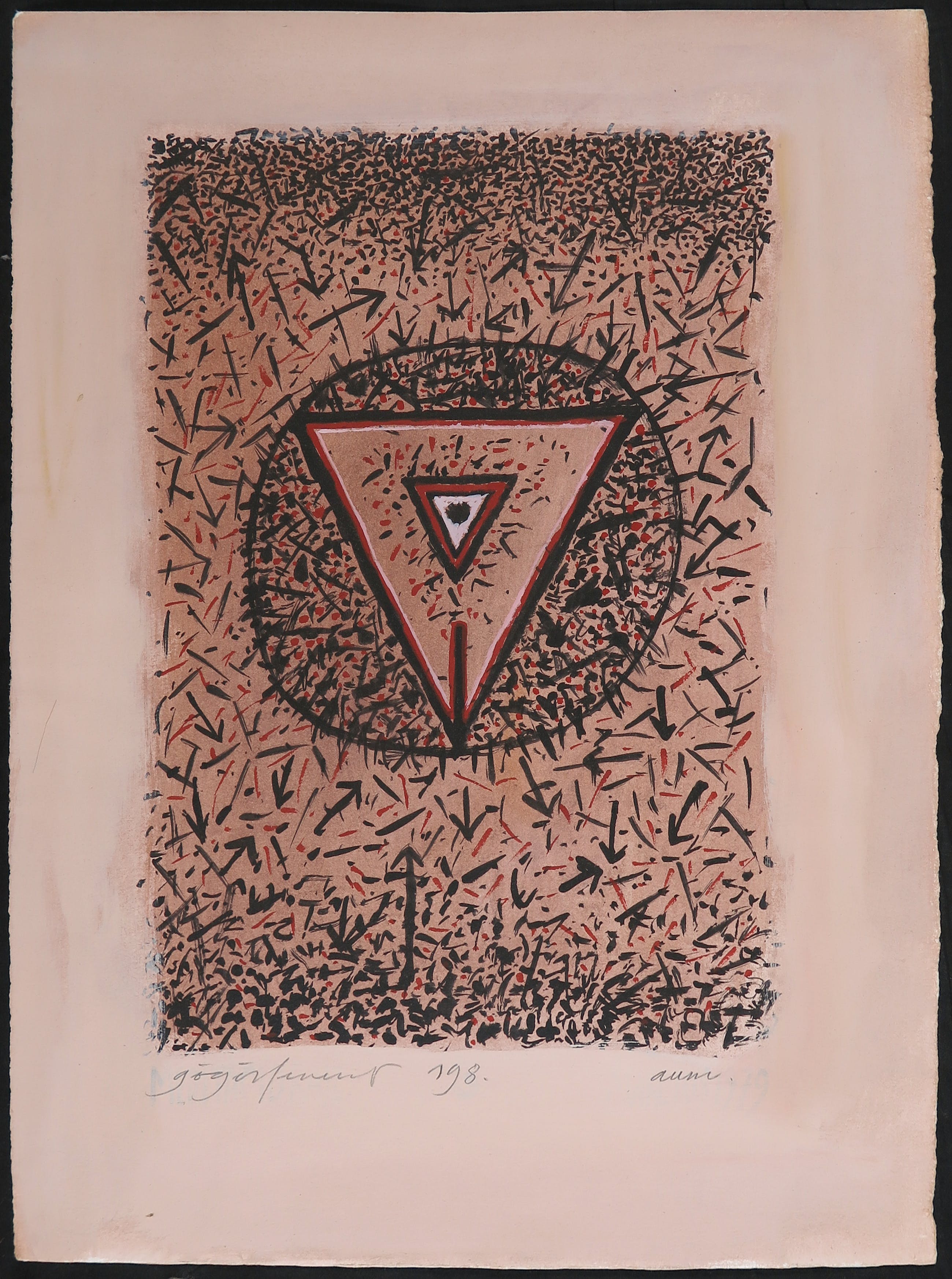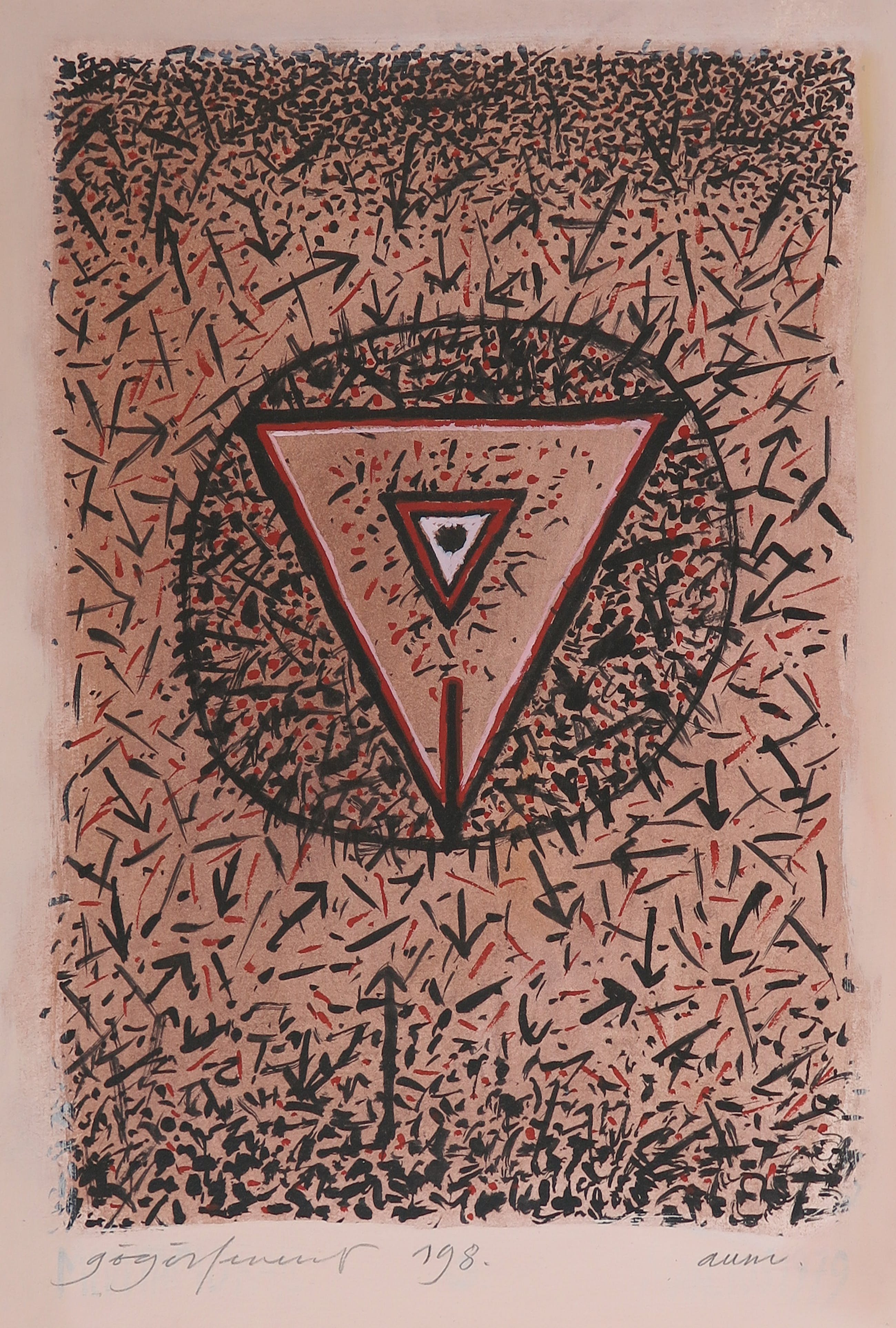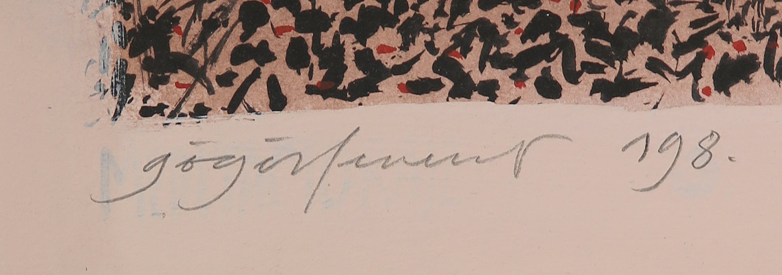 Gouache op papier door de Hongaarse kunstenaar Ferenc Gögös. Langs de onderste rand gesigneerd, gedateerd en onleesbaar getiteld.