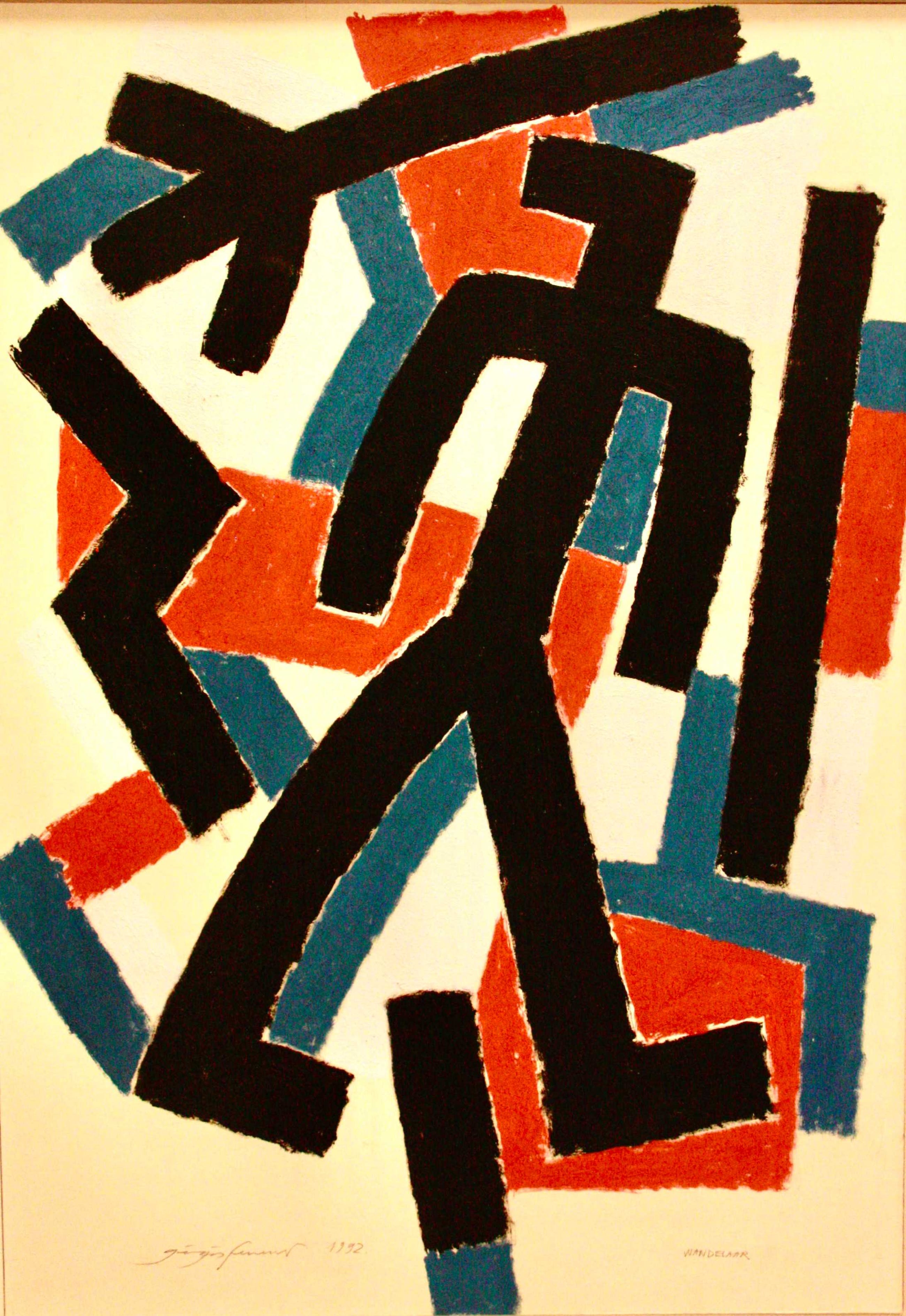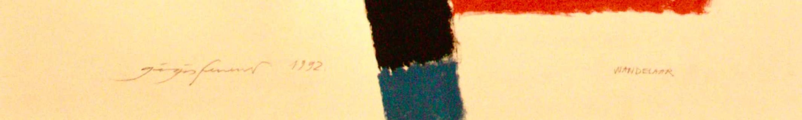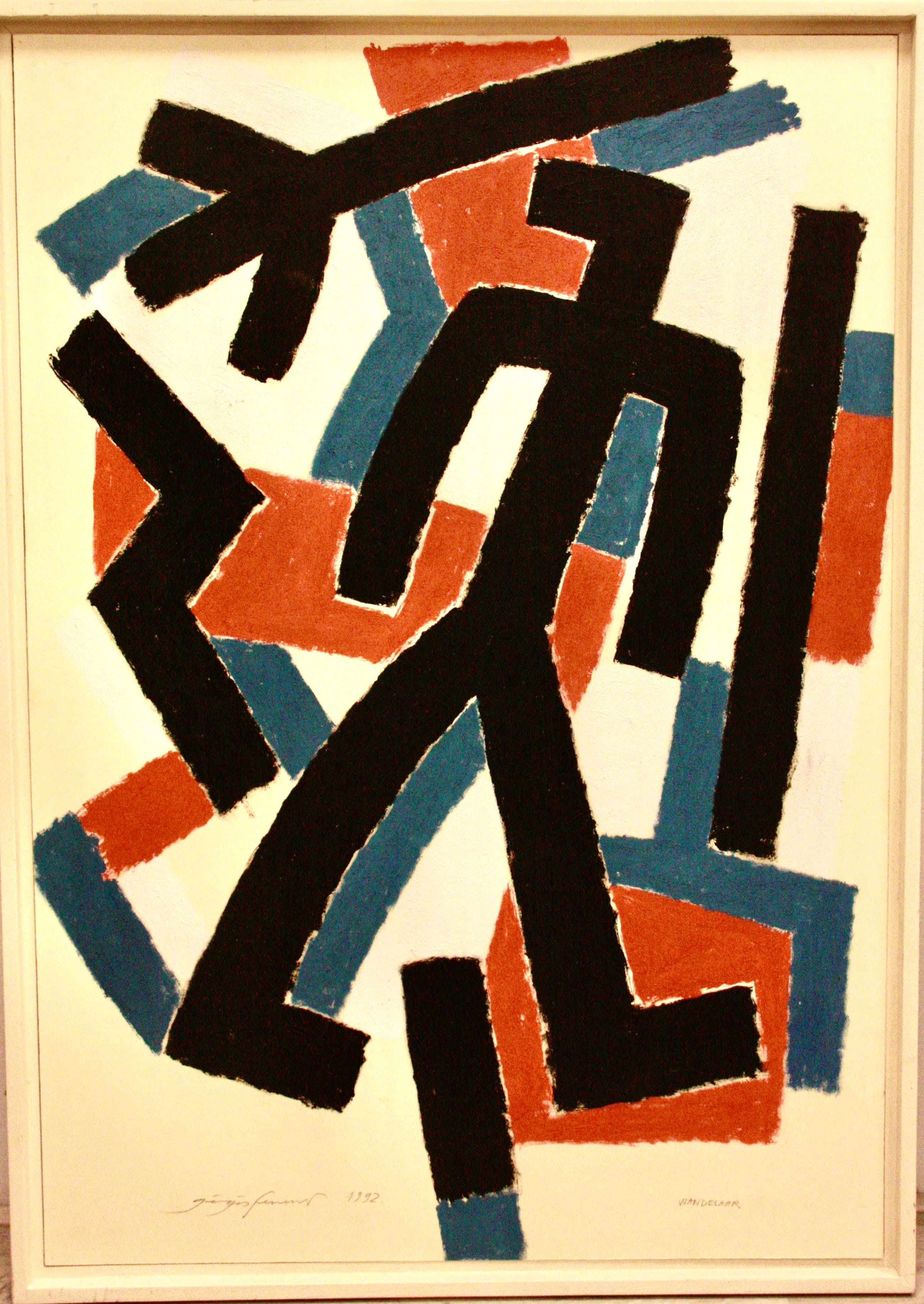 Ferenc Gögös (1936-2011), born in Budapest, came to the Netherlands in 1957, when his freedom was threatened in his homeland. He enrolled at the Academy of Arts in Arnhem to study painting and graphic arts. His works are composed of signs, messages that communicate their meaning. The image replaces language. If one emerges oneself into the works, one discovers several recognizable images, like a man, a woman, a deer, a bird or a tree. Other signs only make sense in combination with the surrounding images. Darts, zigzags, edges, and straight lines connect these symbols. Gögös symbols relate to popular arts or “primitive” arts which gives them a universal character. His Hungarian origins can be sensed especially in the early works. Tingling color planes comprising monumental signs are witness to a great sensibility for materials and colors.