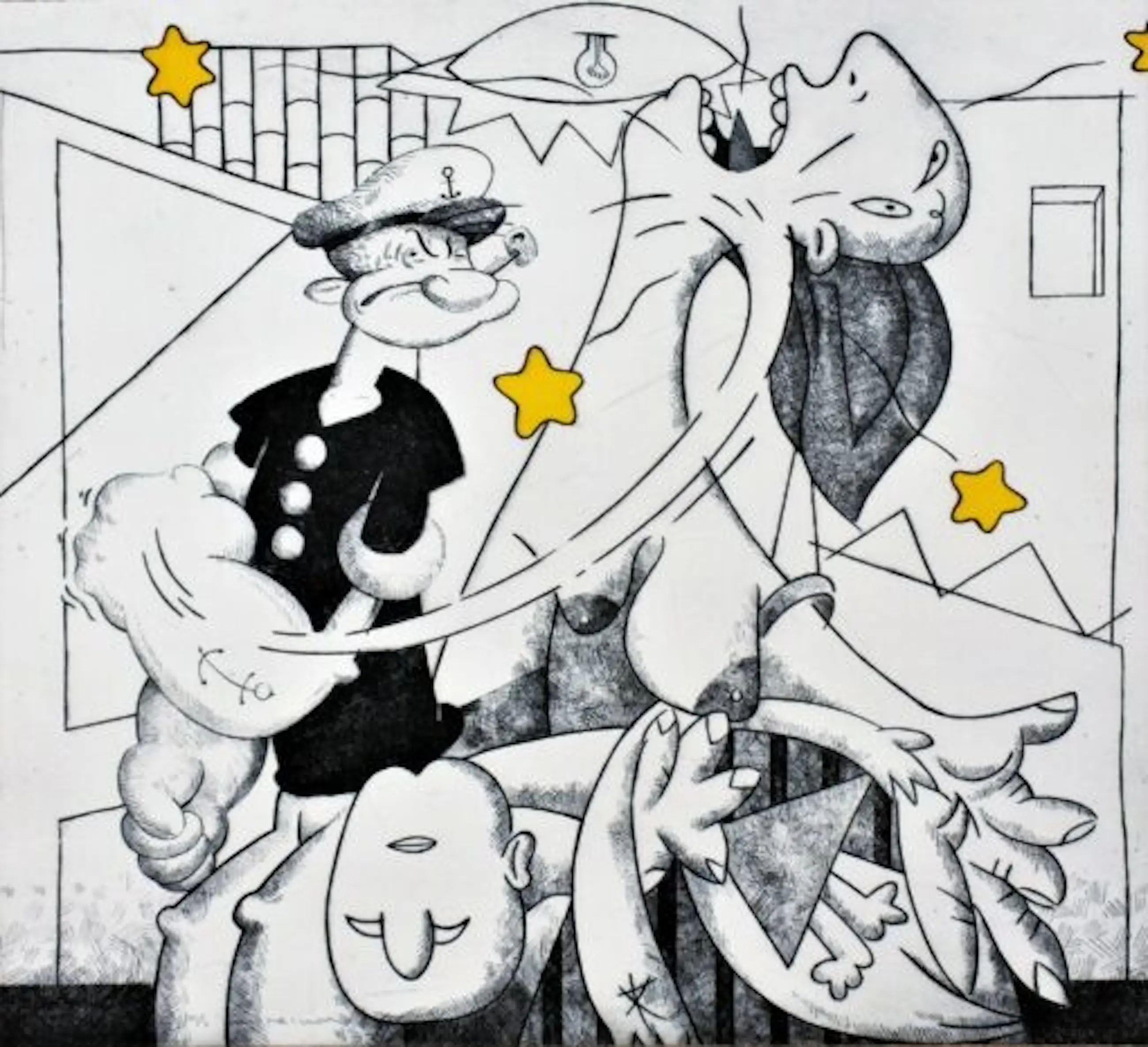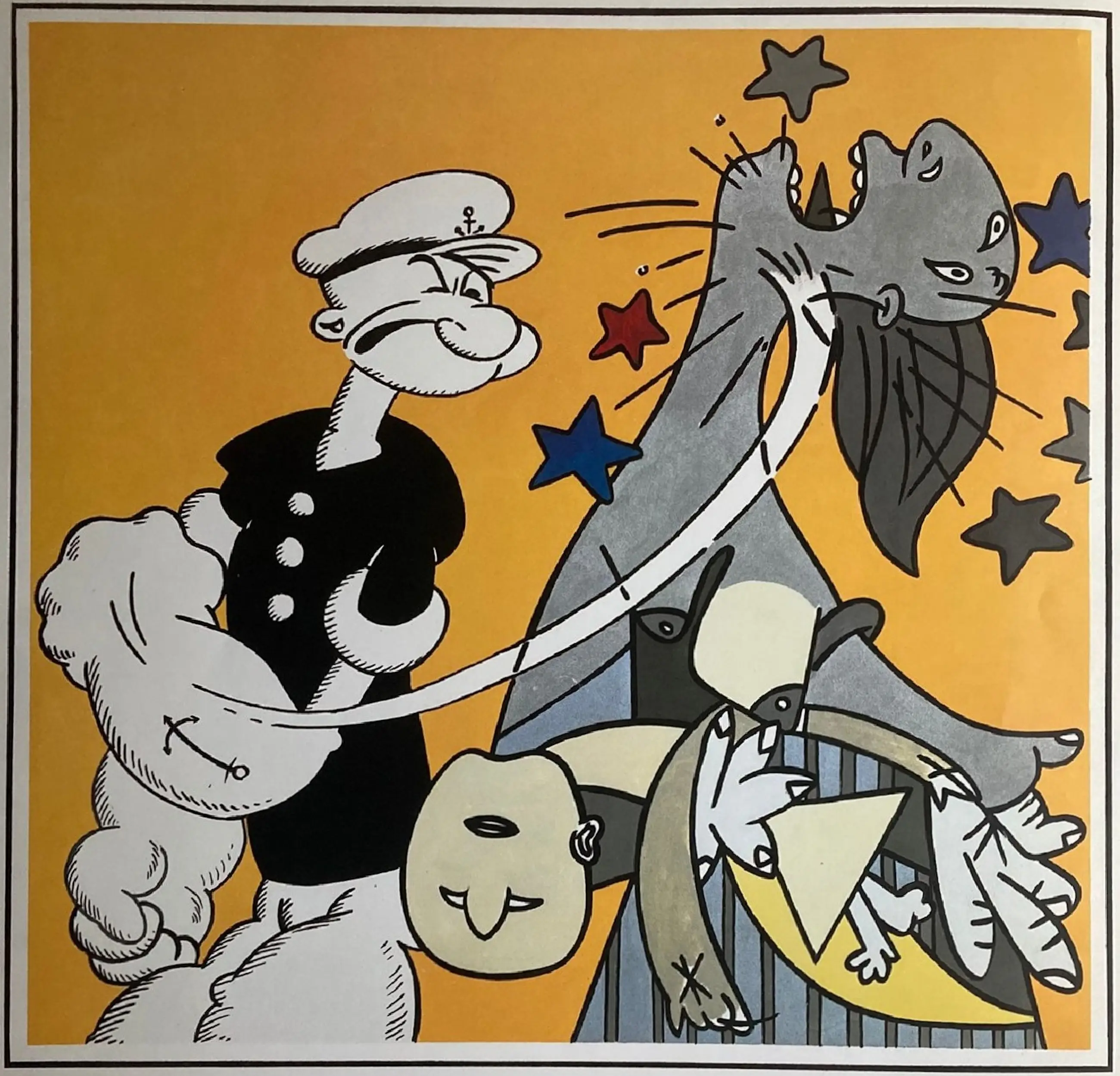 Een affiche uit 1990 naar een ets (zie de 7e foto) van de Spaanse kunstenaar Fernando Bellver (1954). De afbeelding op het affiche combineert het stripfiguur Popeye met het schilderij van Pablo Picasso "Guernica" en is gemaakt naar aanleiding van de expositie in de 4RT Gallery in Barcelona in het voorjaar van 1990. -Afmetingen: Blad, 94 x 70 cm. Totale beeld, 86 x 68 cm. Beeld, 65 x 68 cm. -Herkomst: Uit de inboedel van het Strip Distributie Centrum / Het Raadsel. -Conditie: In zeer goede staat. Zie ook de foto’s.