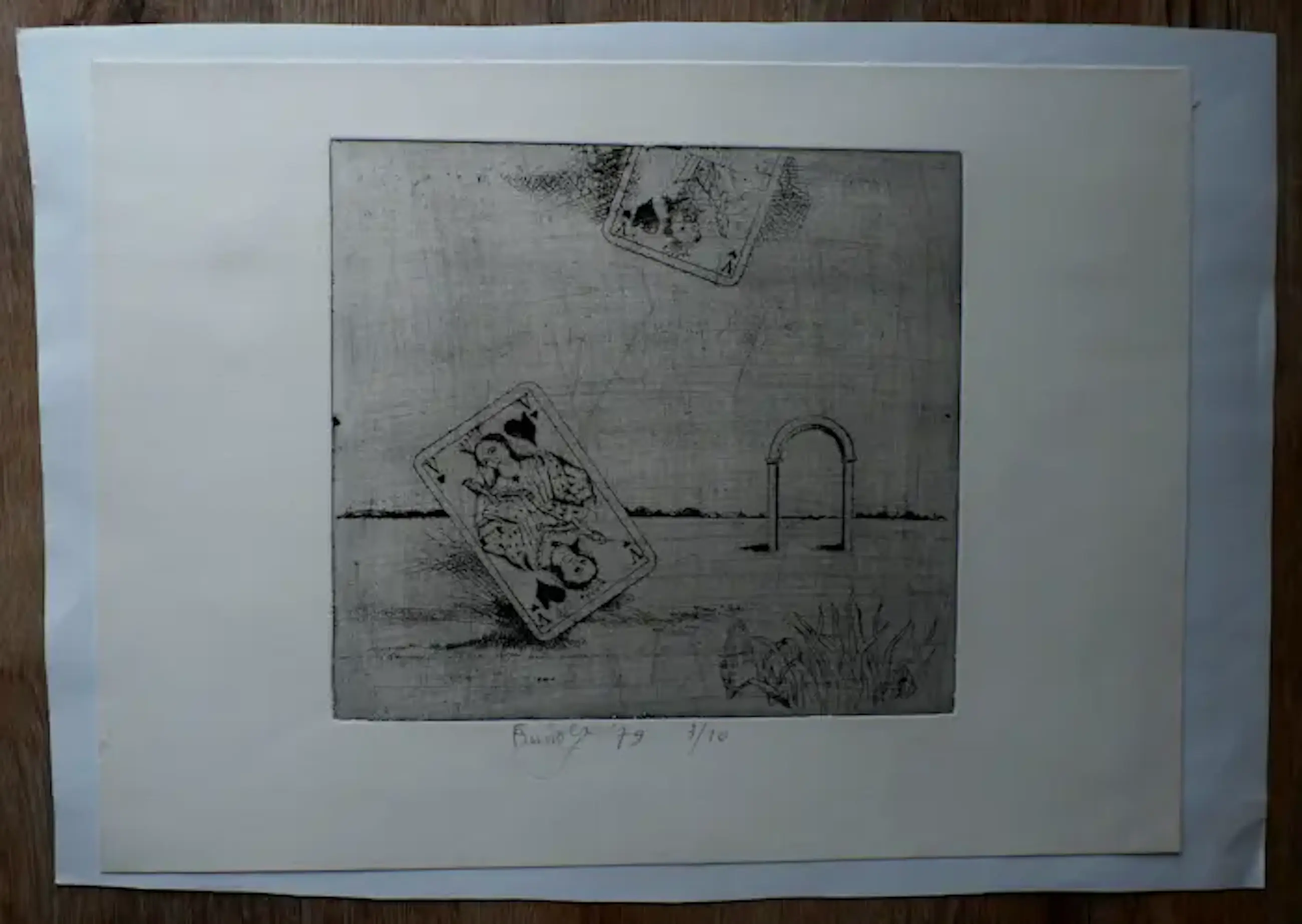 Ets van Ferry Bunder uit 1979. Afmetingen blad: H31 xb42cm. Afmetingen voorstelling: H22,3 x b24 cm. Het werk is midden onder, met potlood, gesigneerd door de kunstenaar. De authenticiteit van het aangeboden werk wordt volledig gegarandeerd. Een certificaat van echtheid kan, op aanvraag, worden gemaild.