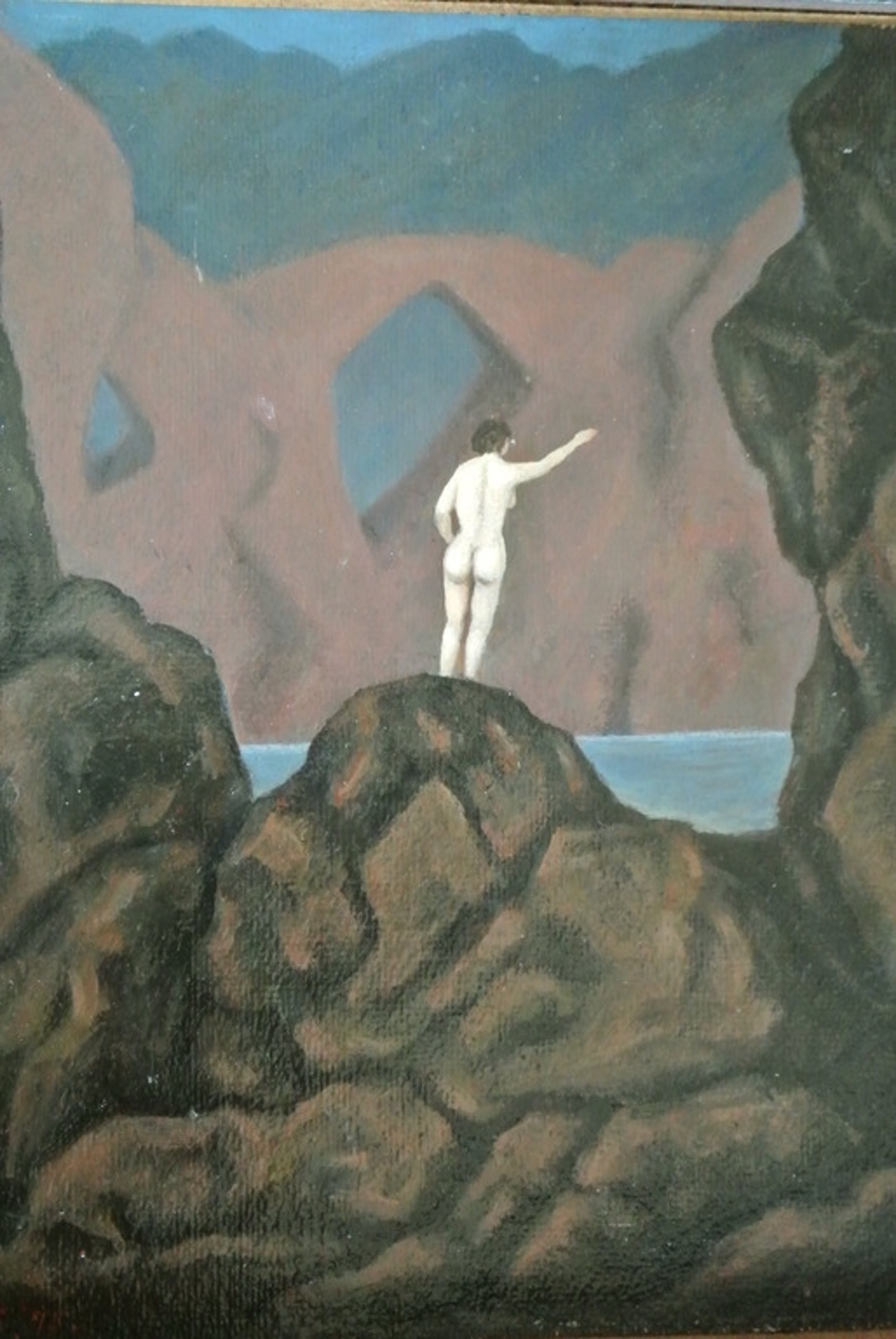Mooi schilderij van de nieuwe haagse school kunstenaar Ferry Slebe uit de 60er jaren van een man die uitkijkt op een bergmeer. Het schilderij is in goede staat en is eenvoudig gelijst.Het werk is lo gesigneerd. Het werk heeft gehangen en is in de 60er jaren verkocht op een tentoonstelling in Pulchri studio. Kosten van verzending zijn 20 euro