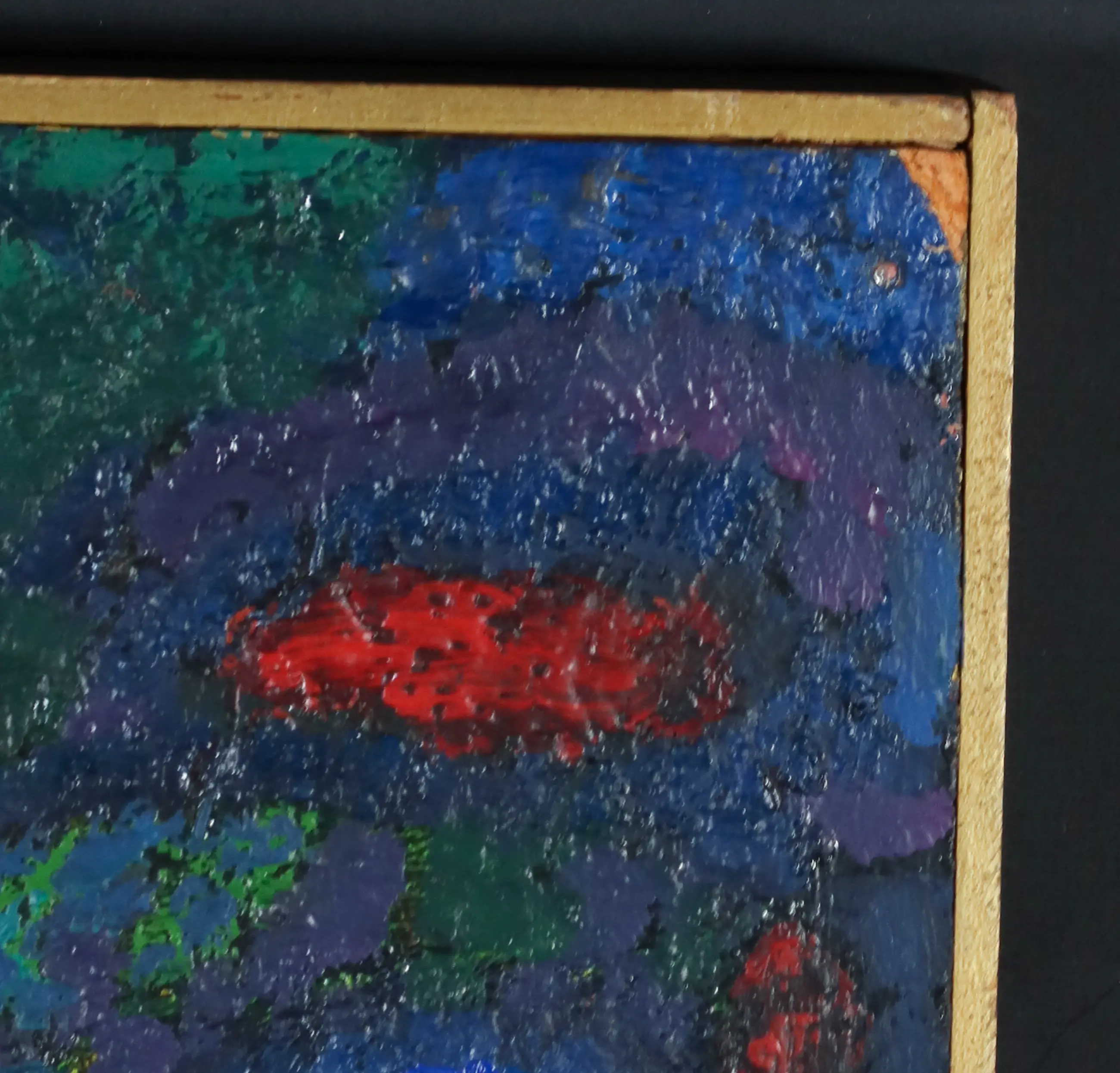 | De hoek rechtsboven heeft een beschadiging. Plekjes verfverlies langs e rand links-midden (alleen bovenste verflaag). | |