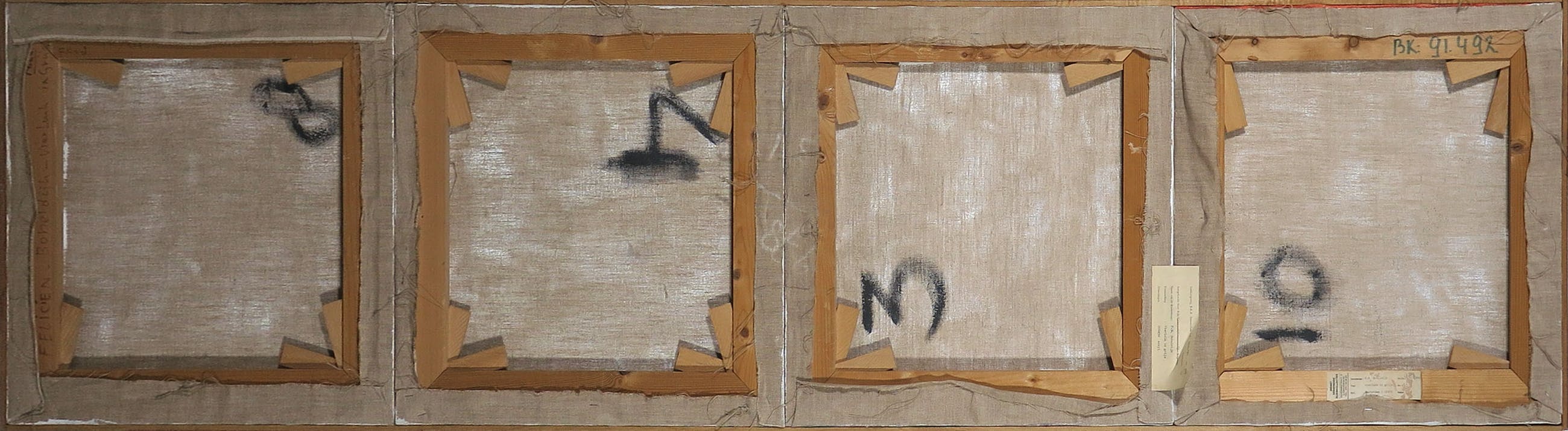 | Spieramen moeten opnieuw opgespannen worden, waardoor de doeken in de hoeken wat trekken. Wat slijtage langs de randen en hoeken. Er zit een breuk in de lijst (zie laatste foto). | |