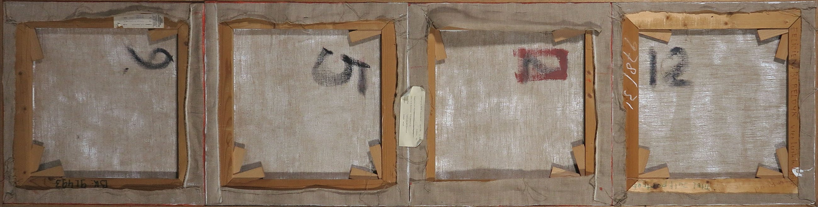 | Spieramen moeten opnieuw opgespannen worden, waardoor de doeken in de hoeken wat trekken. Meerdere zichtbare deuken/deukjes in de doeken. Wat slijtage langs de randen en hoeken. | |