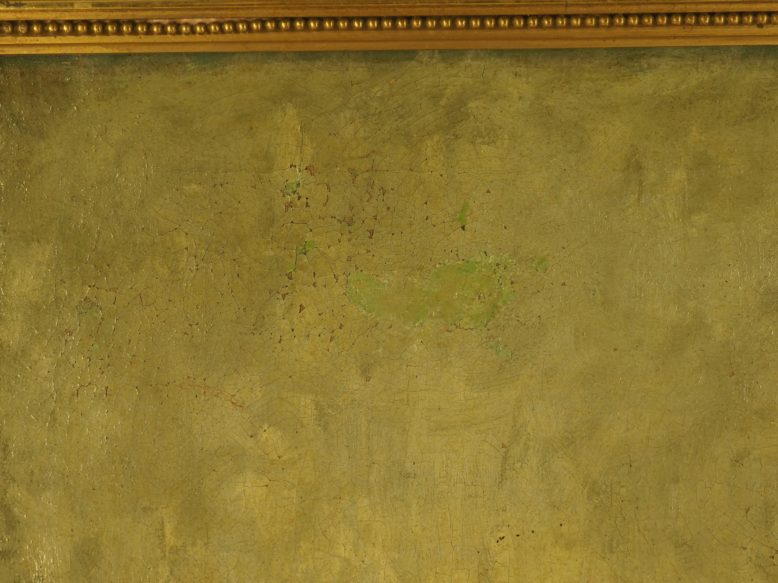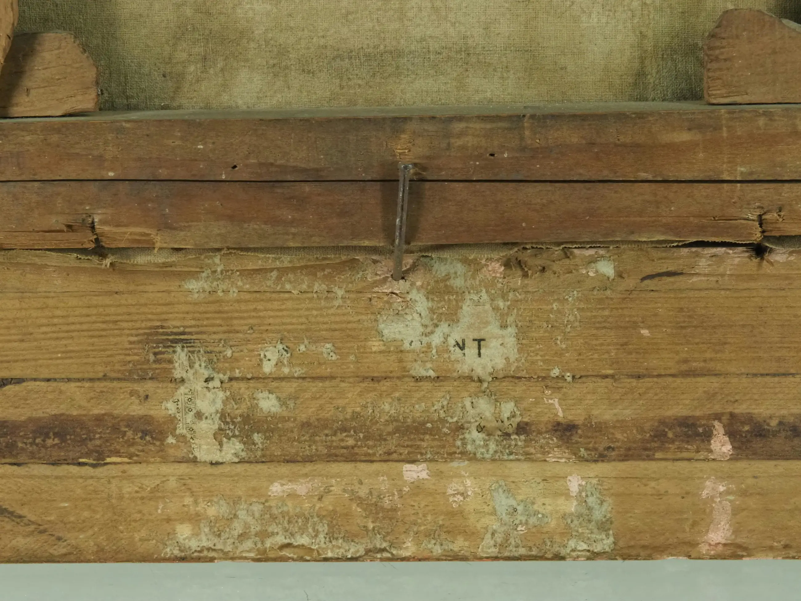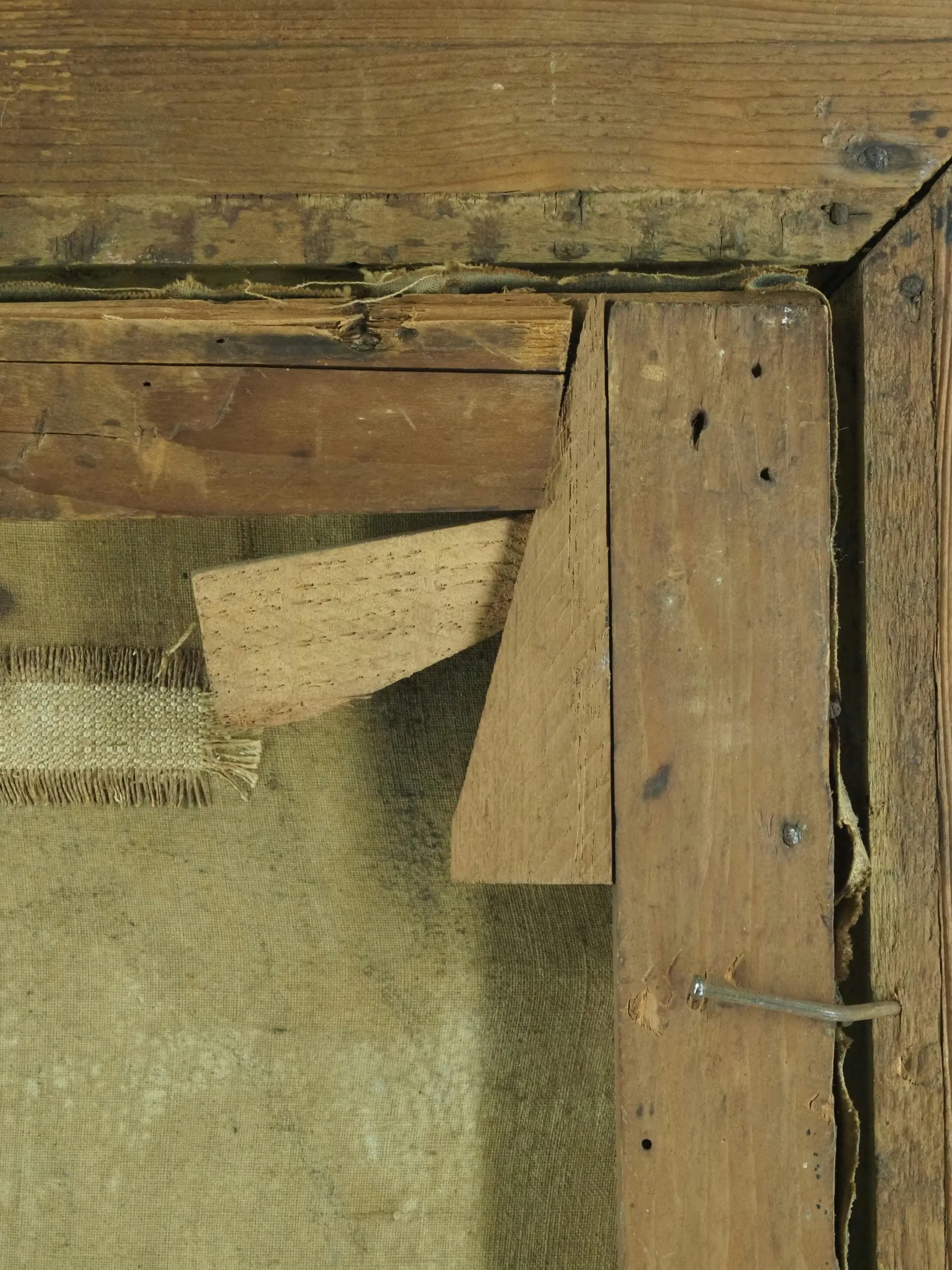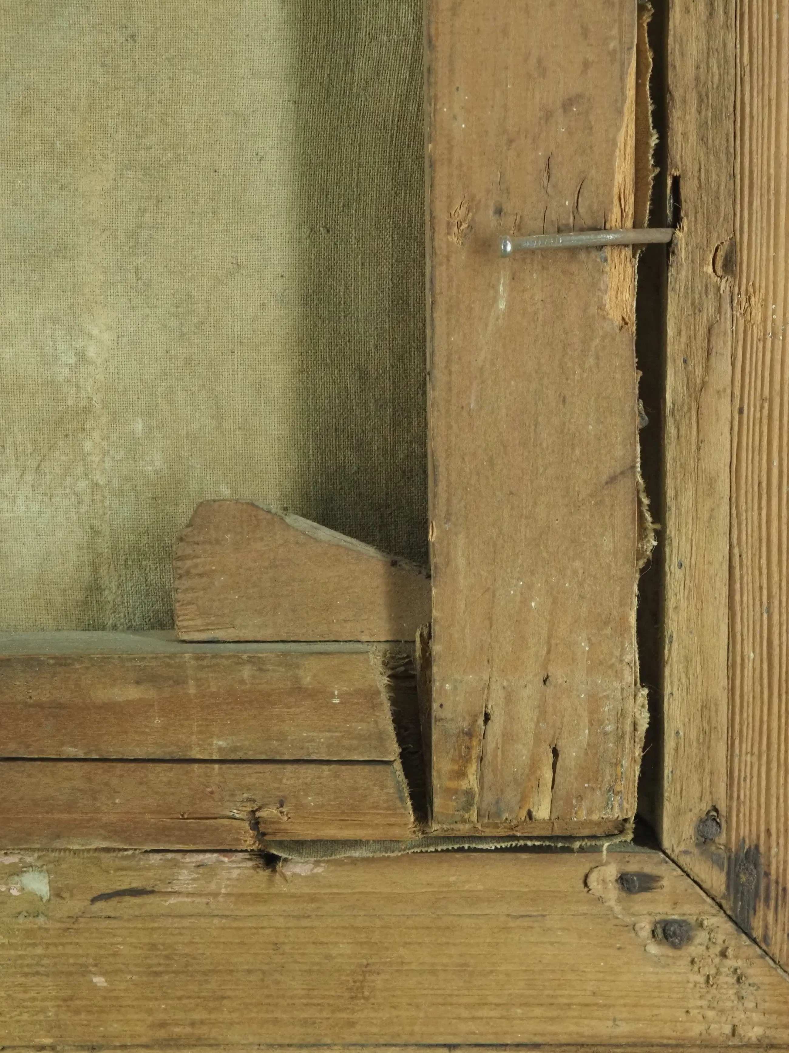 Schilderij: Er zijn tekenen van een eerdere, professioneel ogende reparatie zichtbaar, links van het midden, bovenin (zoals te zien op de detailfoto's van de voor- en achterzijde).