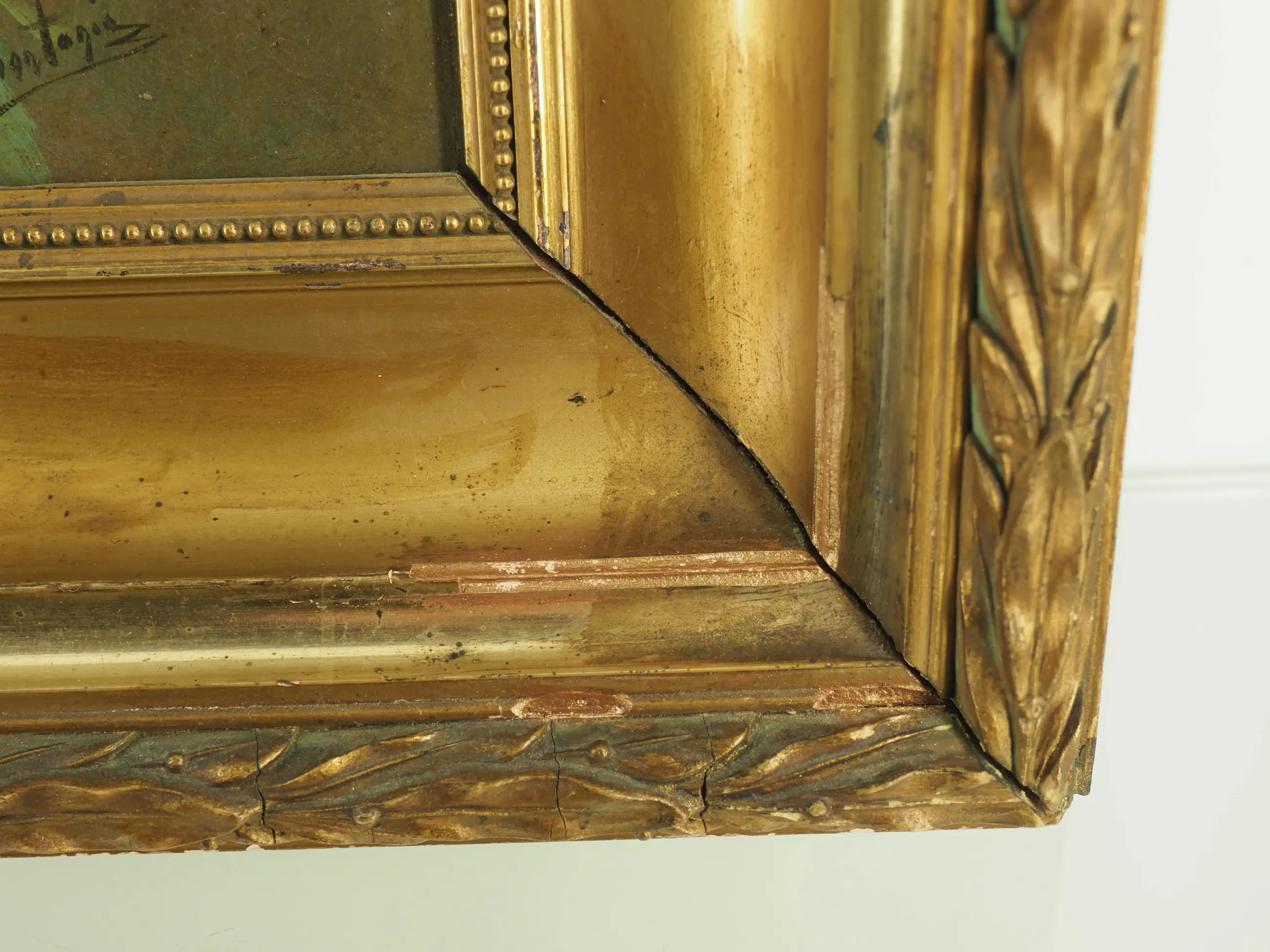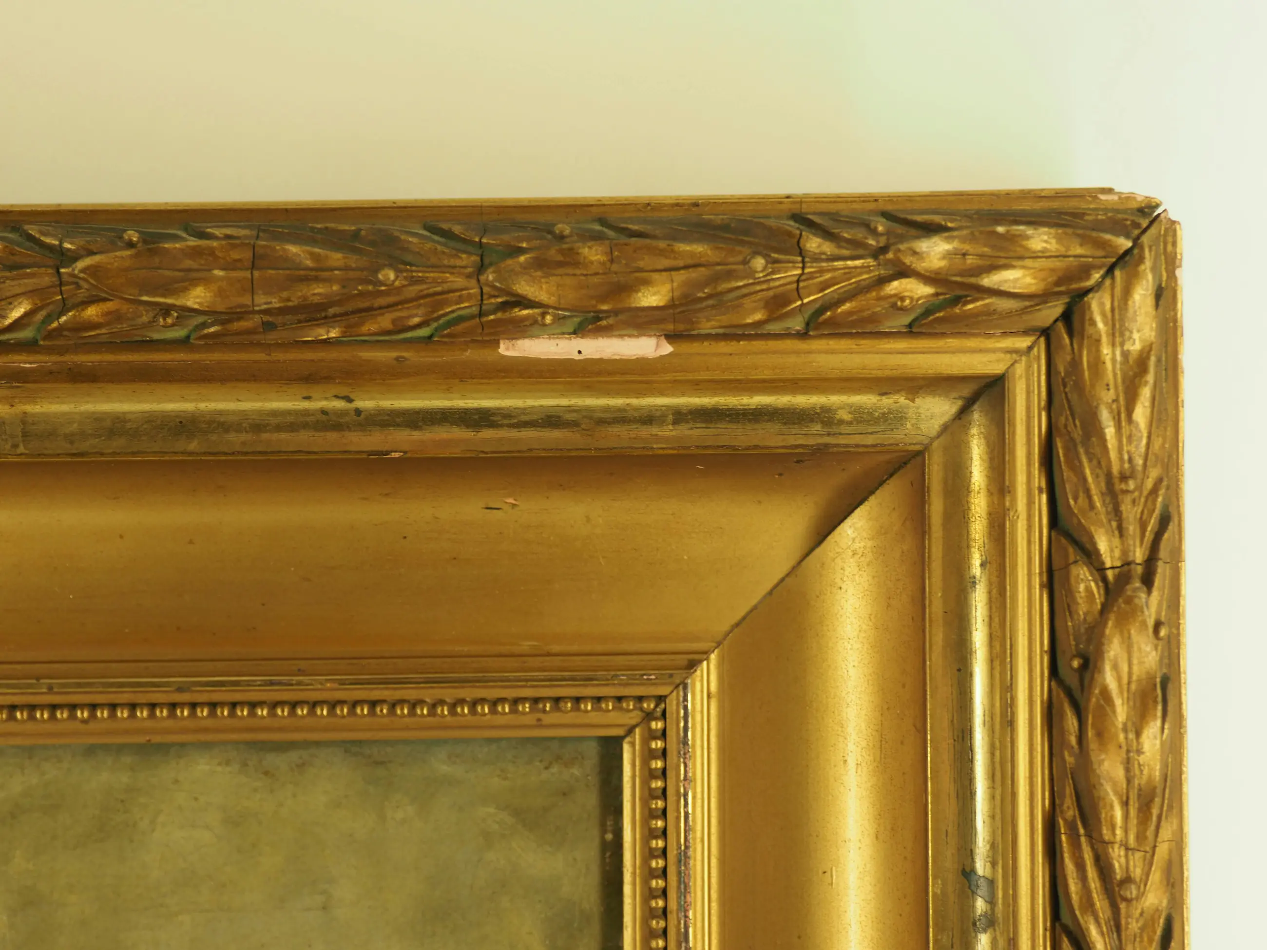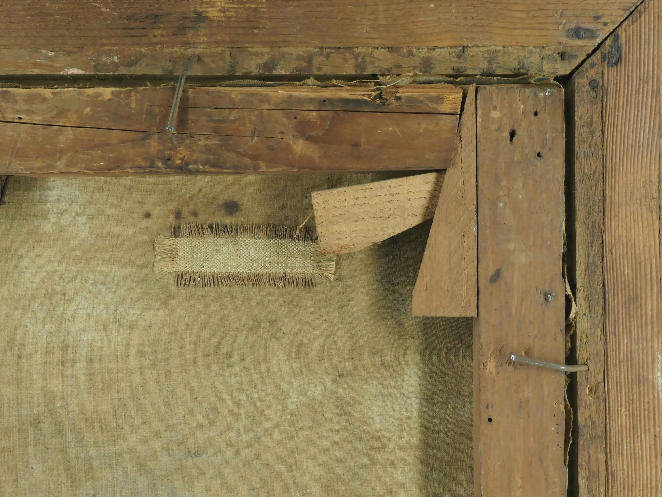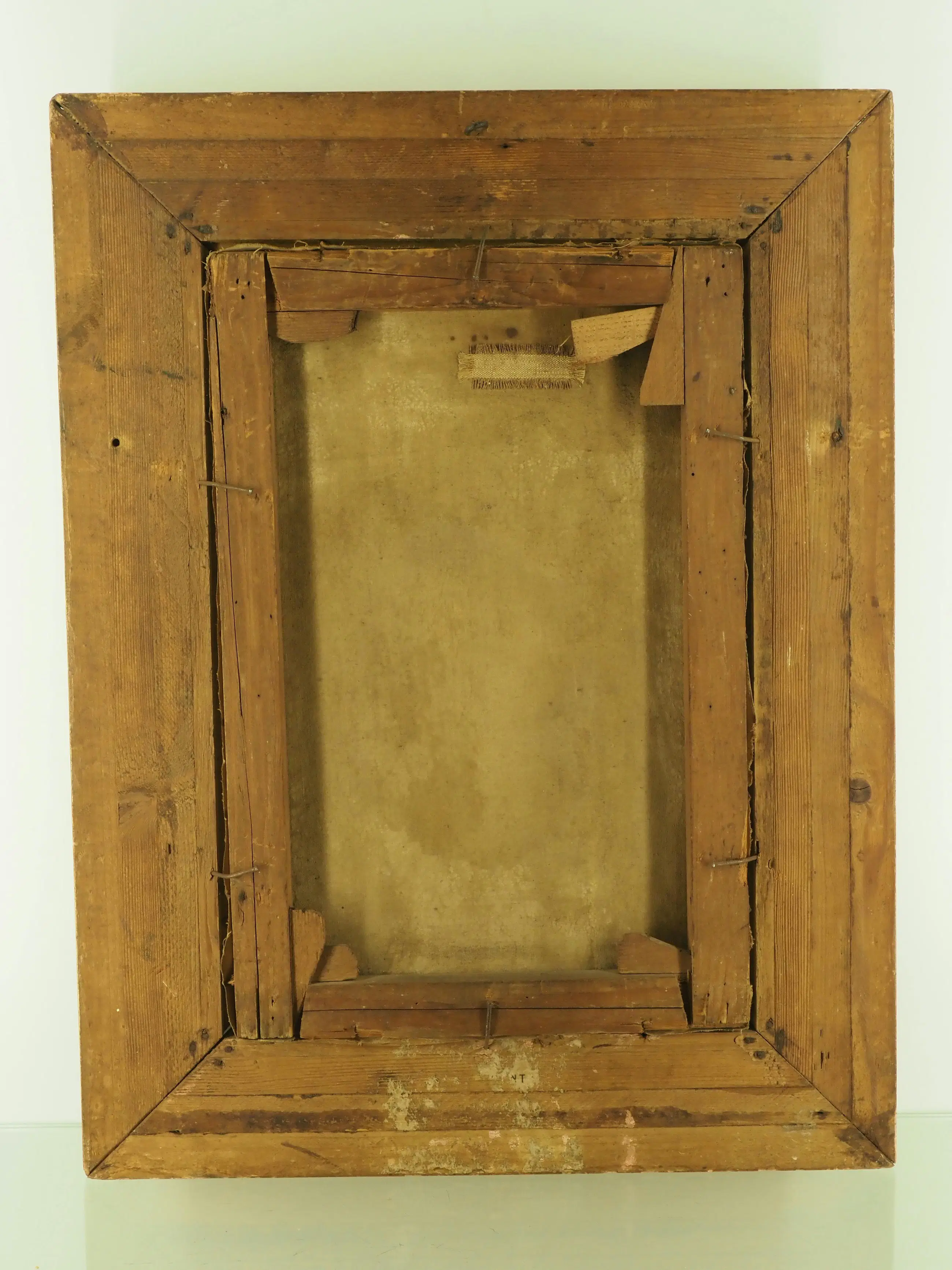 Lijst: De originele lijst is aanwezig, maar vertoont enige leeftijdgerelateerde slijtage, kleine beschadigingen en is momenteel niet volledig stevig bij het hanteren. De verbindingen in de linker boven- en rechter onderhoek sluiten niet perfect aan zonder lichte druk. Het geheel wordt aangeboden in de huidige, ongerestaureerde staat van de lijst, wat de authenticiteit benadrukt.