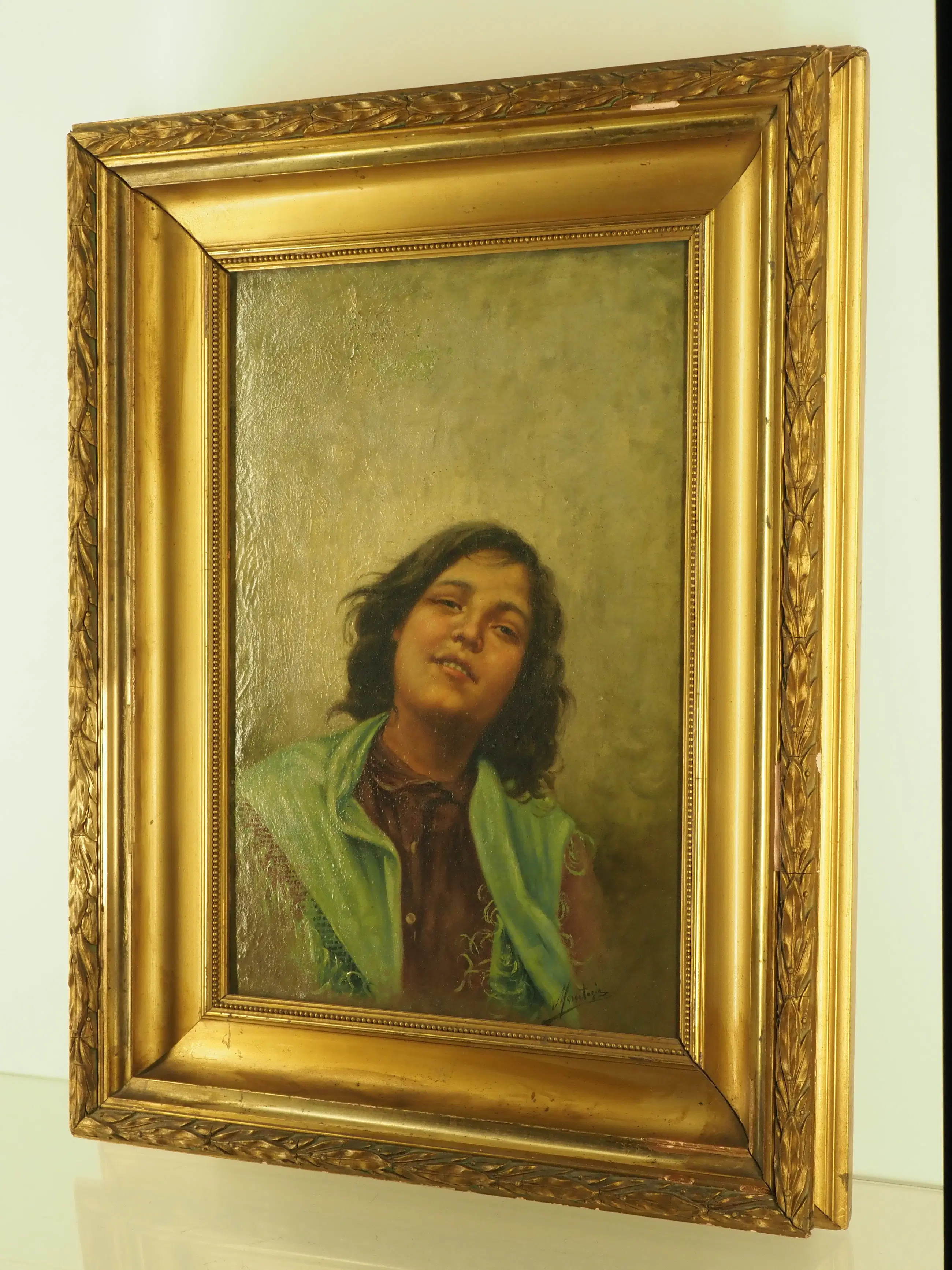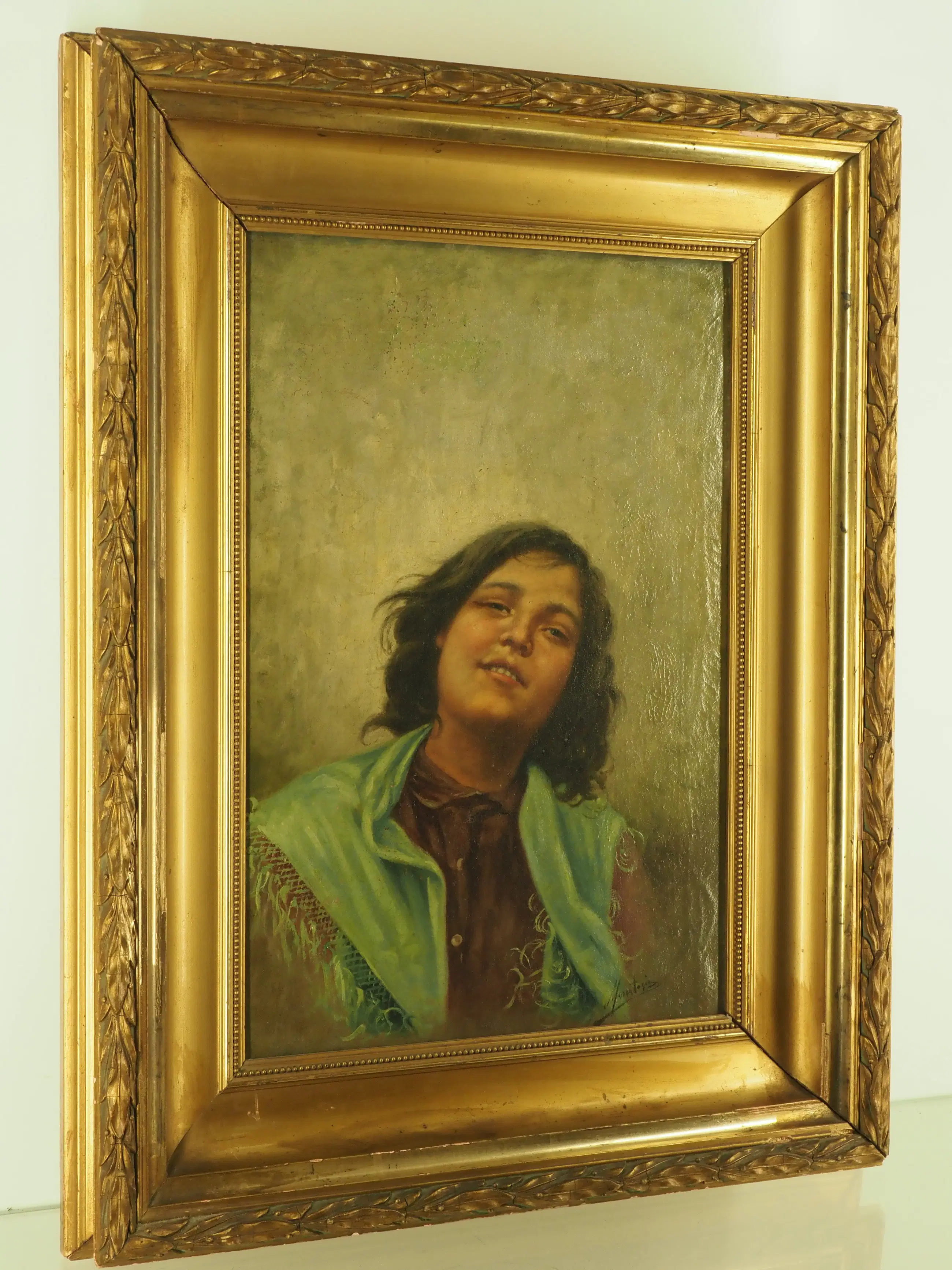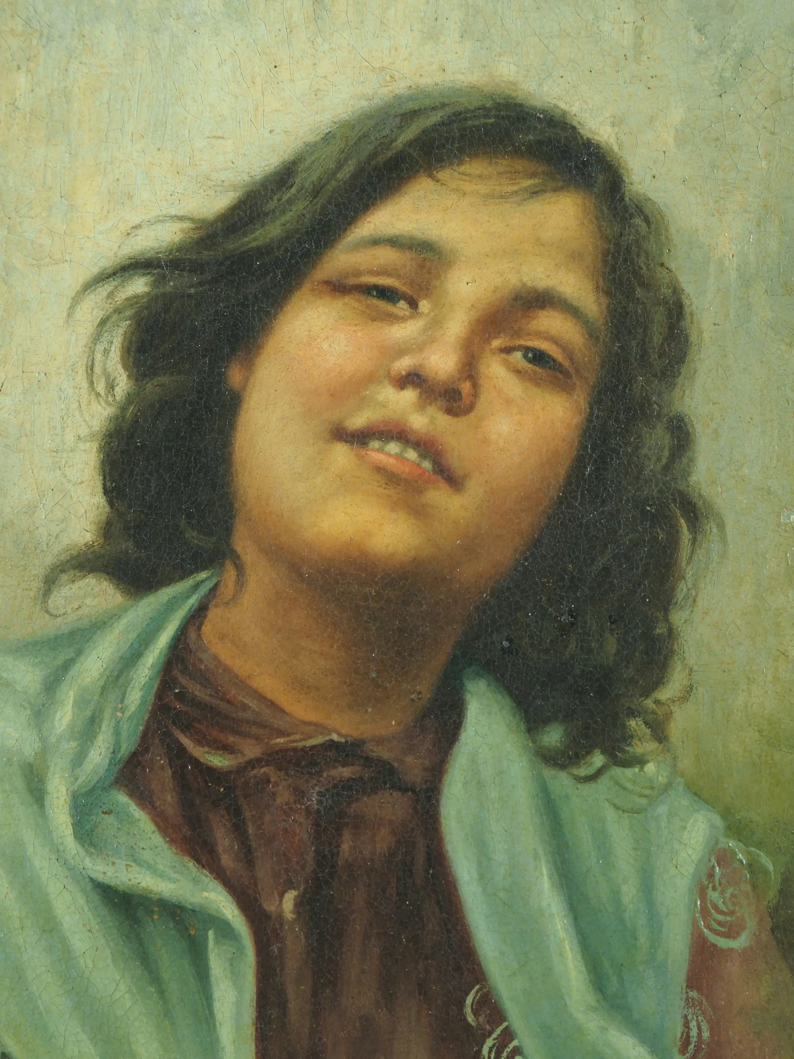Een charmant en karakteristiek olieverfschilderij op doek, getiteld 'Portret van een jong meisje' of 'Zigeunermeisje', gesigneerd rechtsonder door de gerespecteerde Italiaanse kunstenaar Filippo Marantonio (1863-1937).