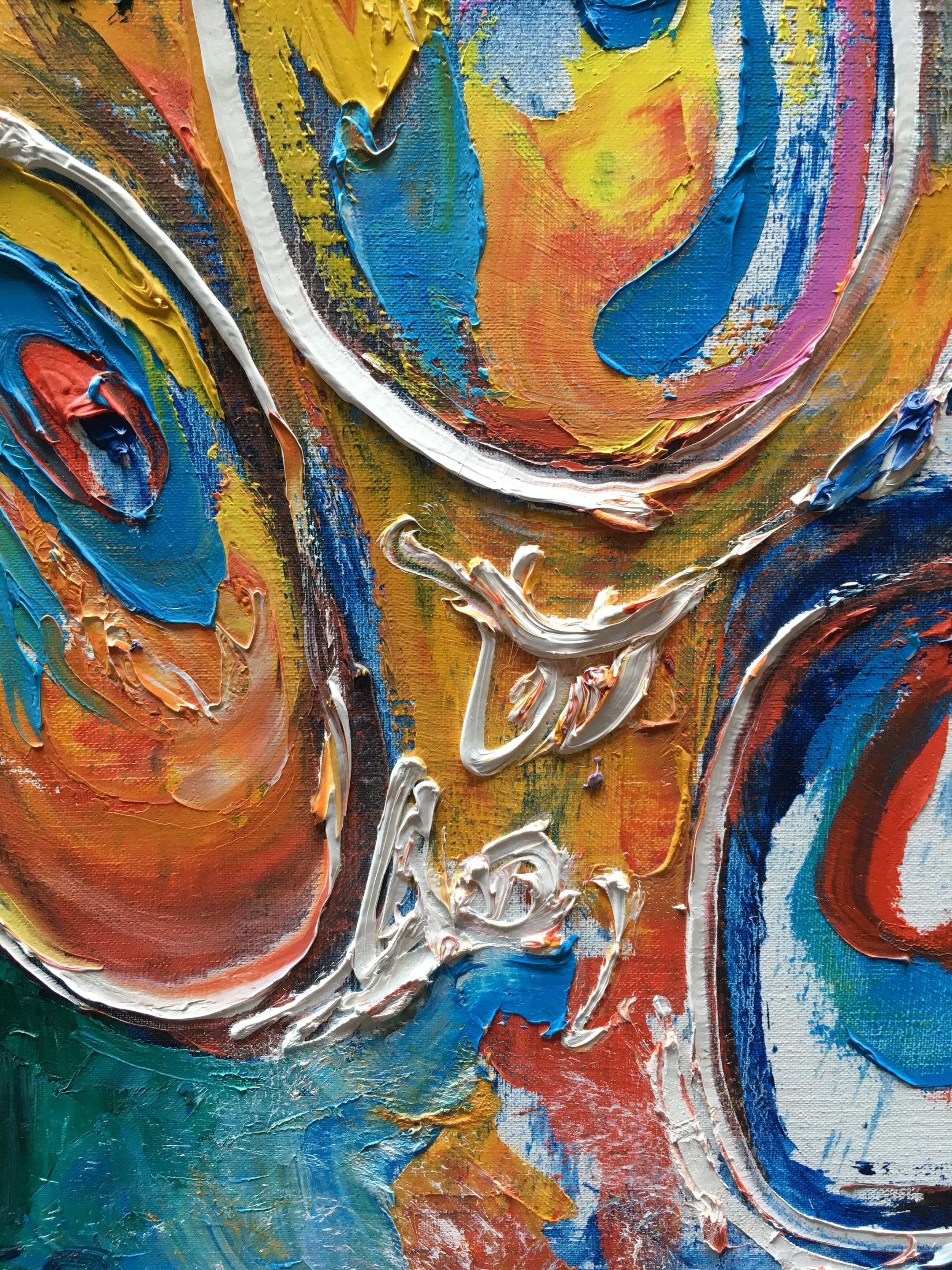 Dit werk is een compositie van olieverf op doek ingelijst en het verkeerd in een goede conditie. In dit werk heeft hij gekozen voor een aantal grotere figuren, in de van hem bekende stijl en lekker dik in de olieverf gezet. Het werk is links onder gemonogrameerd en uiteraard gegarandeerd authentiek.