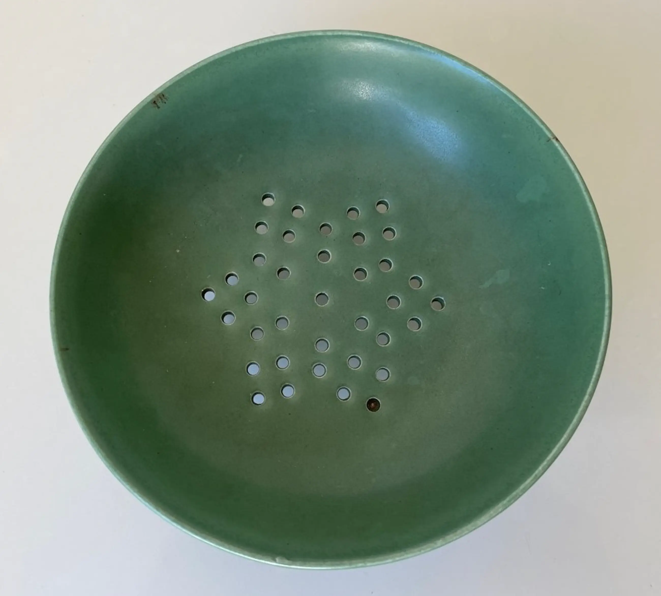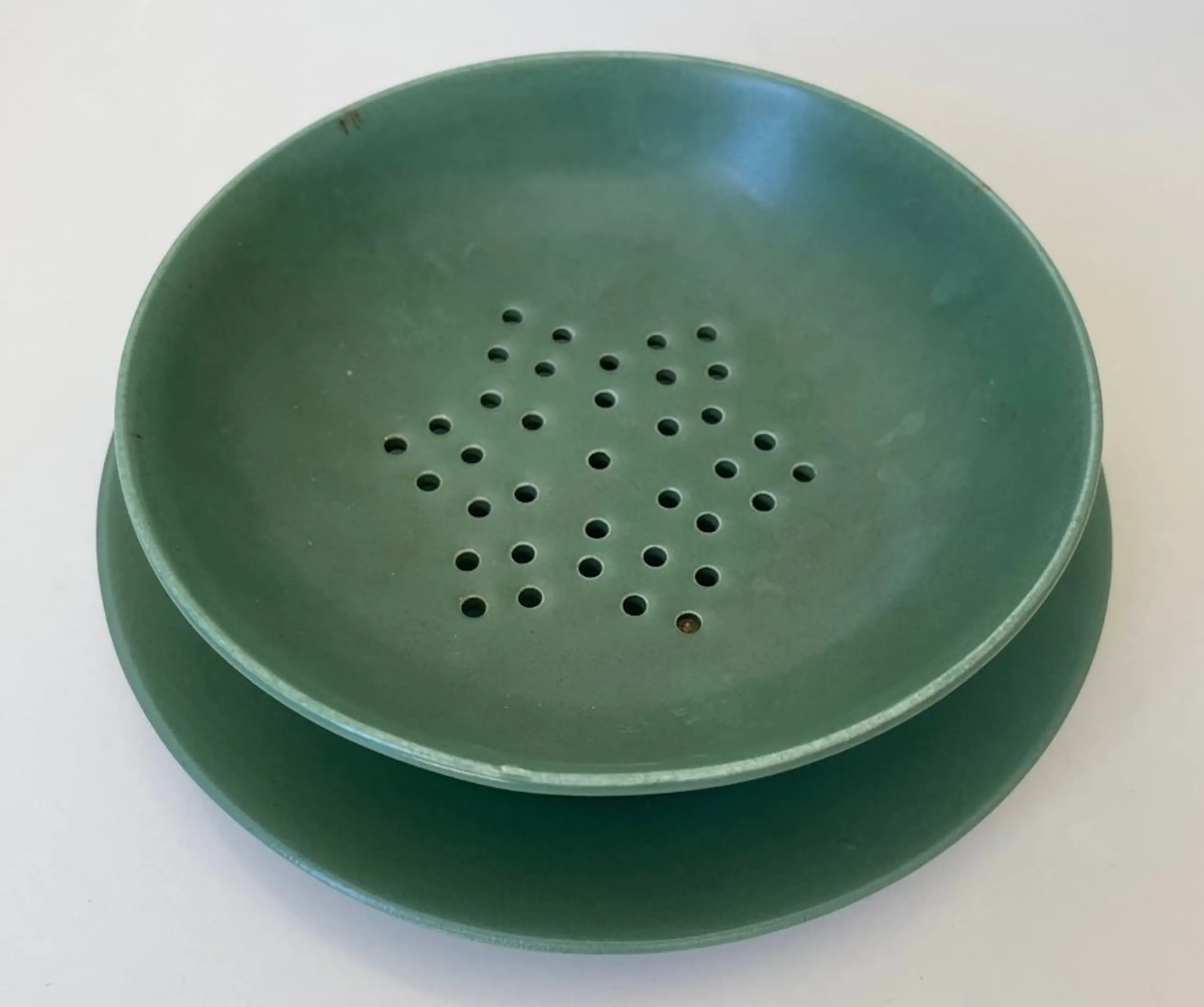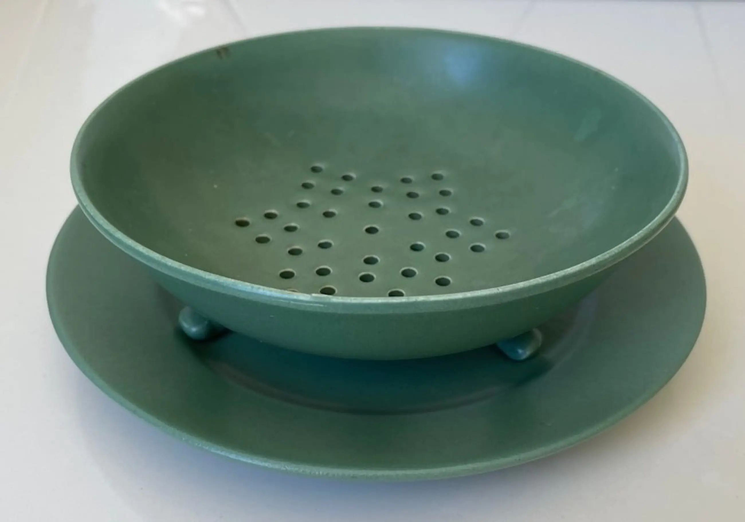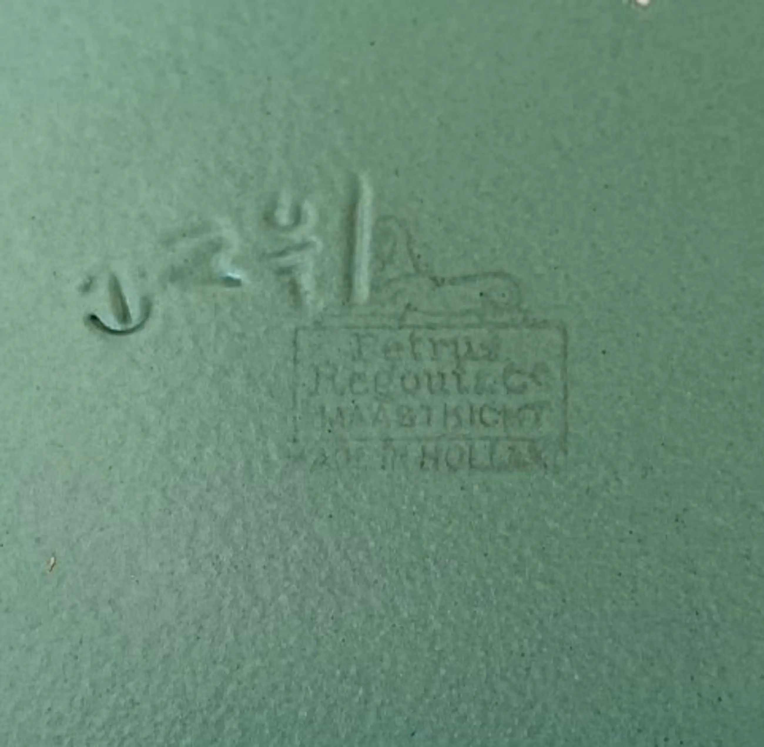 Art Deco groen aardewerken fruittest van Petrus Regout uit Maastricht. In prima onbeschadigde conditie. Zowel het onderbord als de test is aan de onderzijde voorzien van een blindmerk.