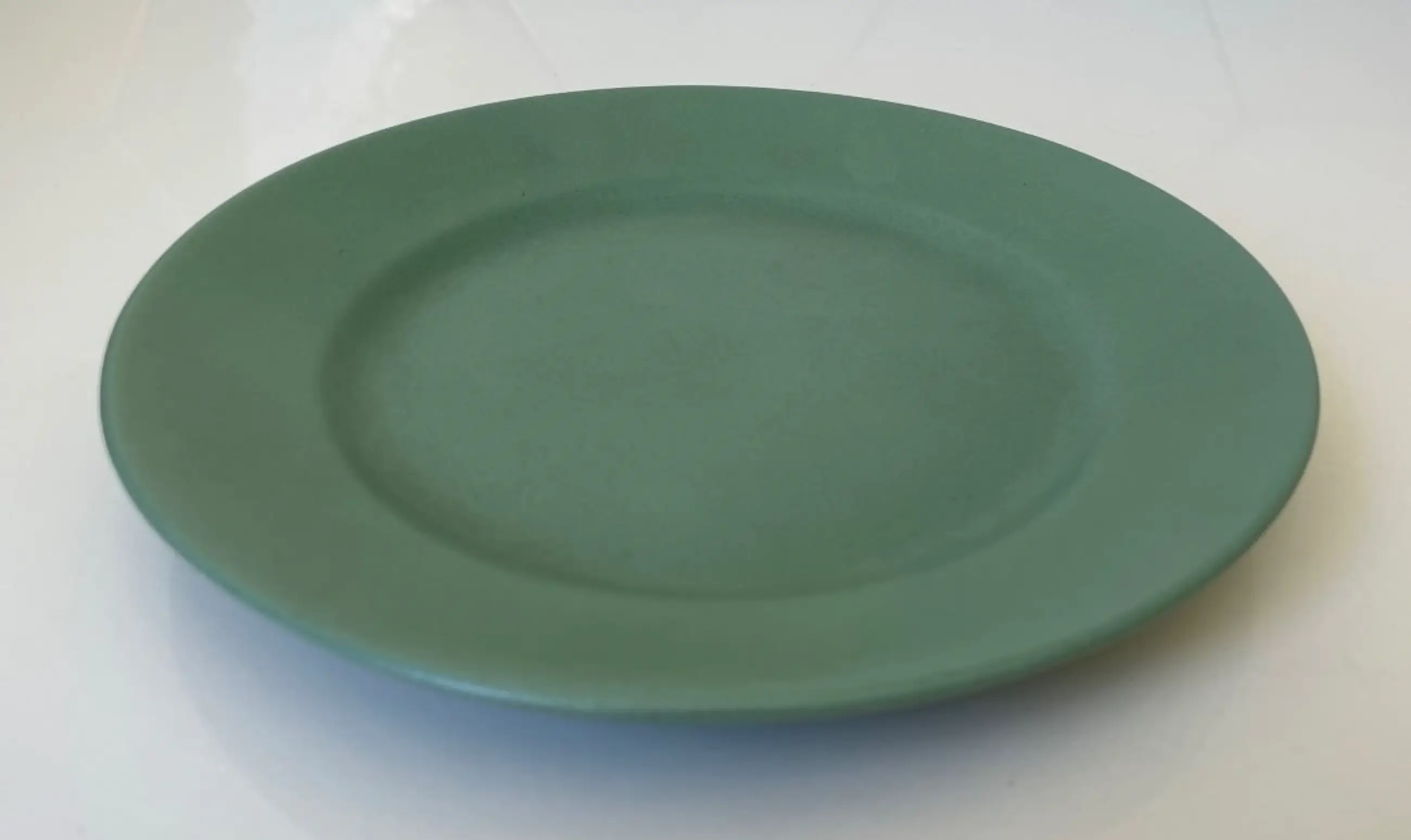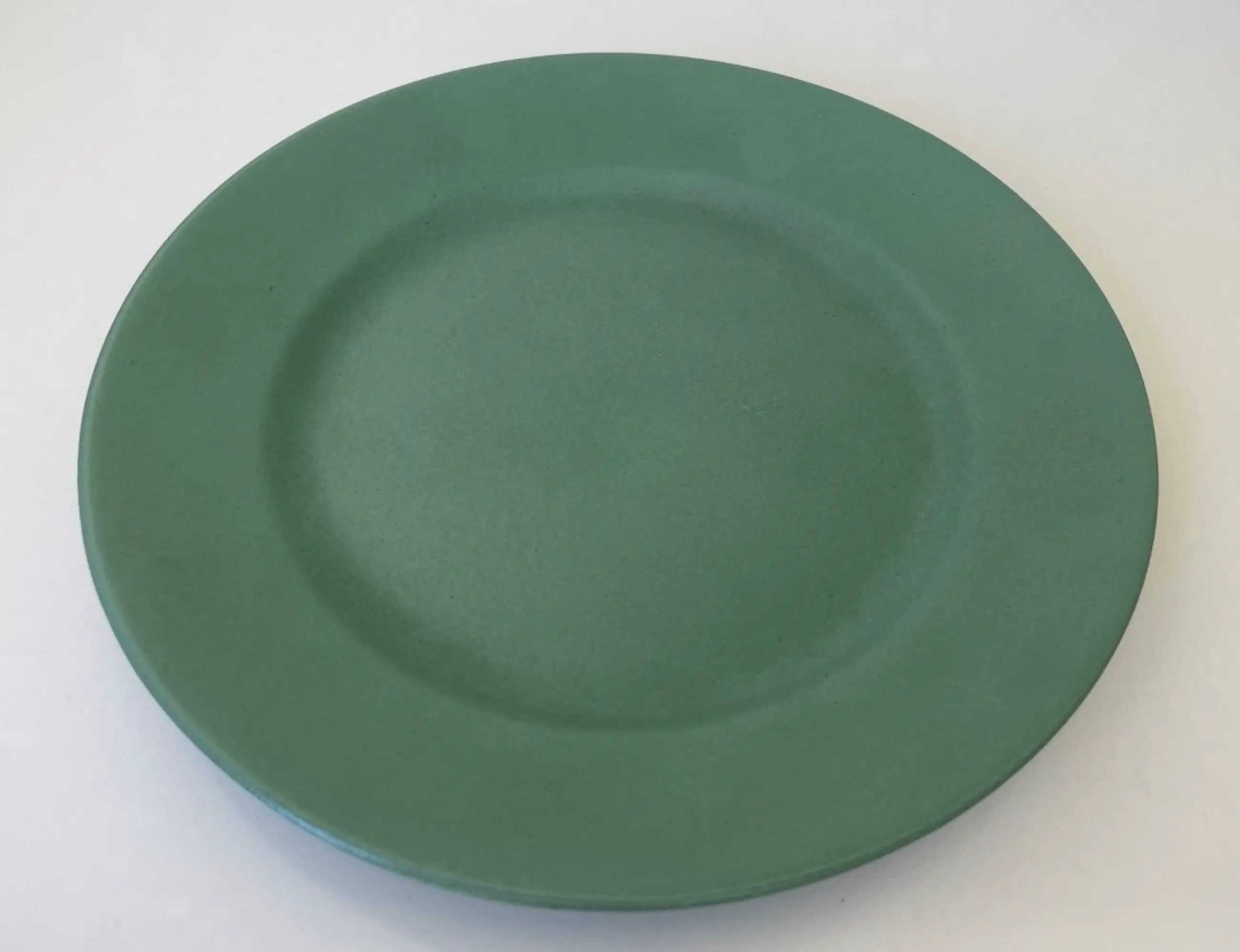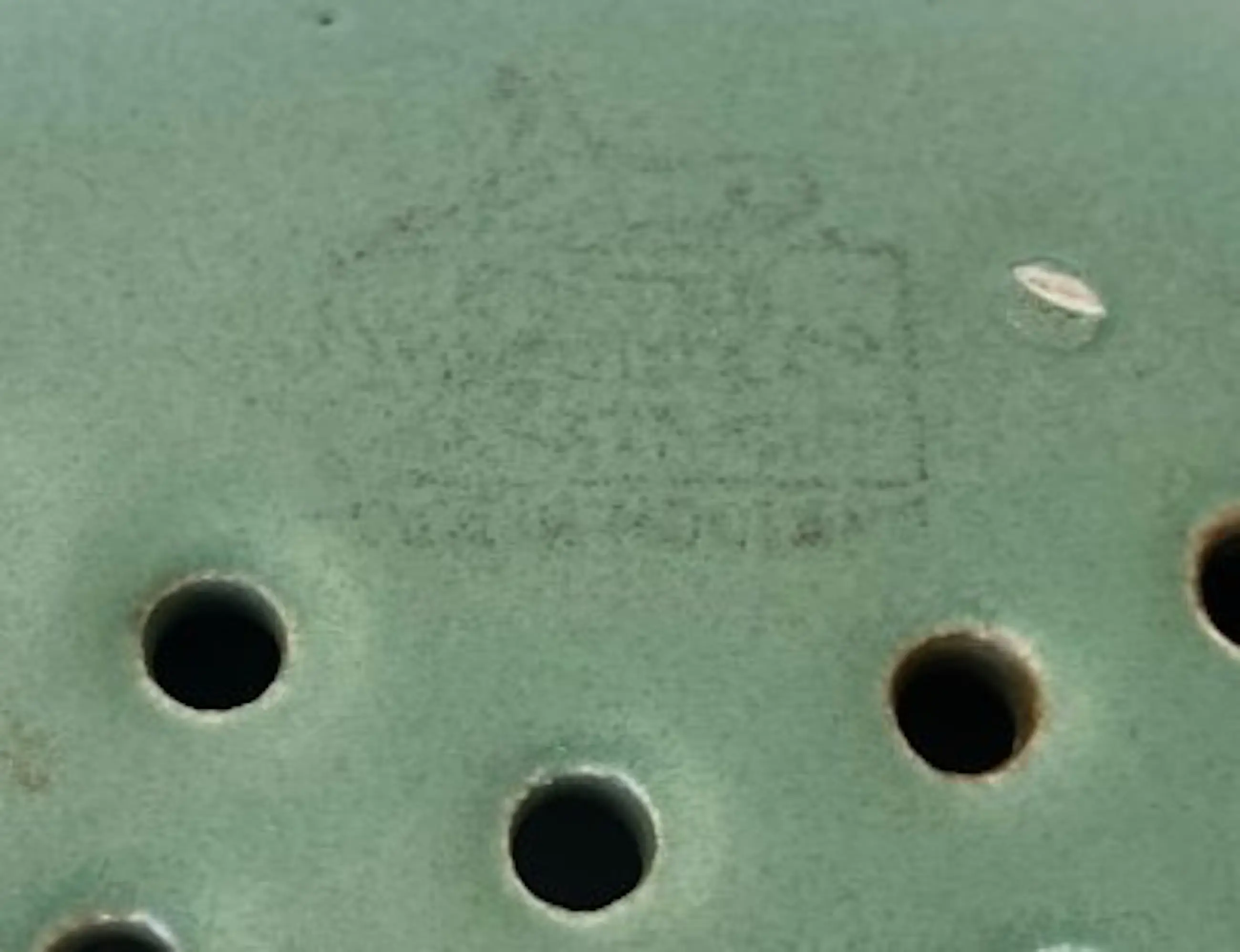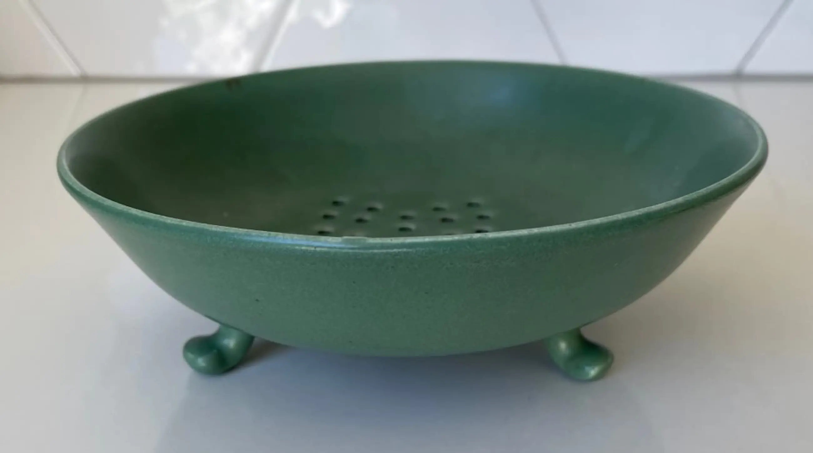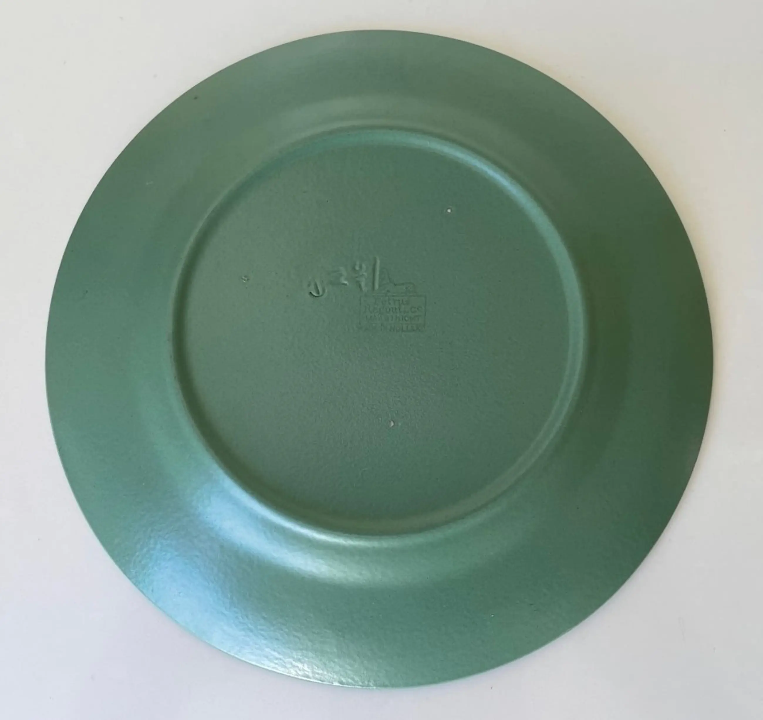 Art Deco groen aardewerken fruittest van Petrus Regout uit Maastricht. In prima onbeschadigde conditie. Zowel het onderbord als de test is aan de onderzijde voorzien van een blindmerk.