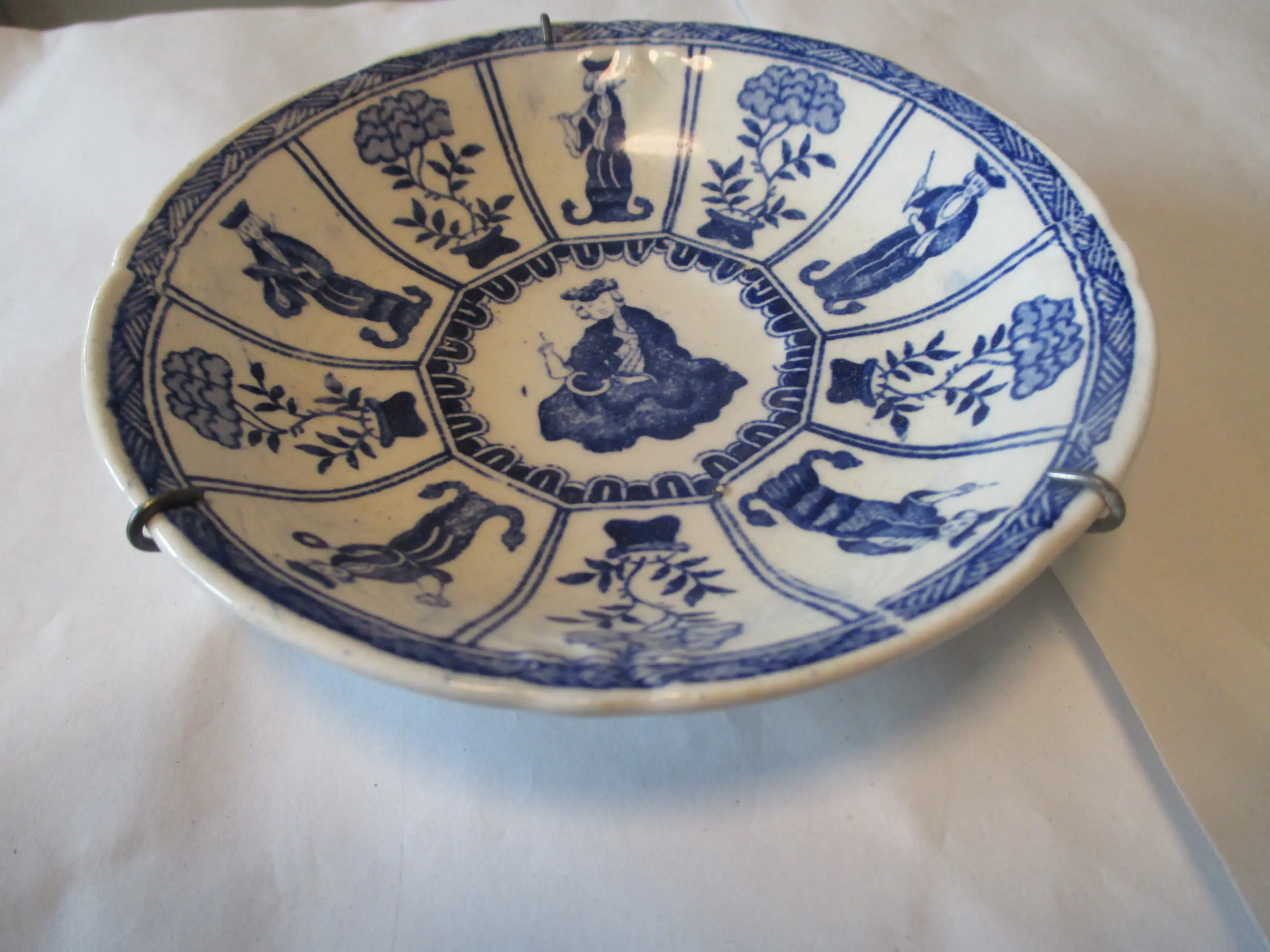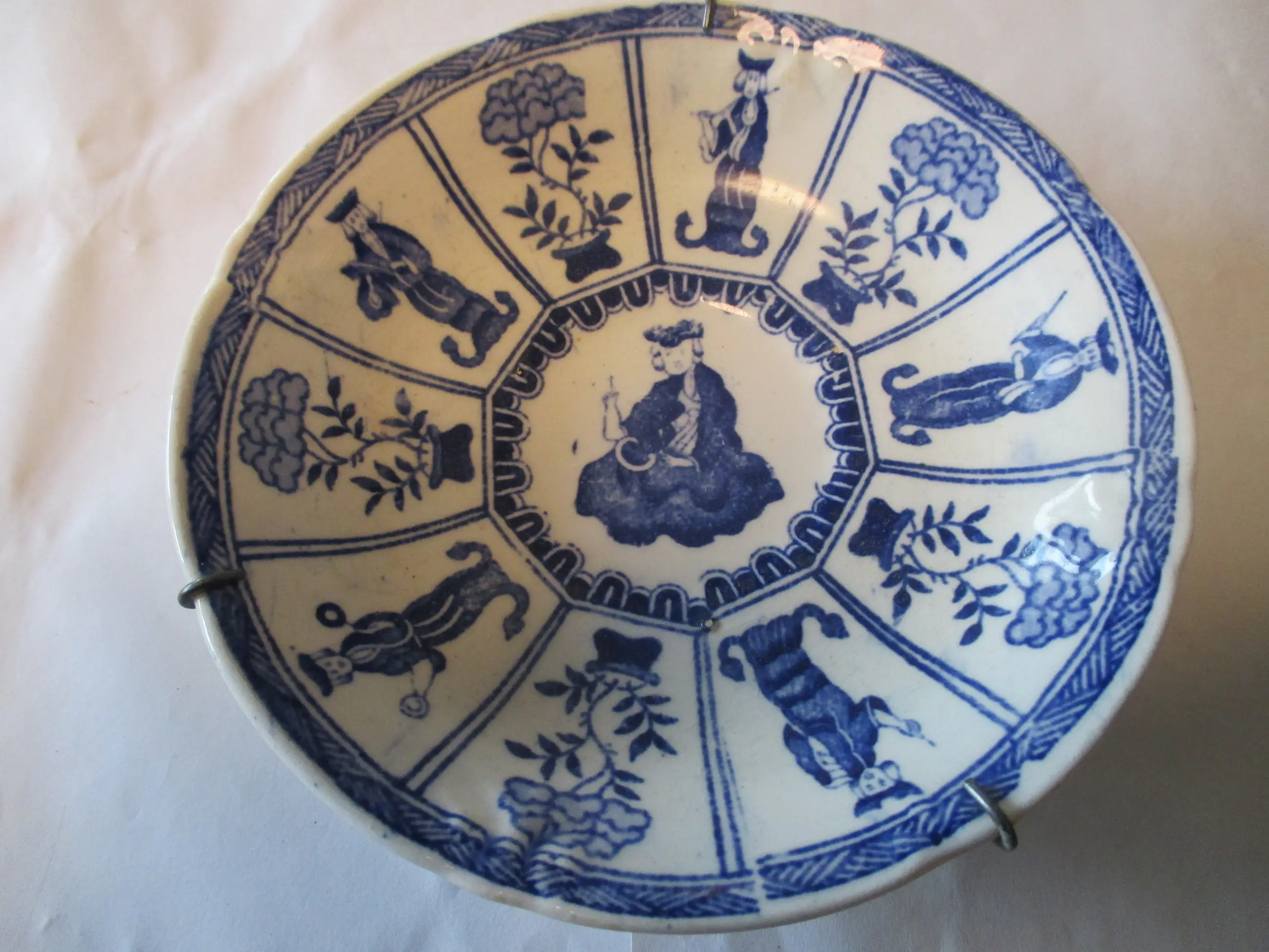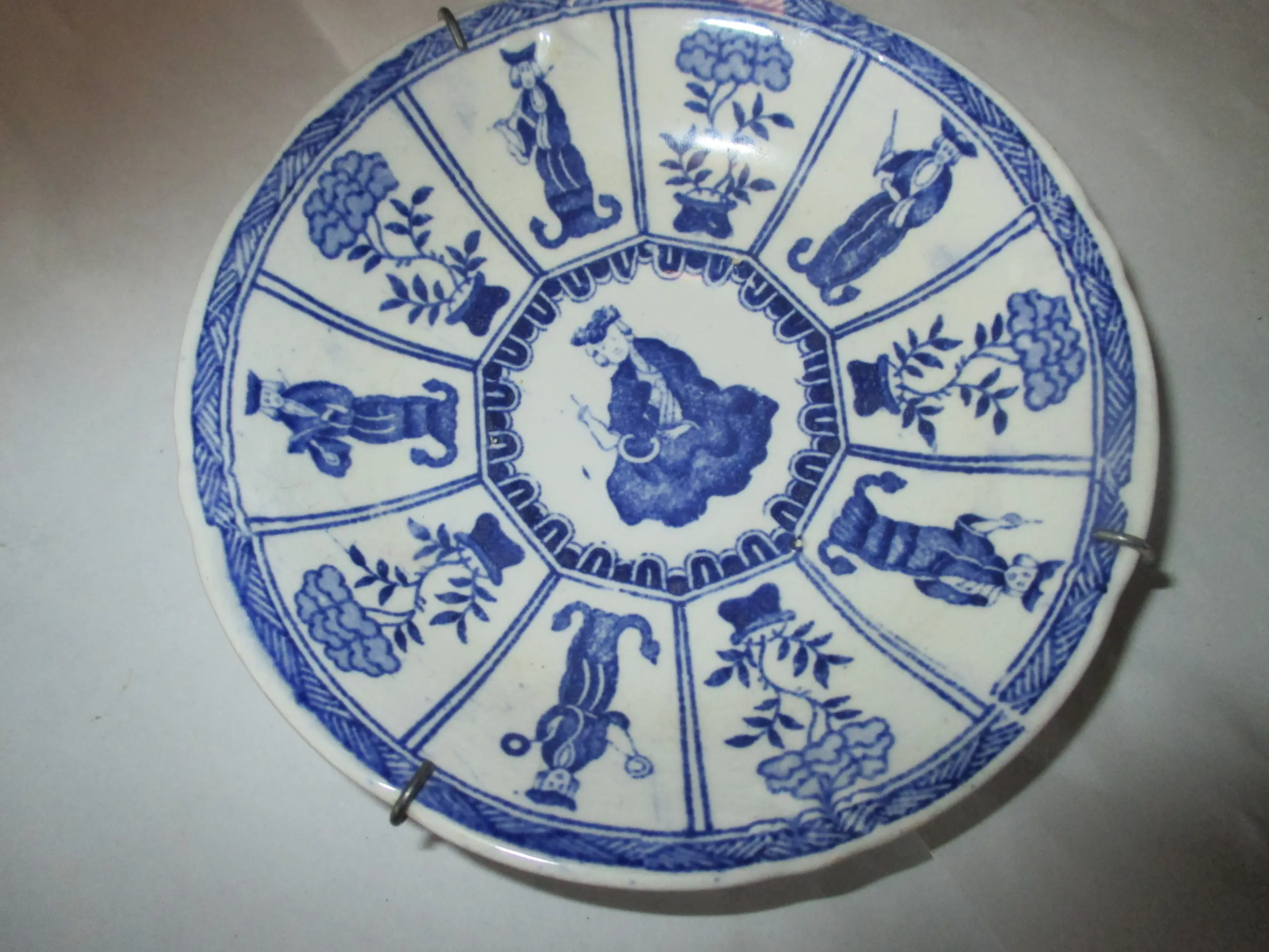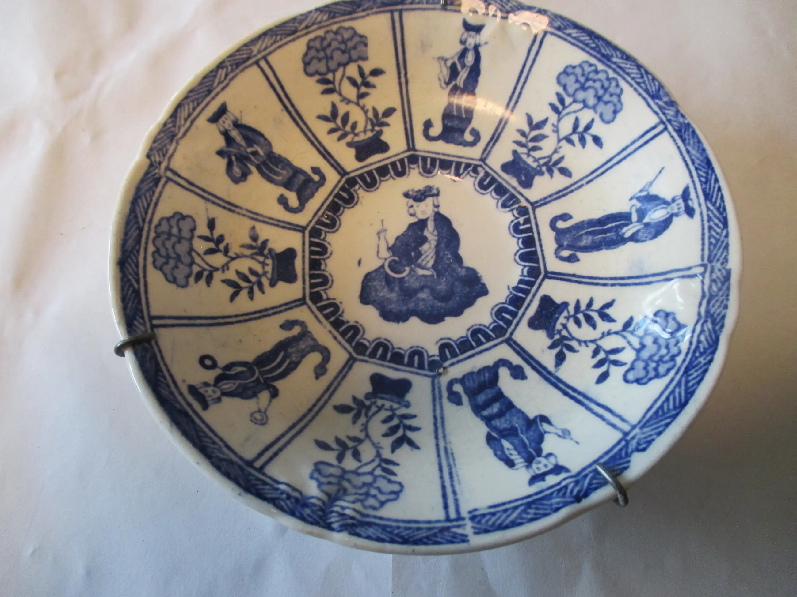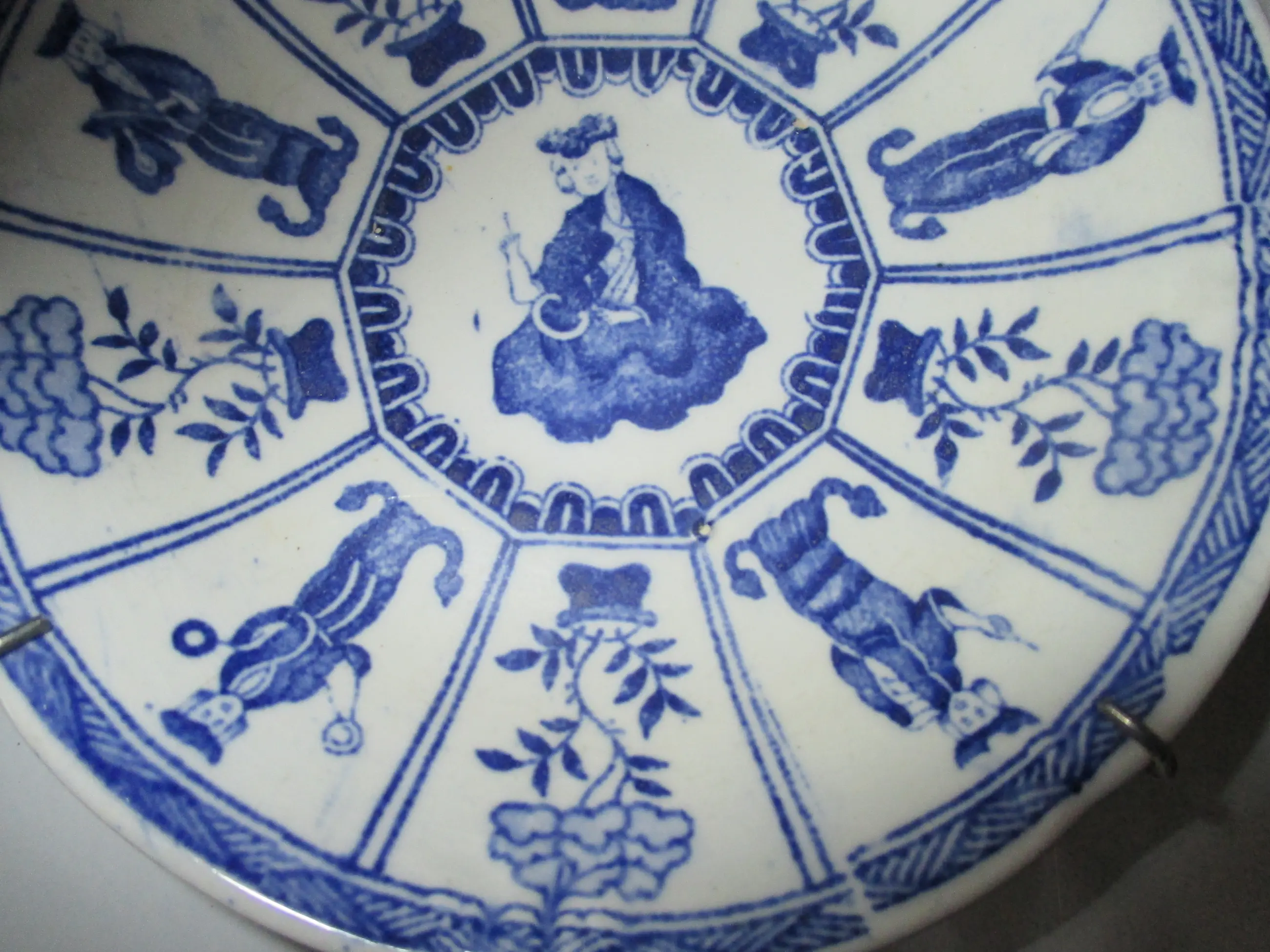 Wandbordje gedecoreerd in Kangxi stijl met een vernederlands Lange Lijs decor. Gemaakt in de Petrus Regout fabriek rond 1850. Gemerkt op de onderzijde met het Petrus Regout stempel. Afmetingen: doorsnede 13 cm.