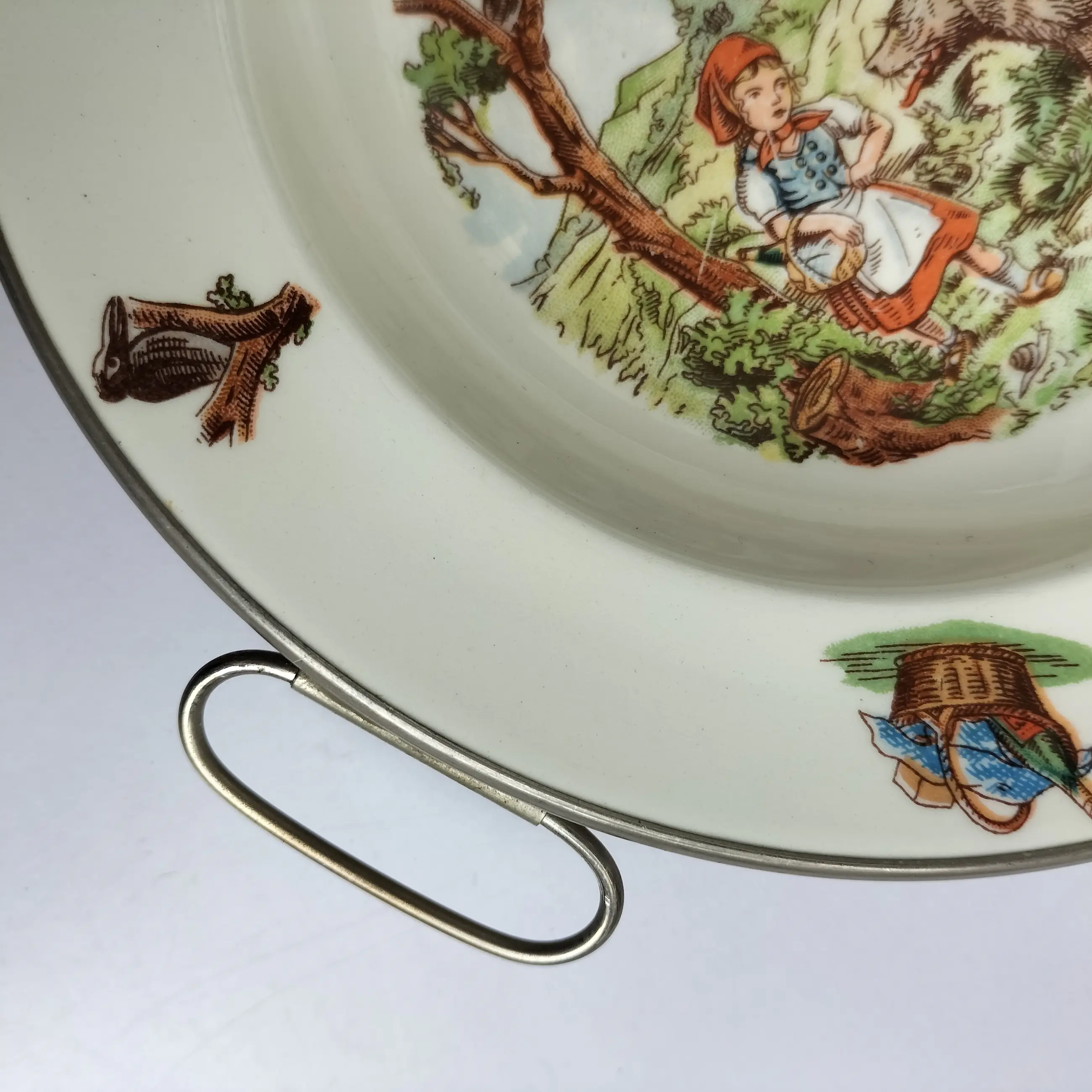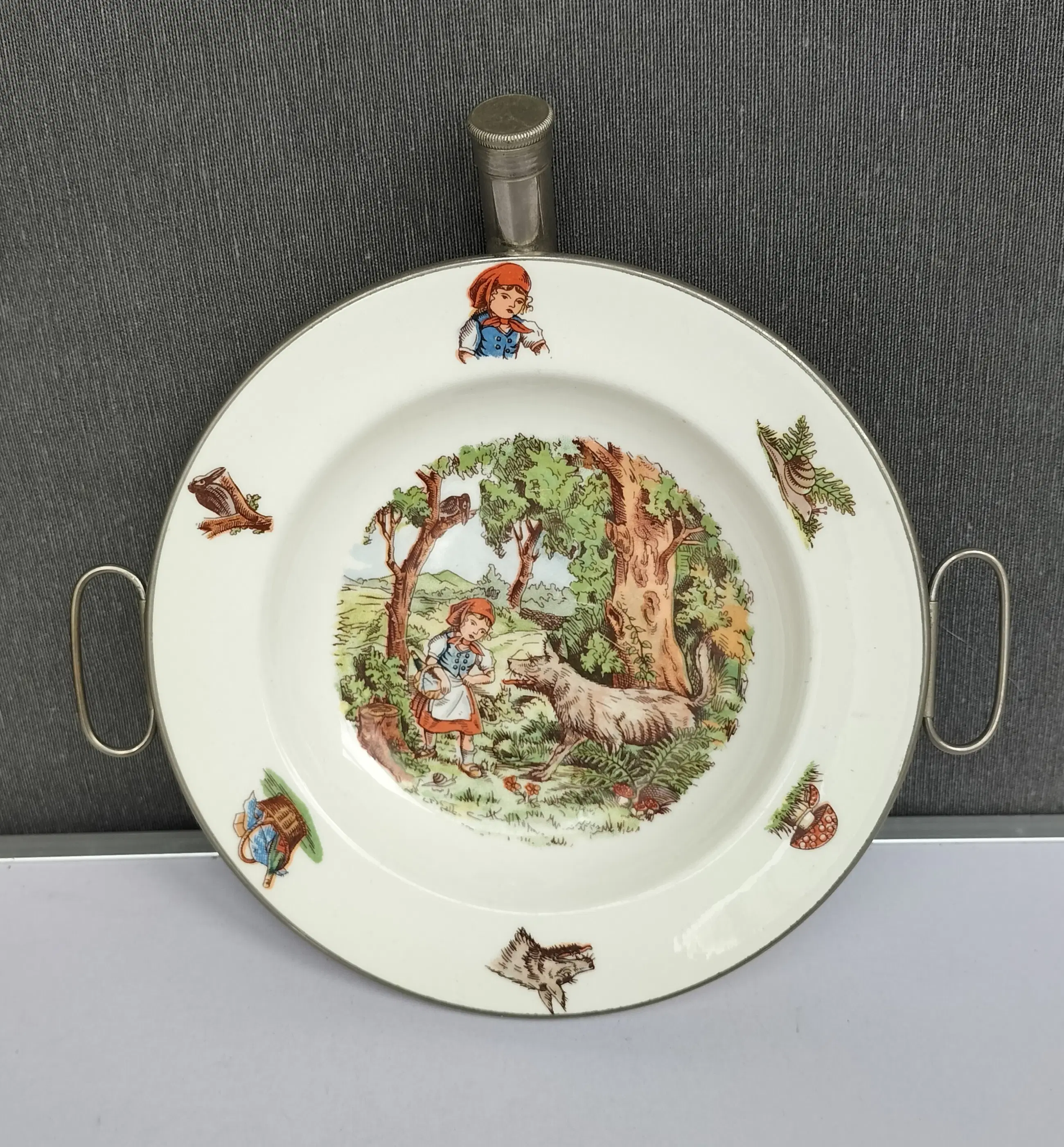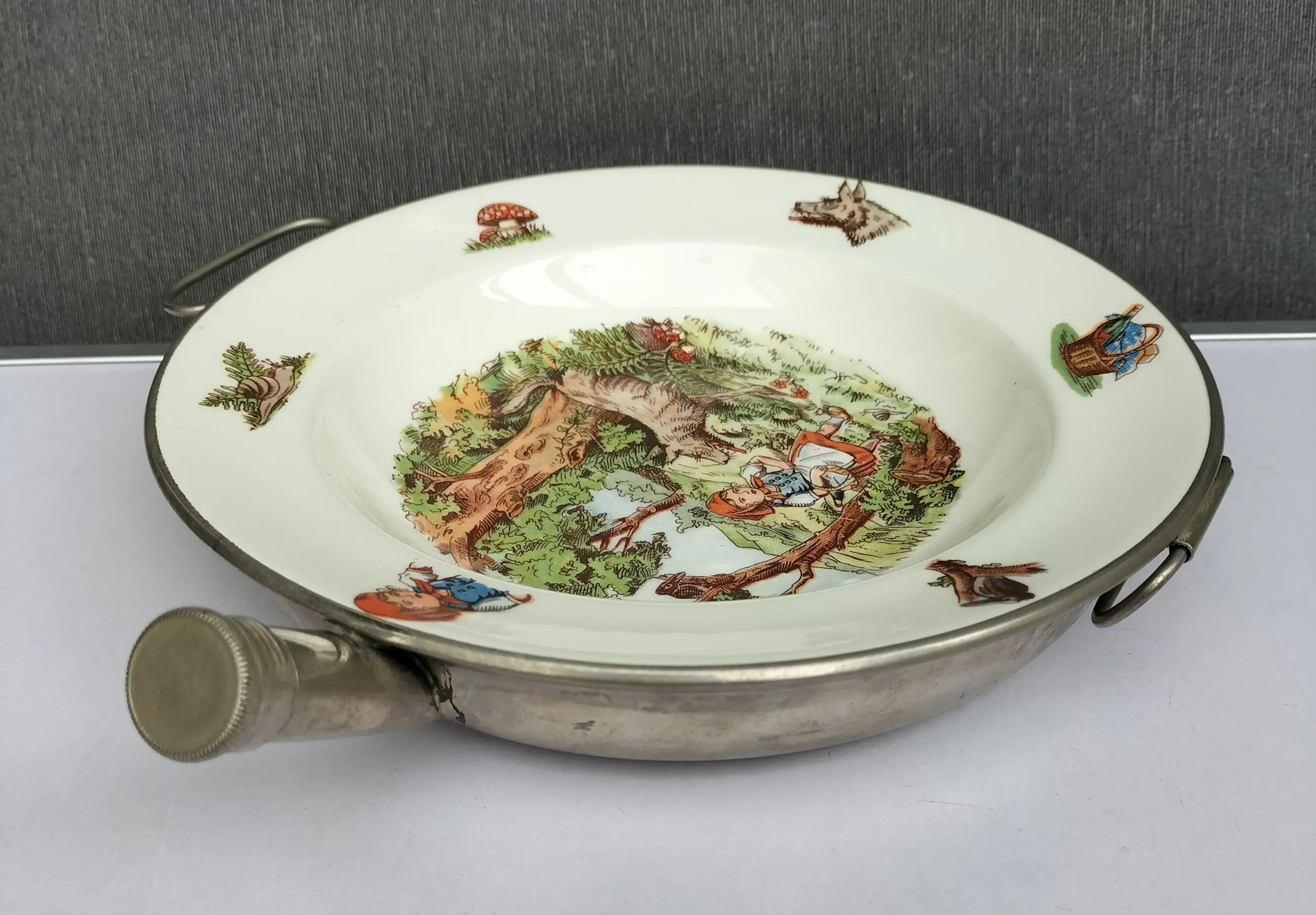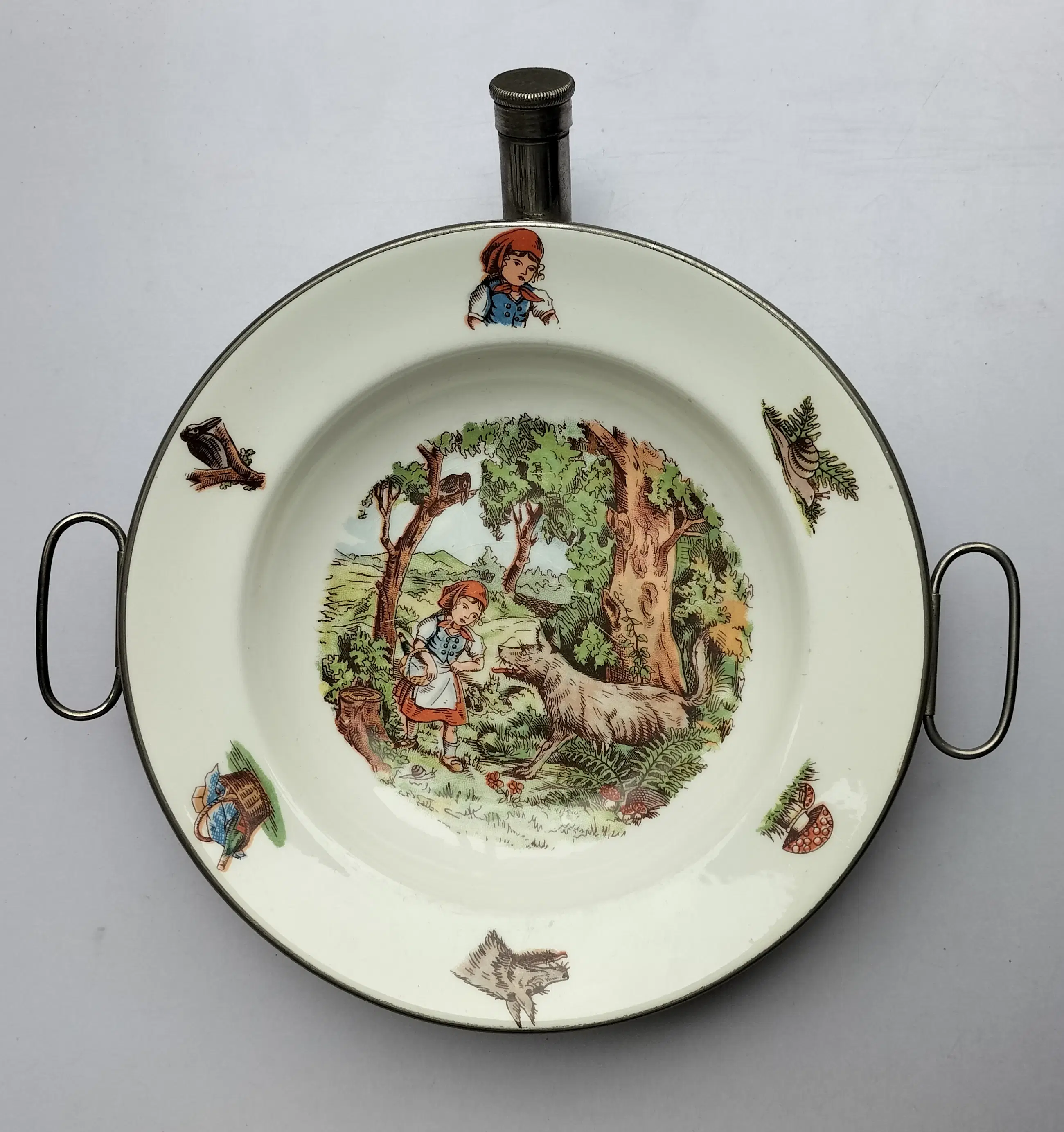 Fraai porseleinen bord met metalen houder voor baby's/peuters om eten te verwarmen en warm te houden. Het bord is een ontwerp van Petrus Regout en de metalen houder met handvatten is van Benraad Holland, gemerkt aan de onderzijde. Geproduceerd in de jaren 50/60 , met op het bord een mooie gedetailleerde afbeelding in kleur uit het sprookje van Roodkapje. Ook op de rand van het bord staan afbeeldingen in kleur.