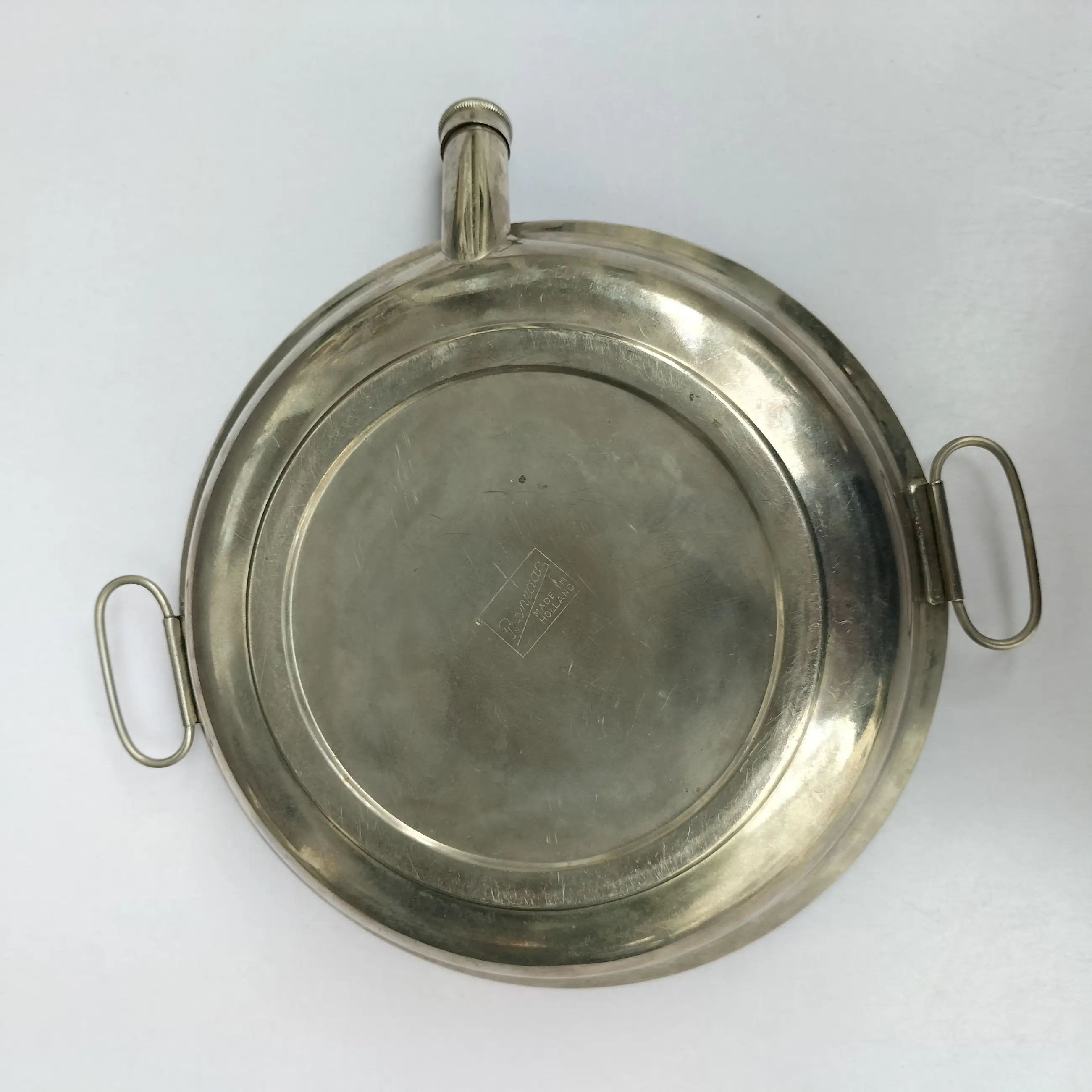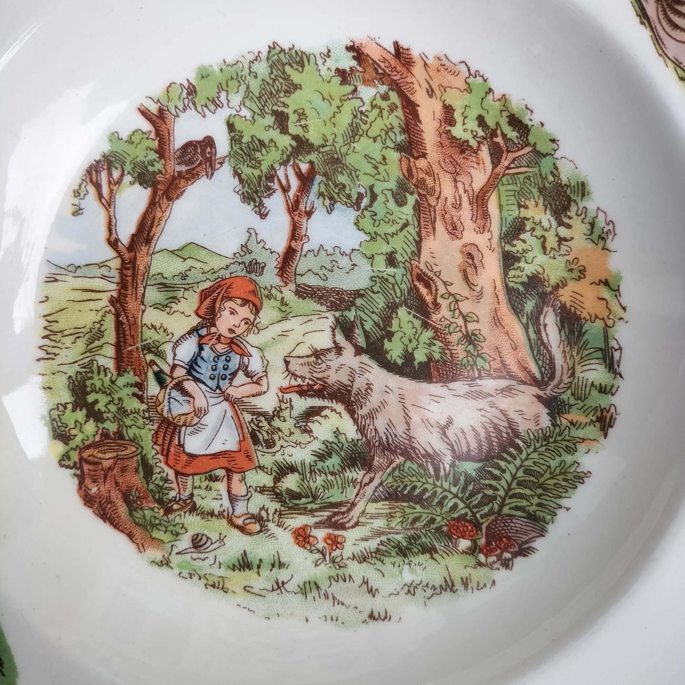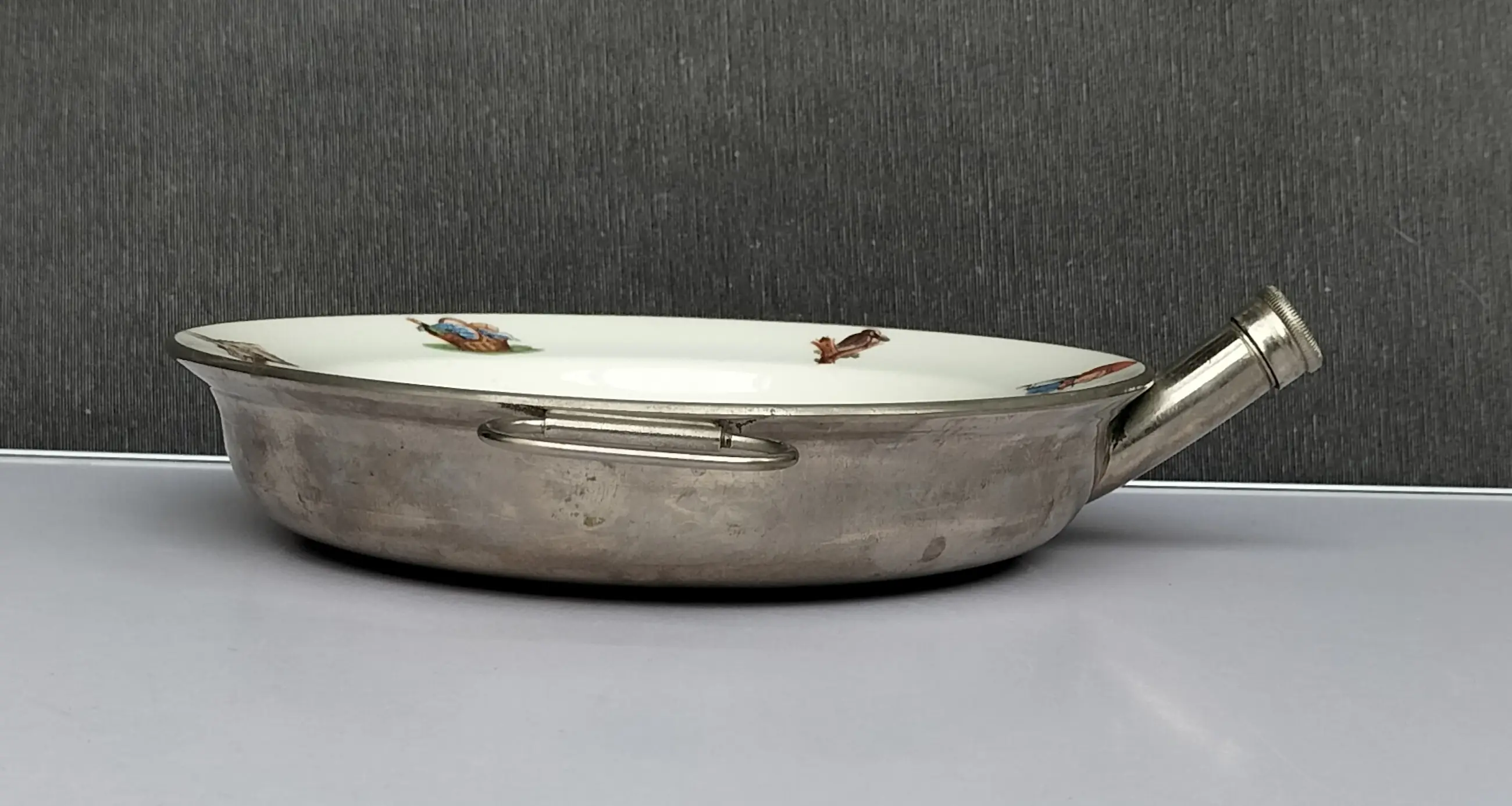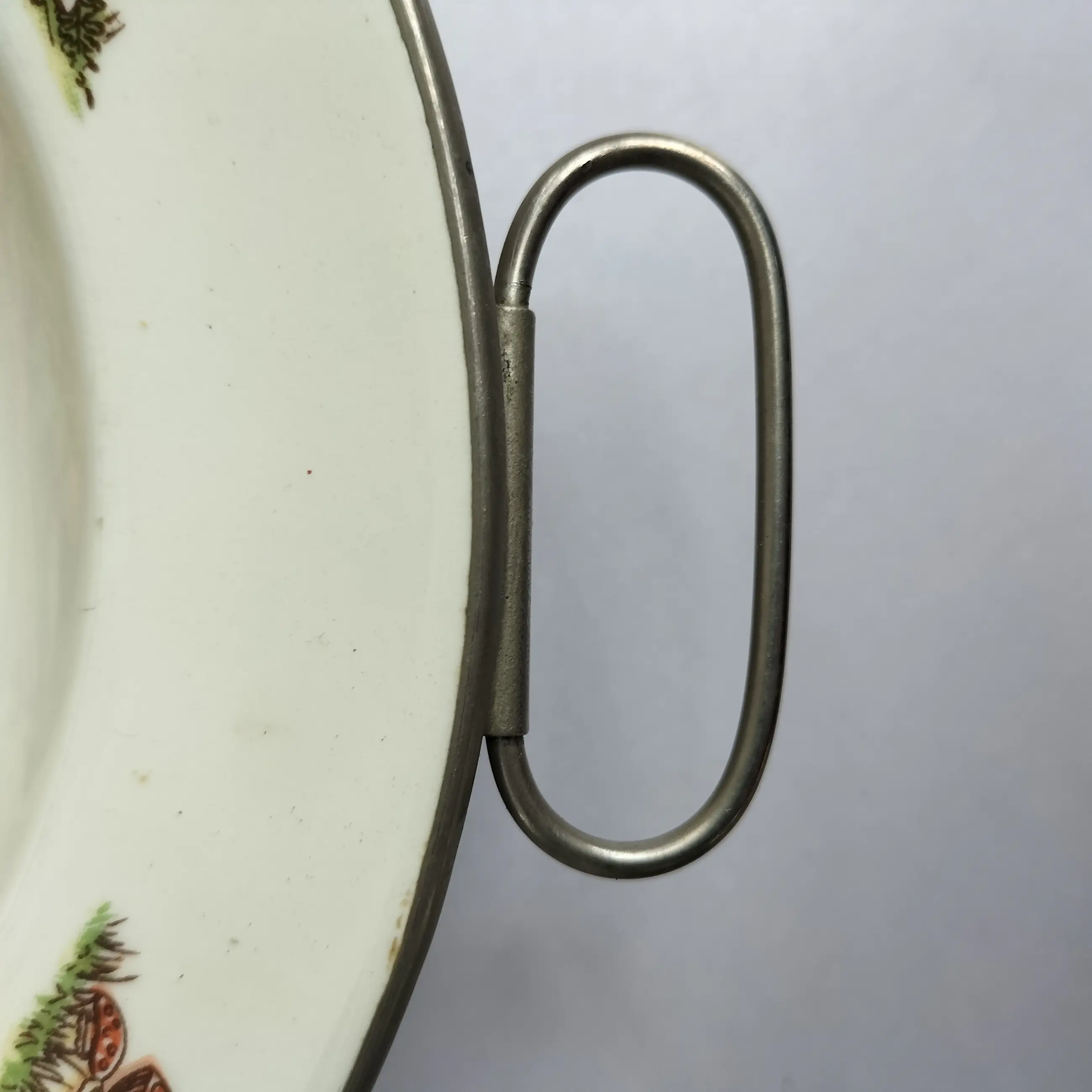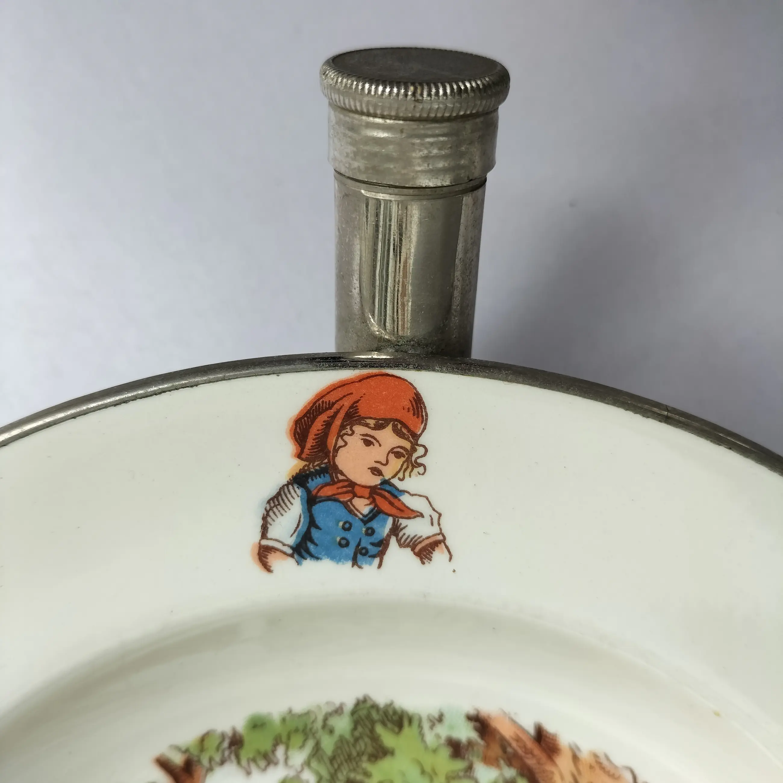 Fraai porseleinen bord met metalen houder voor baby's/peuters om eten te verwarmen en warm te houden. Het bord is een ontwerp van Petrus Regout en de metalen houder met handvatten is van Benraad Holland, gemerkt aan de onderzijde. Geproduceerd in de jaren 50/60 , met op het bord een mooie gedetailleerde afbeelding in kleur uit het sprookje van Roodkapje. Ook op de rand van het bord staan afbeeldingen in kleur.