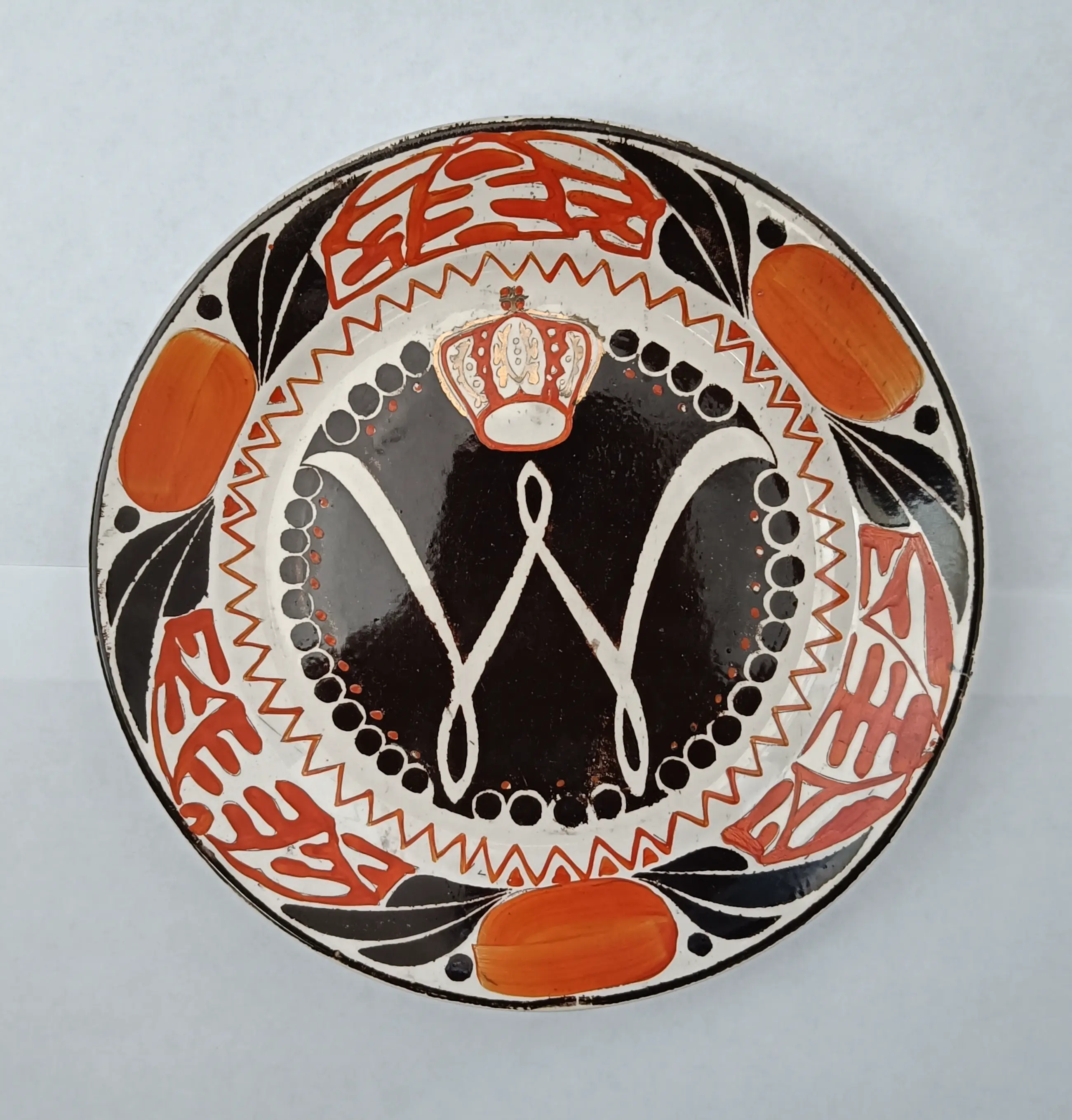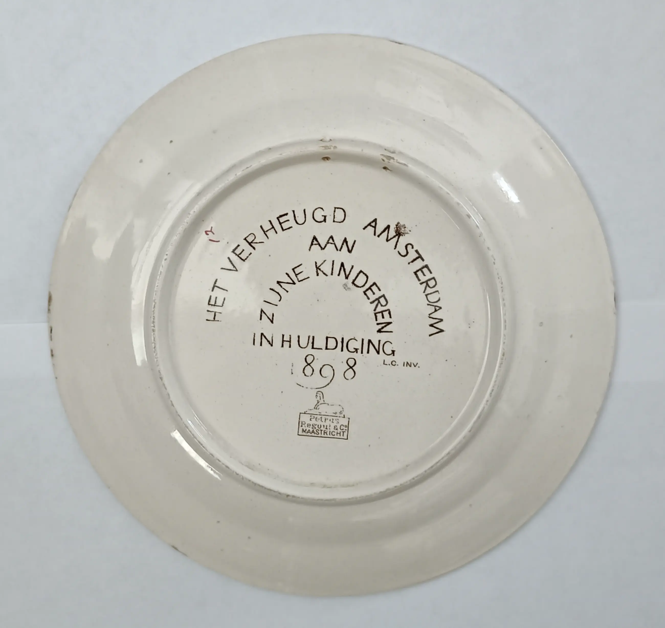 Bord Keramiek Wilhelmina Vervaardigd in 1898 "Het verheugd Amsterdam aan zijnde kinderen in huldiging 1898 l.c. inv." Handgeschilderd Schepper: Petrus Regout & Co. Maastricht (workshop/studio) Genummerde oplage, nr 12 Afm. 21.5x21.5x3cm Kleuren : oranje,(donker)bruin,goud.