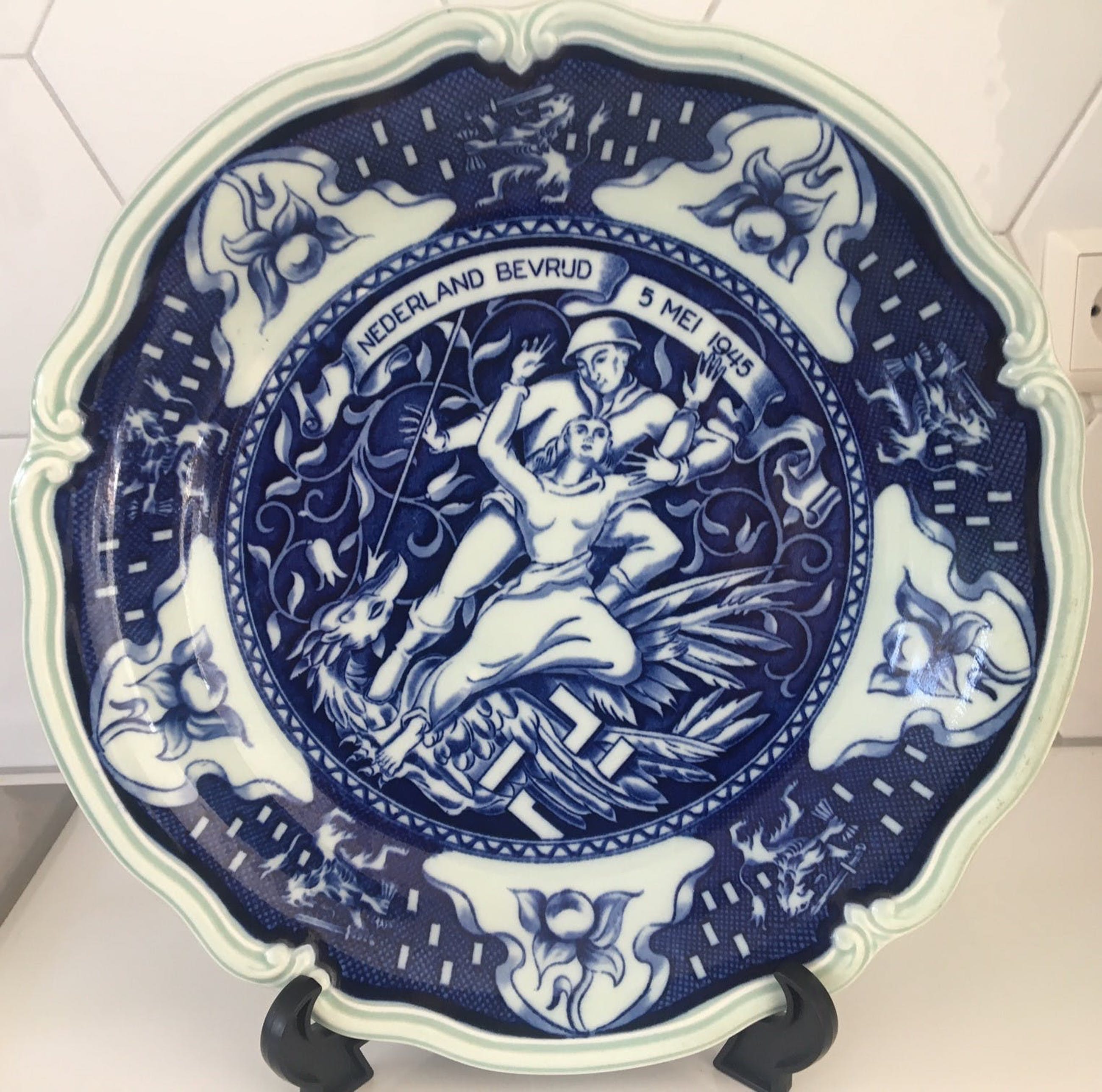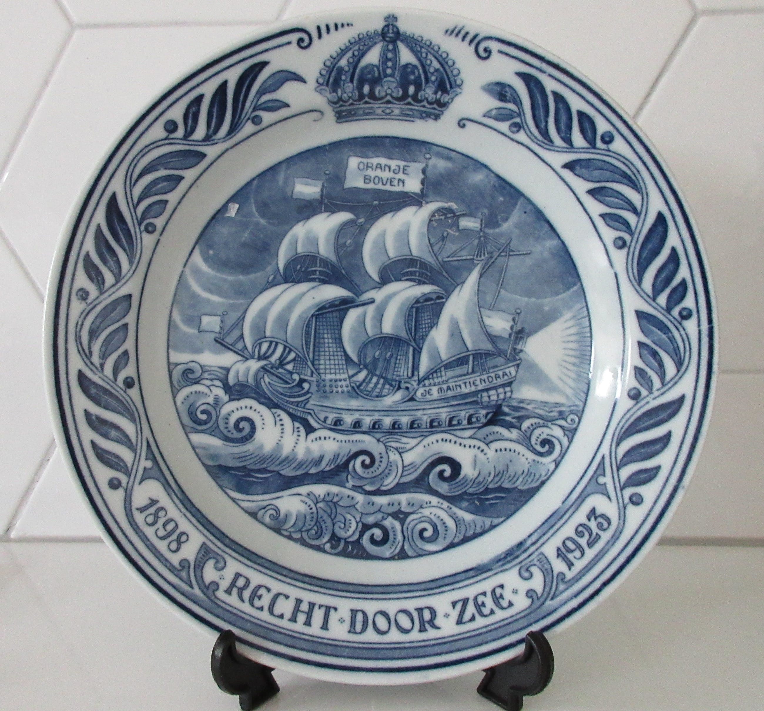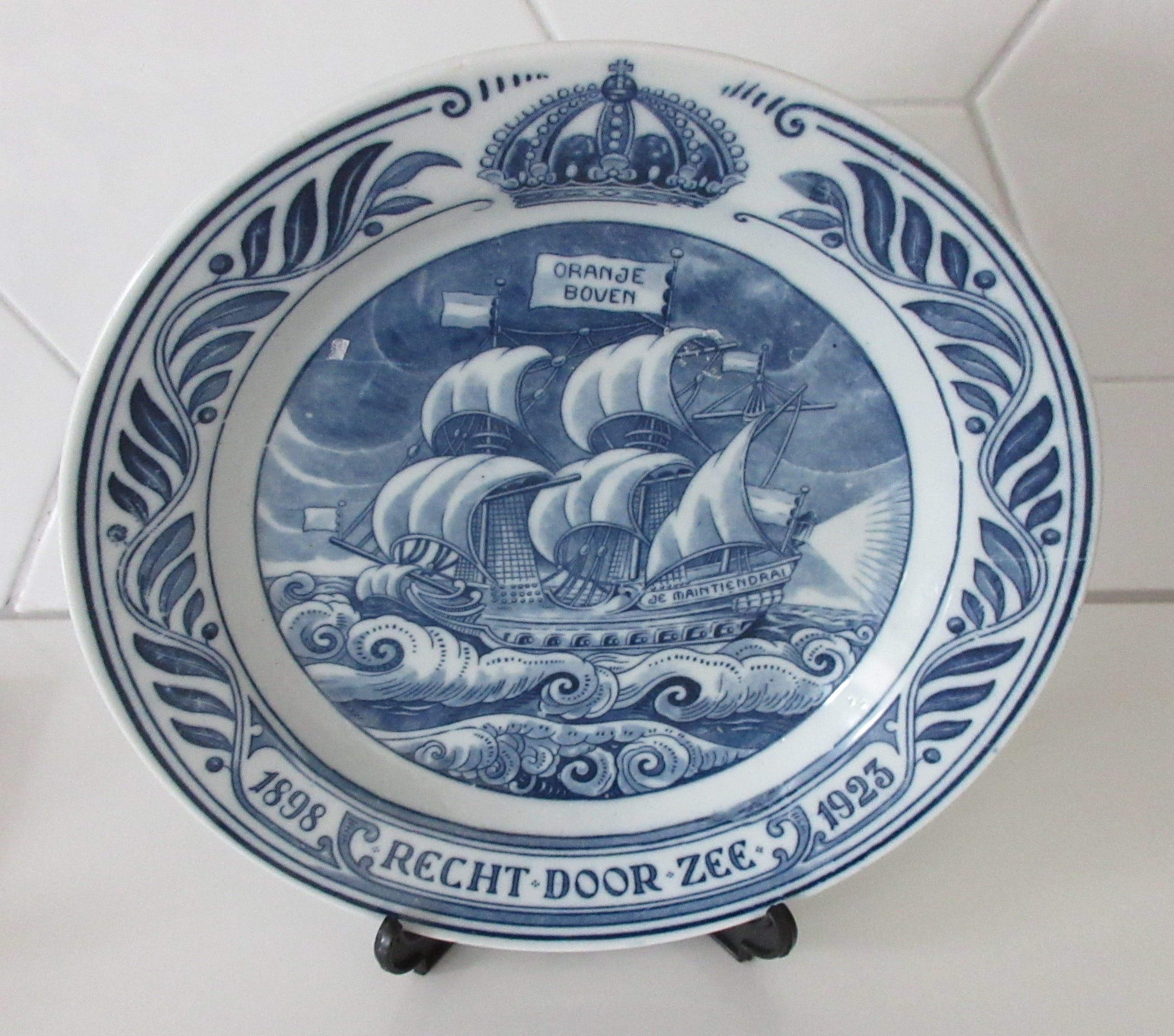 Goed uitgevoerd bord met een prachtig vormgegeven decor Uitgegeven ter ere van de bevrijding van Nederland (5 mei 1945) In uitstekende staat ø 33 cm +Een fraai sierbord met hierop afgebeeld een voorstelling van een oud Nederlands Marineschip de Je Mantiendrai, dit is tevens nog steeds de Nederlandse Wapenspreuk sinds 1815 en betekent : "Ik zal handhaven". Voorzien van de datering 1898-1923 en de teksten : "Recht door zee" en "Oranje boven" Conditie : puntgaaf! Diameter : ca. : 23 cm. Aan de achterzijde is een metalen draad bevestigd om het bord aan op te hangen (zie foto). Bord wordt met alle zorg ingepakt tegen beschadigen.
