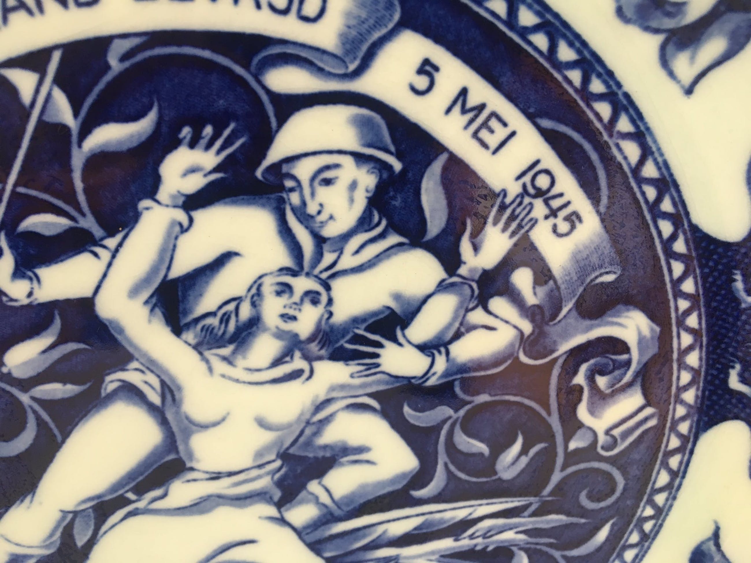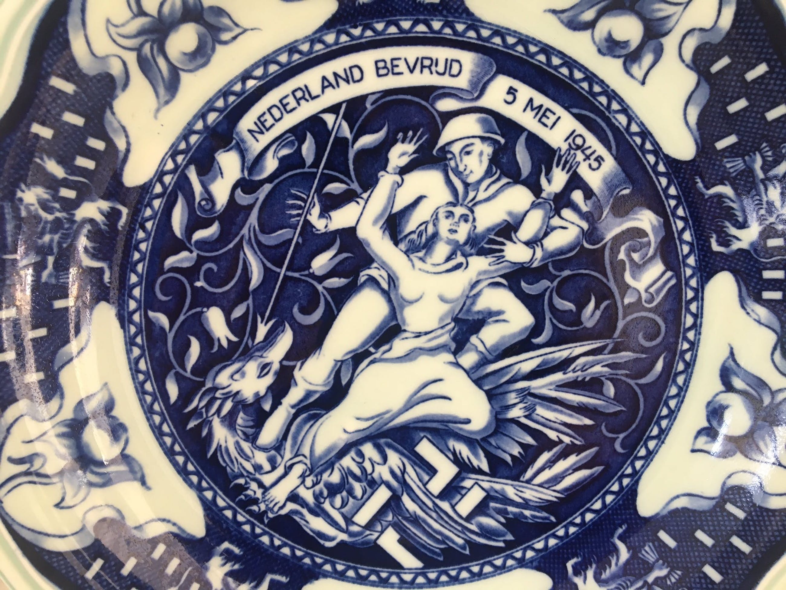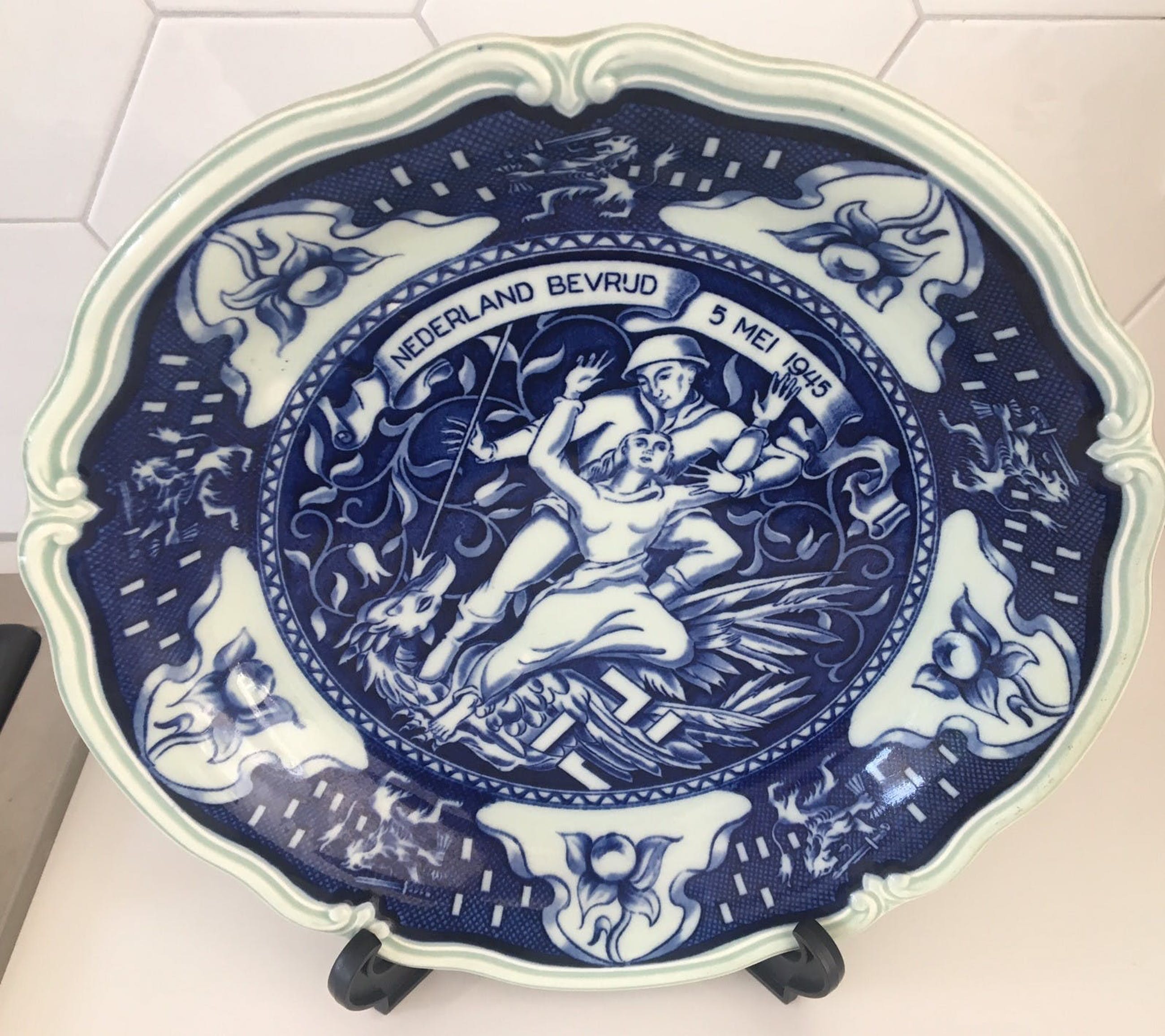 Goed uitgevoerd bord met een prachtig vormgegeven decor Uitgegeven ter ere van de bevrijding van Nederland (5 mei 1945) In uitstekende staat ø 33 cm +Een fraai sierbord met hierop afgebeeld een voorstelling van een oud Nederlands Marineschip de Je Mantiendrai, dit is tevens nog steeds de Nederlandse Wapenspreuk sinds 1815 en betekent : "Ik zal handhaven". Voorzien van de datering 1898-1923 en de teksten : "Recht door zee" en "Oranje boven" Conditie : puntgaaf! Diameter : ca. : 23 cm. Aan de achterzijde is een metalen draad bevestigd om het bord aan op te hangen (zie foto). Bord wordt met alle zorg ingepakt tegen beschadigen.
