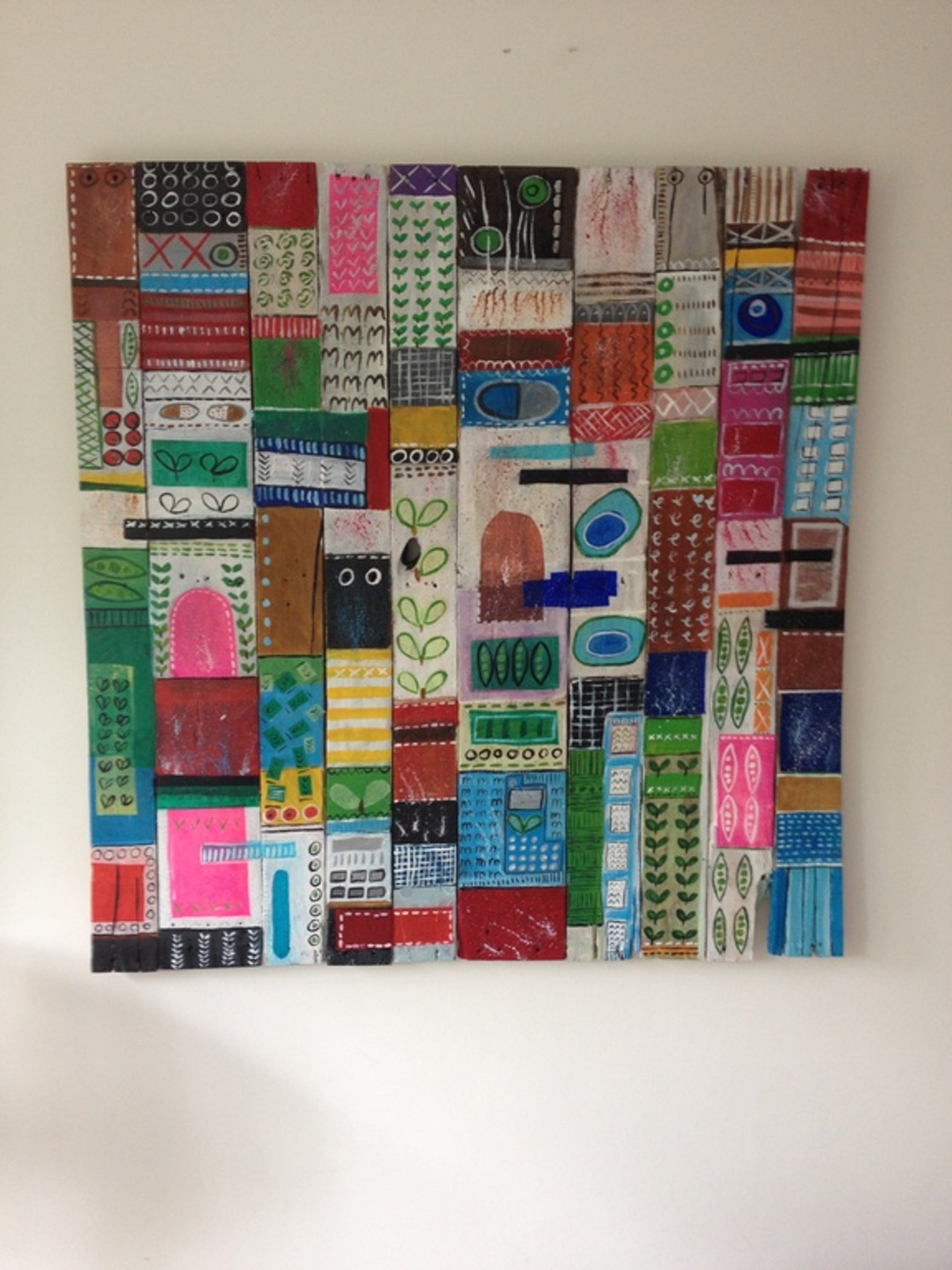 Abstract werk "Flat" gemaakt in 2015, acryl en papier op gerecycled pallethout. Afmeting 100x100cm.