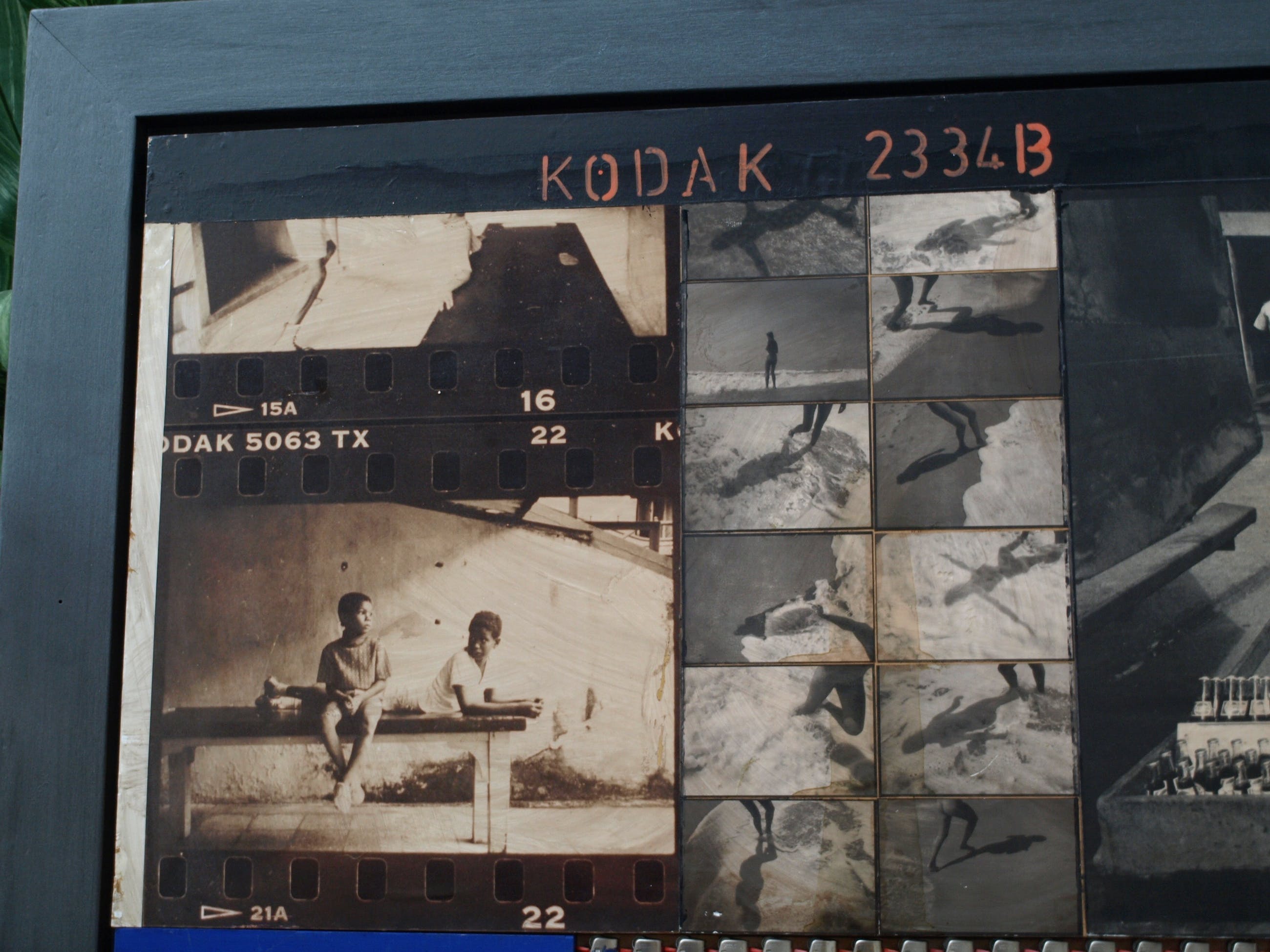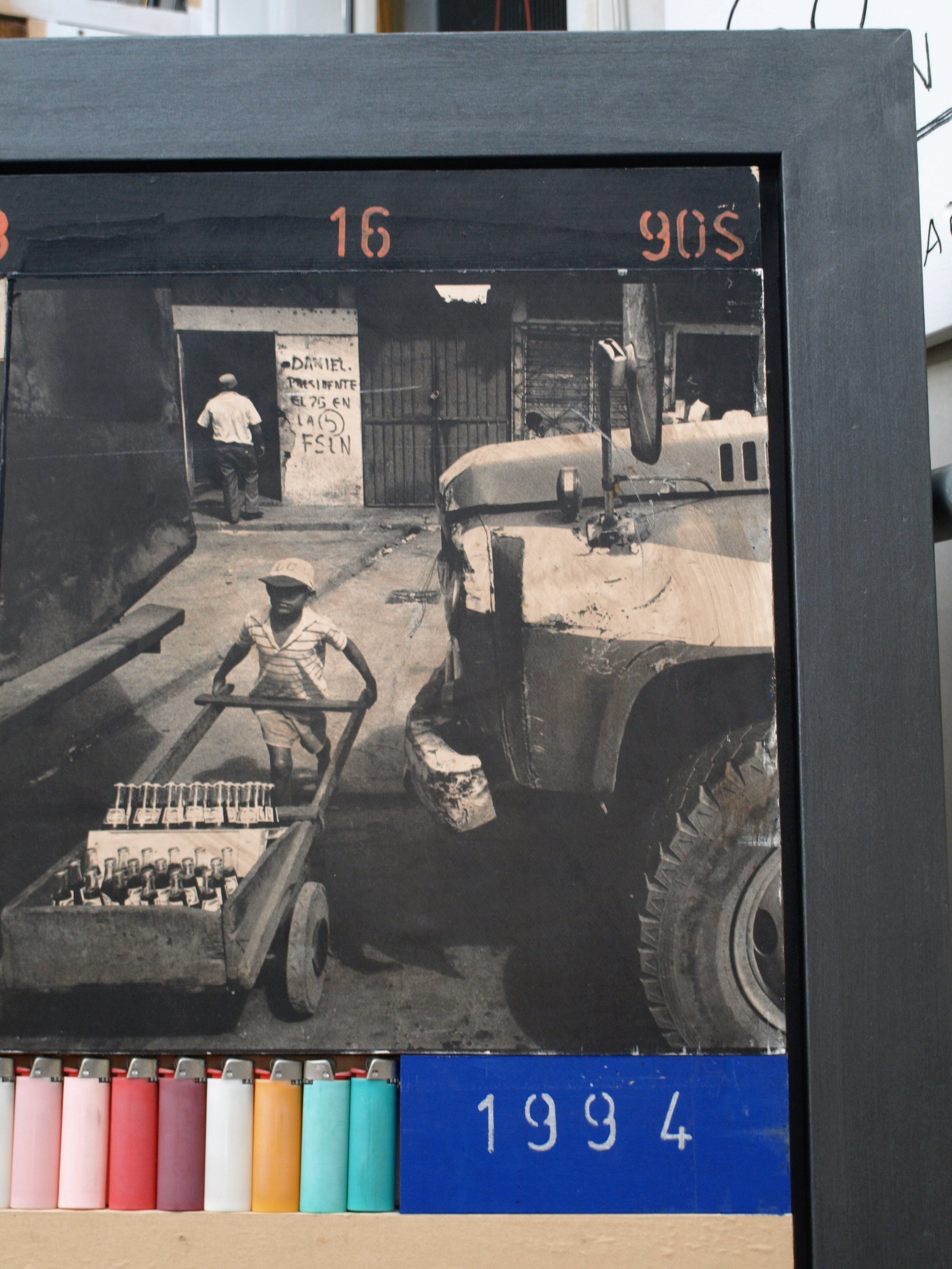 Een combinatie van fotografie, verf en voorwerpen (aanstekers). Vuur speelt een belangrijke rol bij de werken die Flavio Piras op Haïti maakte. Delen van het werk zijn dan ook ‘bewerkt’ met vuur (een aansteker).