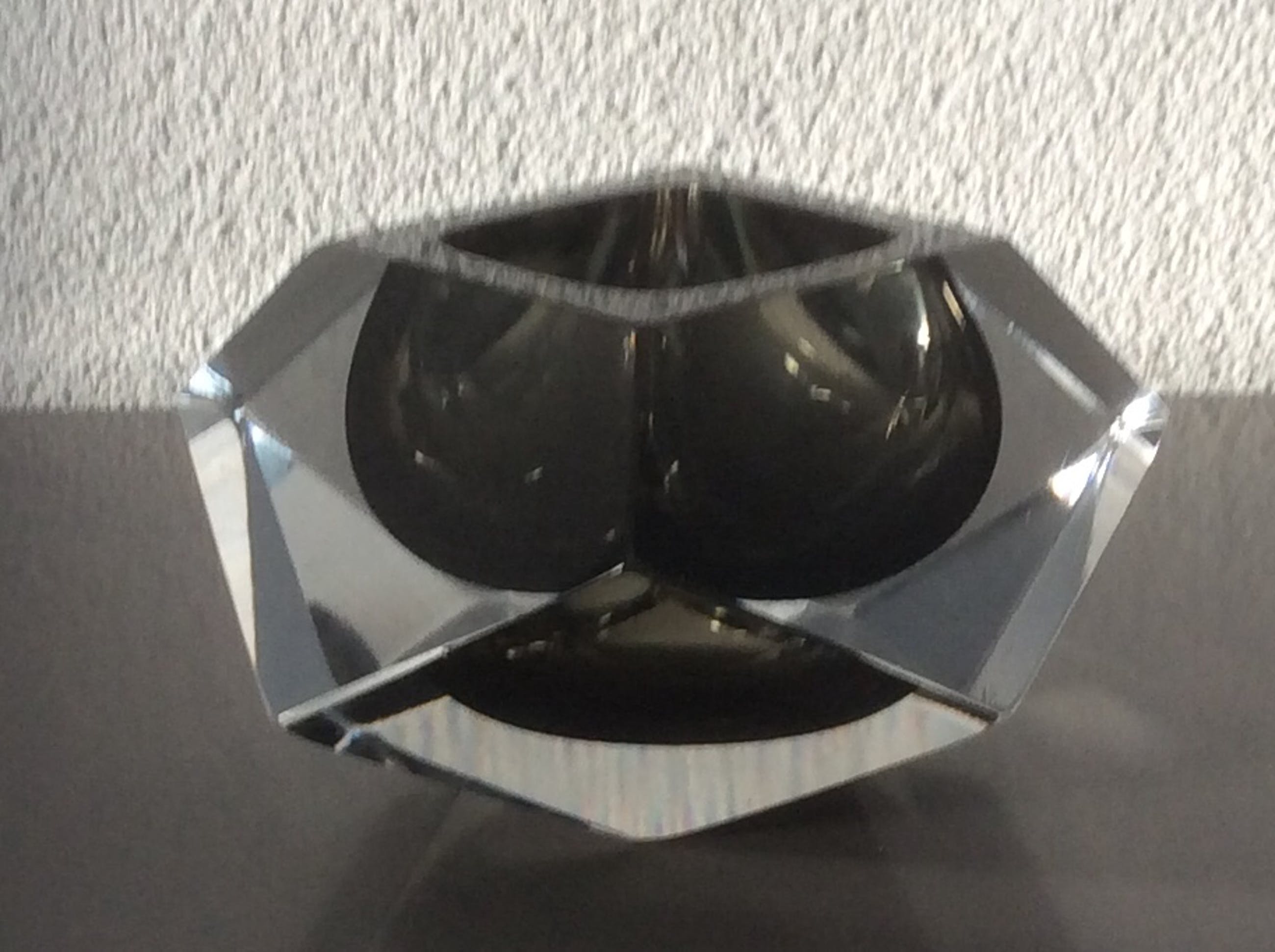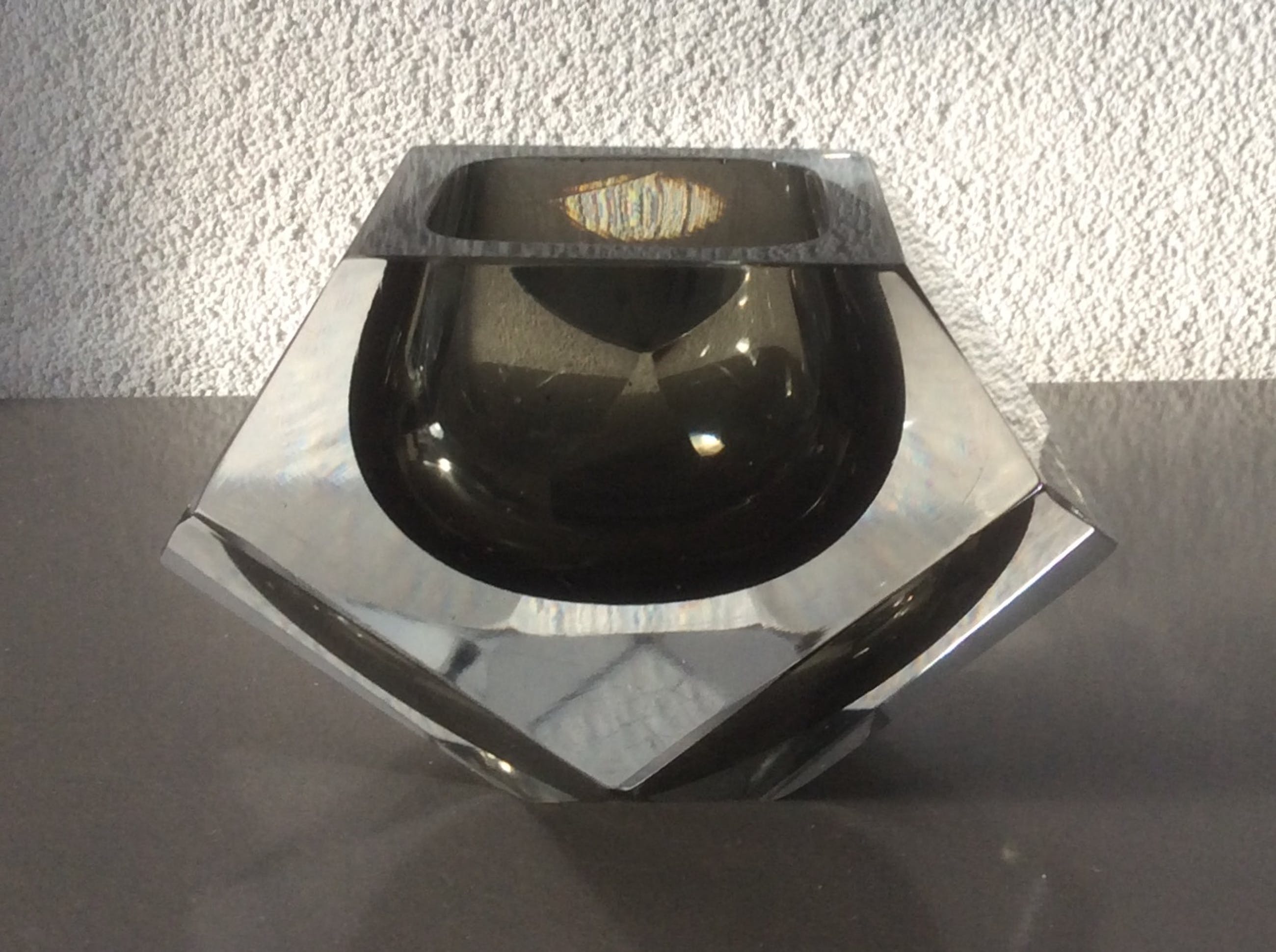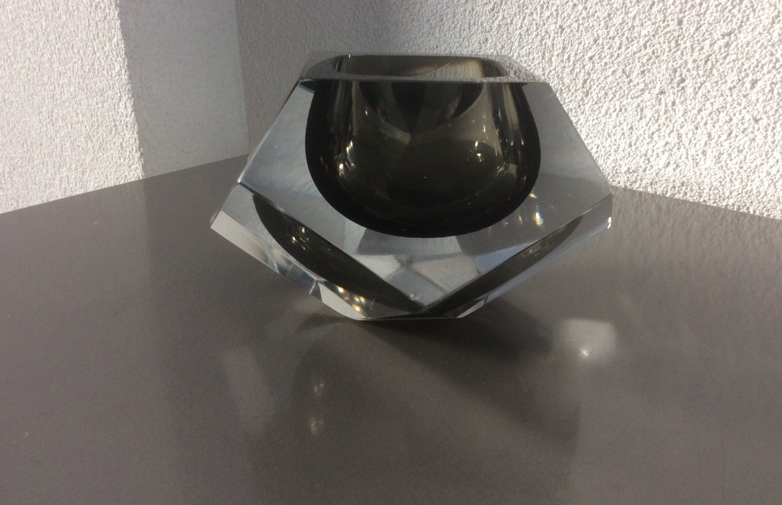 Een prachtig Summerso Murano glasobject van de Italiaanse kunstenaar Flavio Poli. Een bolle binnenkant van grijs rookglas en een heldere buitenkant met 12 facetten. Verklaring conditie: zie foto’s.